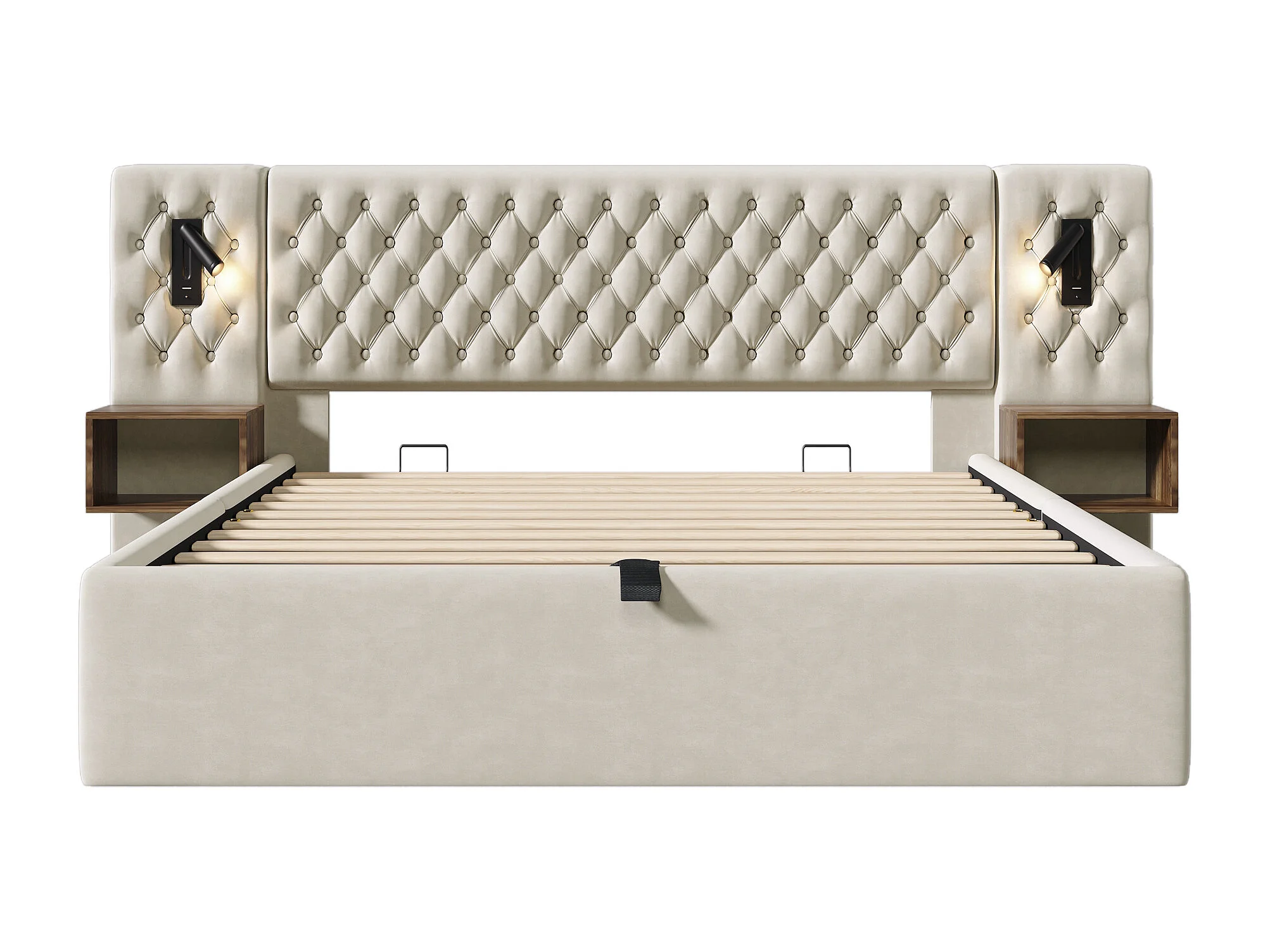 Lit coffre 180x200 cm - Lit double avec table de chevet, lampe de lecture et port USB - velours beige - sans matelas