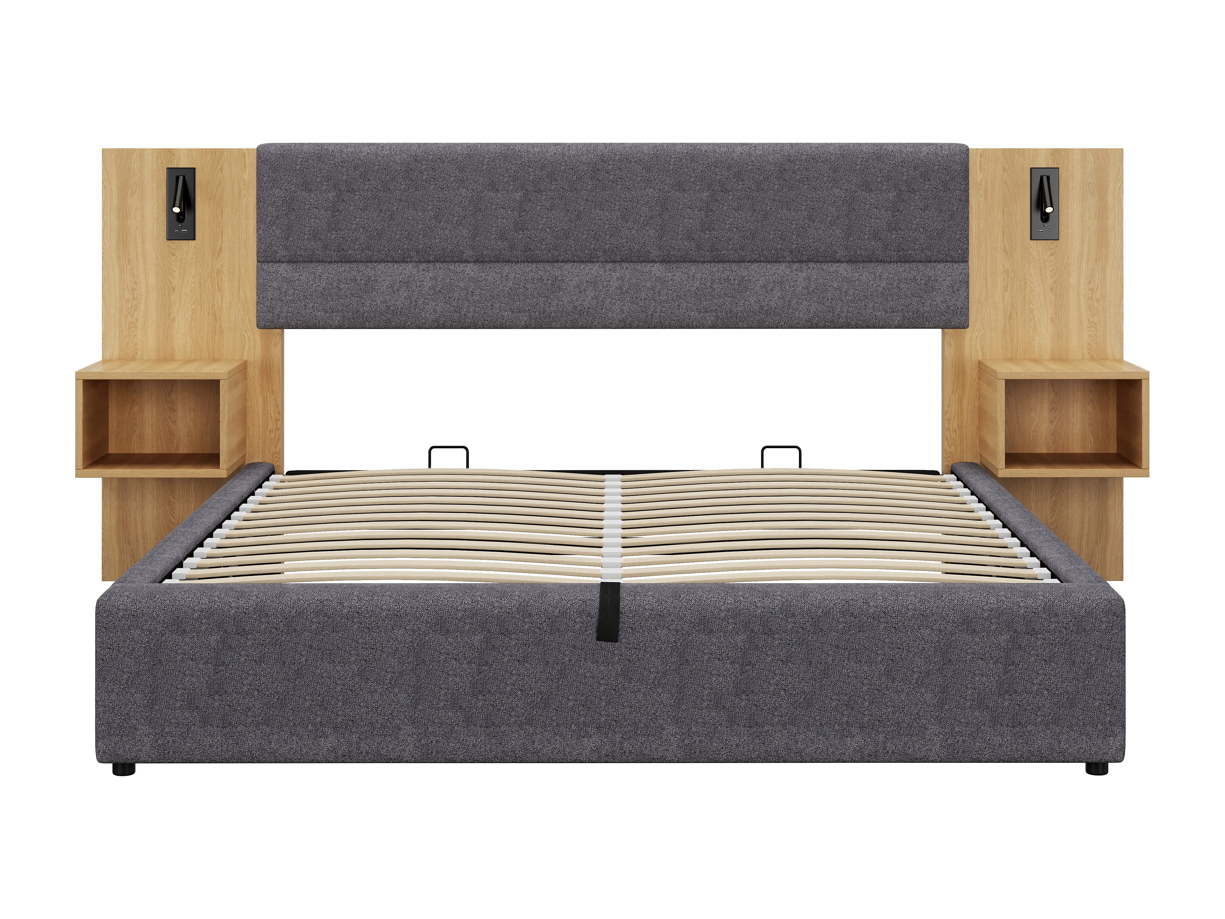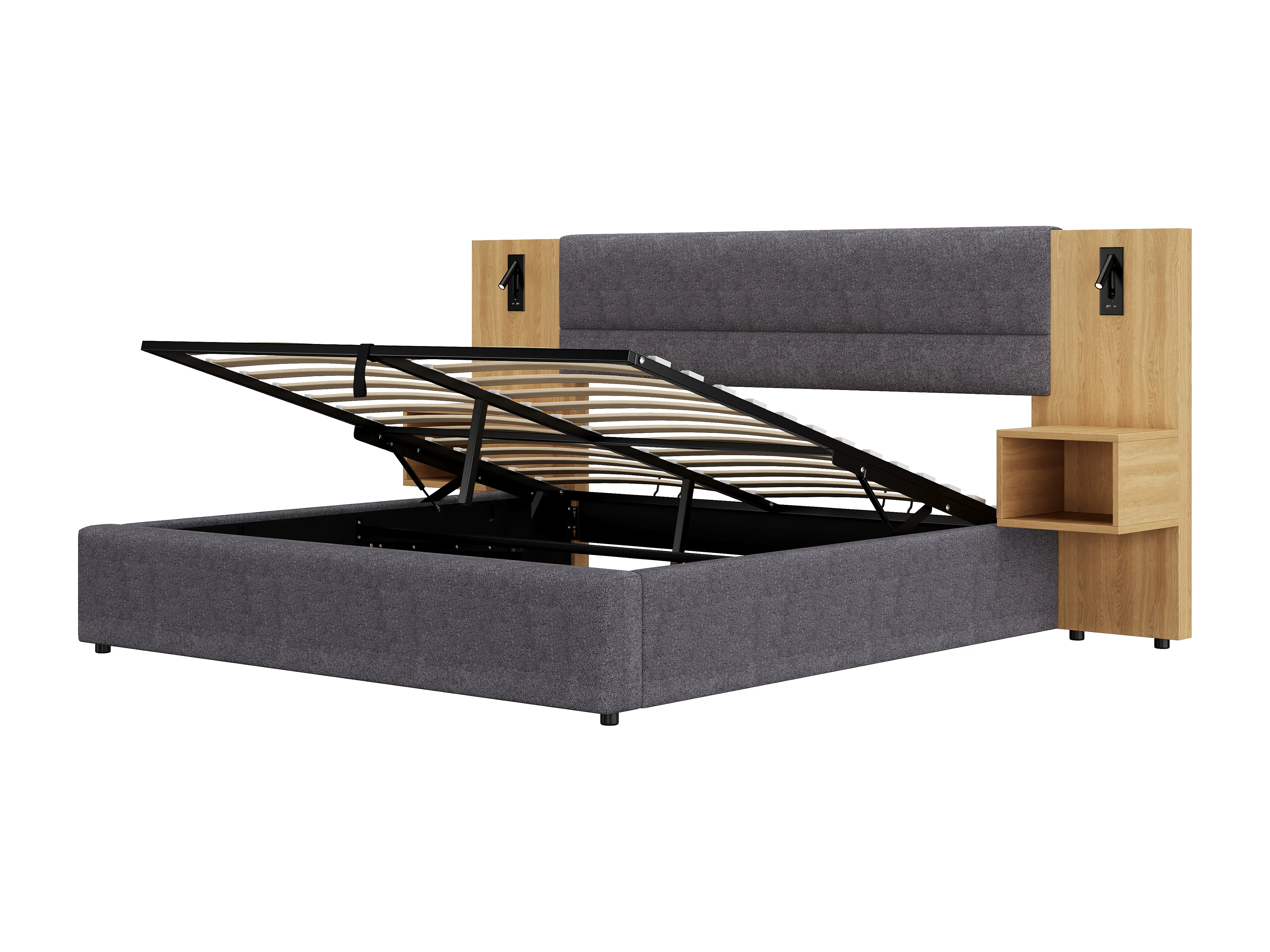 Lit coffre 180x200 cm, port USB et éclairage, chevet avec rangement, velours, gris et naturel, sans matelas