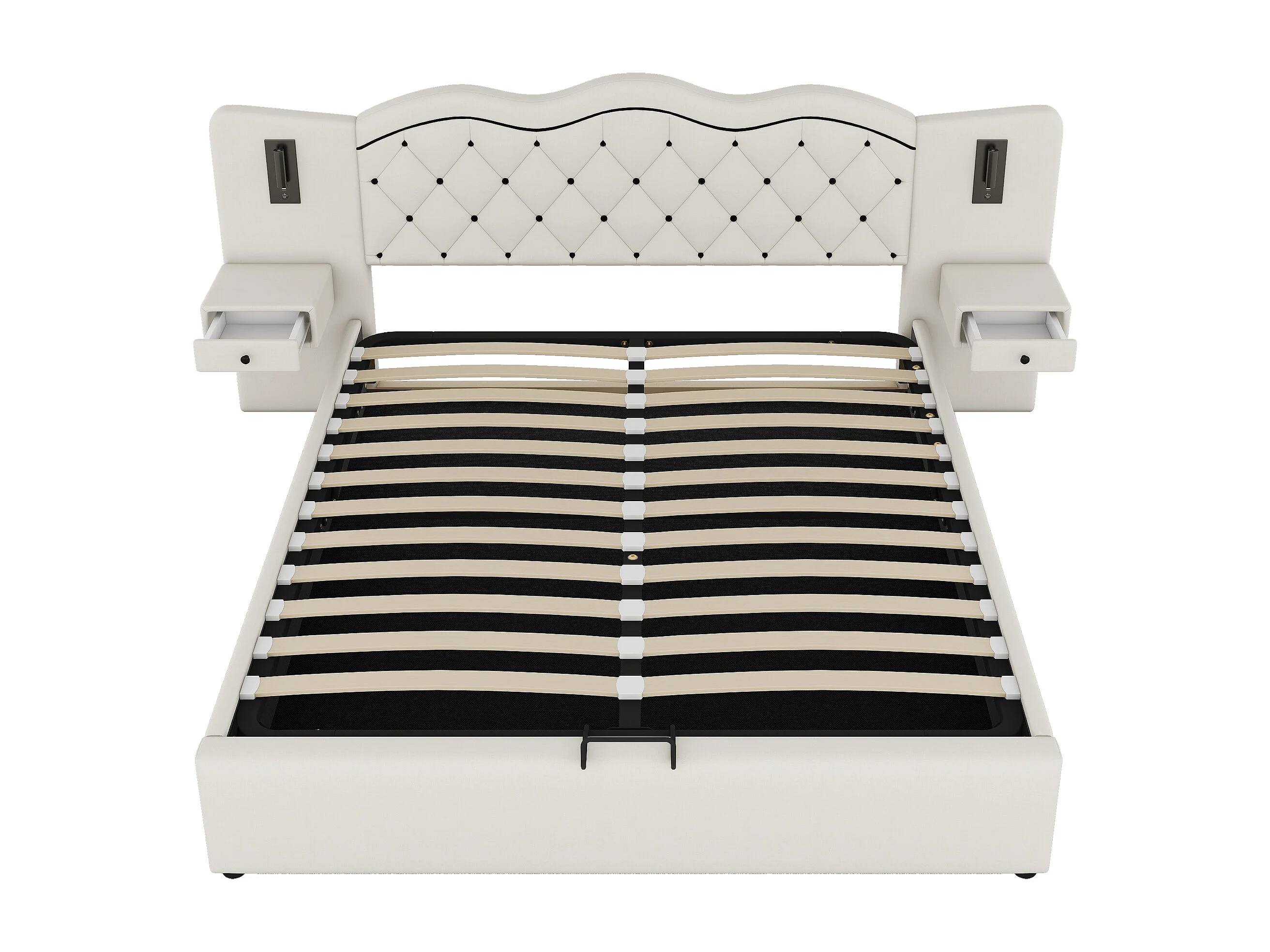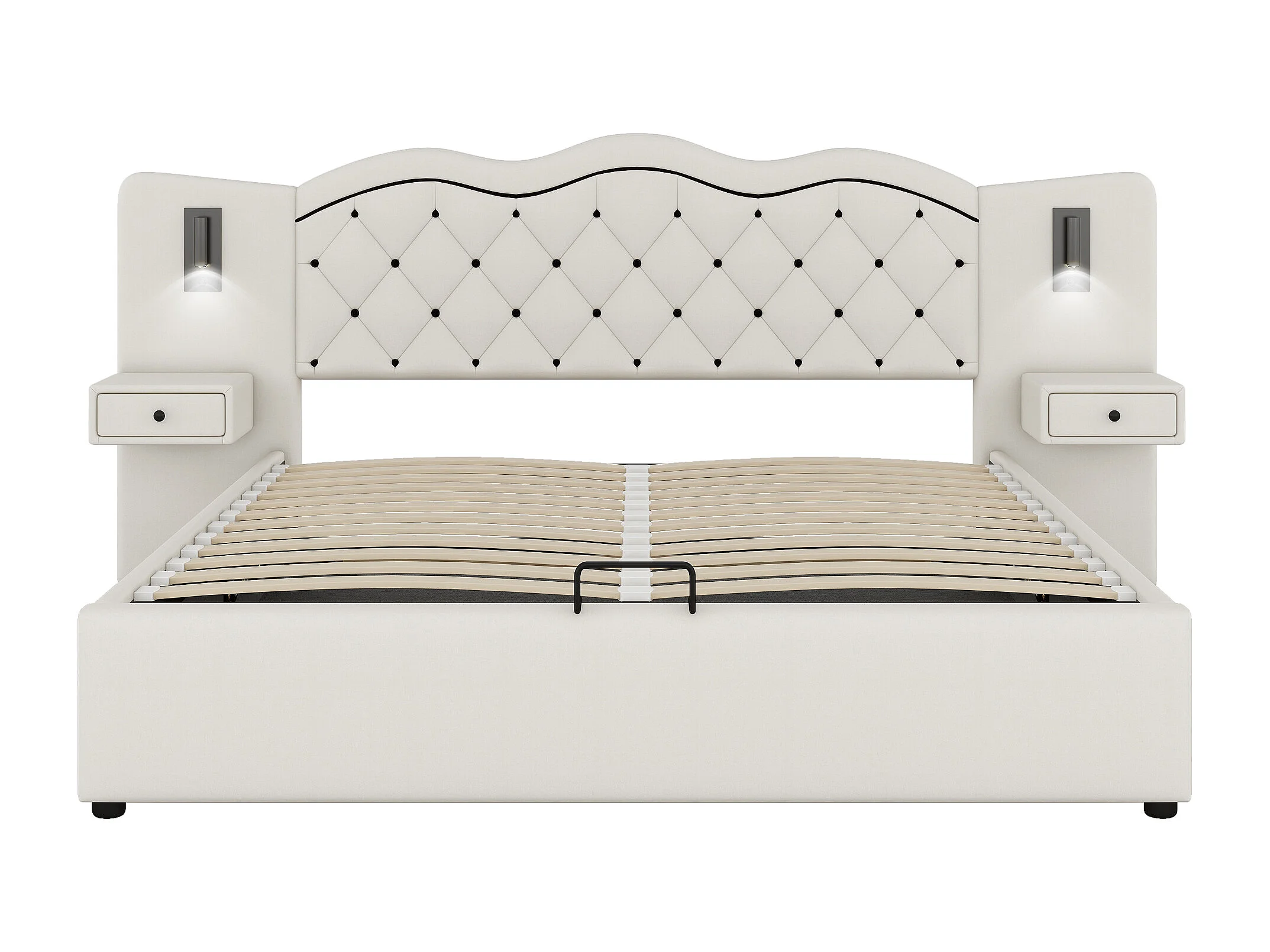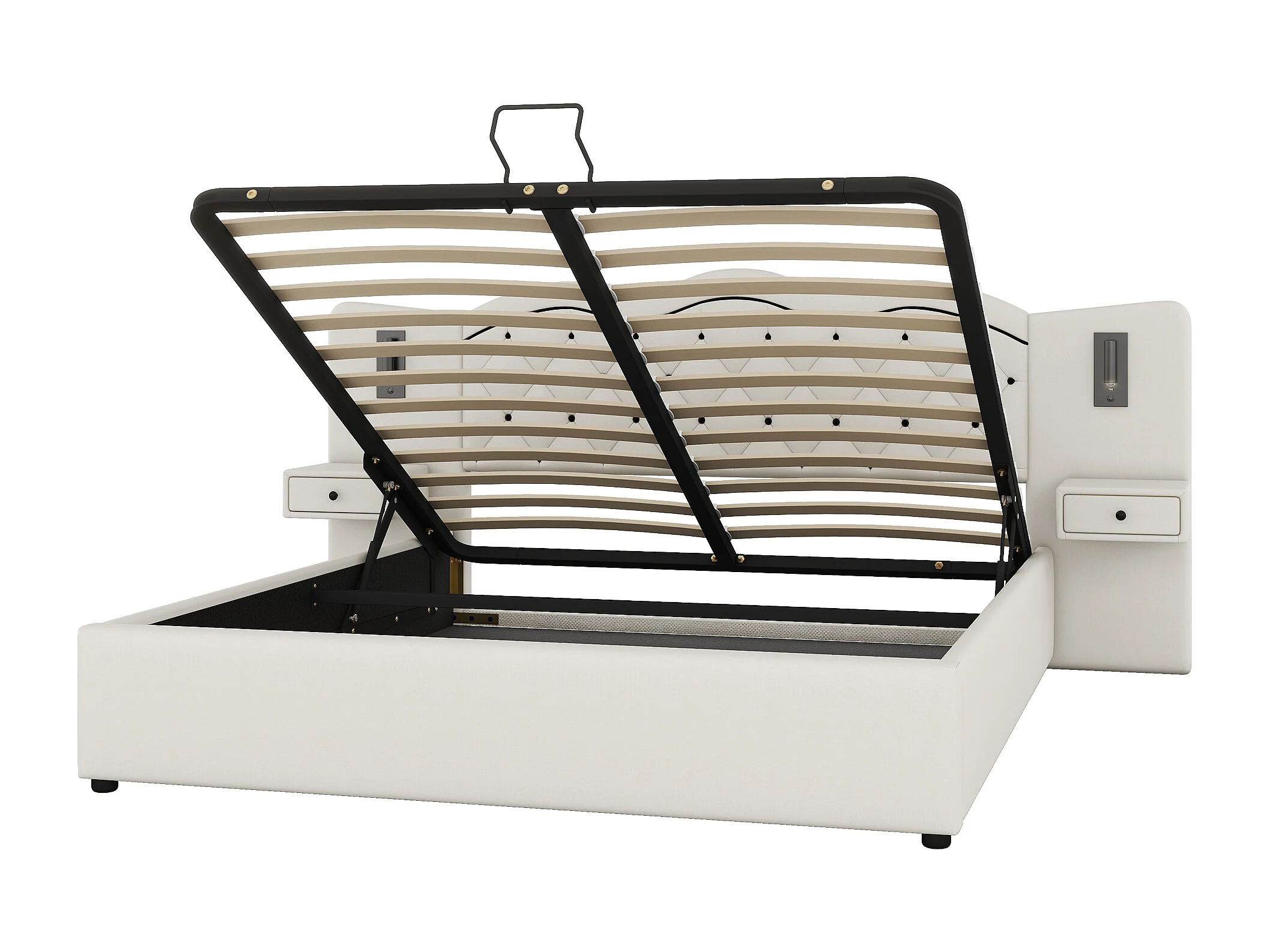Lit adulte 180x200 cm avec tête de lit intégrée et rangements intégrés, levage hydraulique et prises USB, revêtement en lin, beige (Sans matelas)