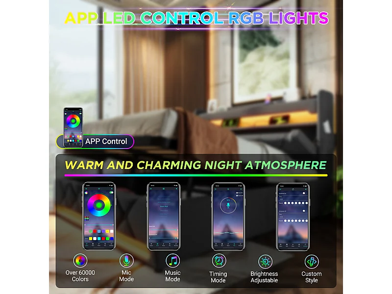 Lit coffre 180x200cm avec tête de lit capitonnée, LED, USB et port de type C - Lin - Gris