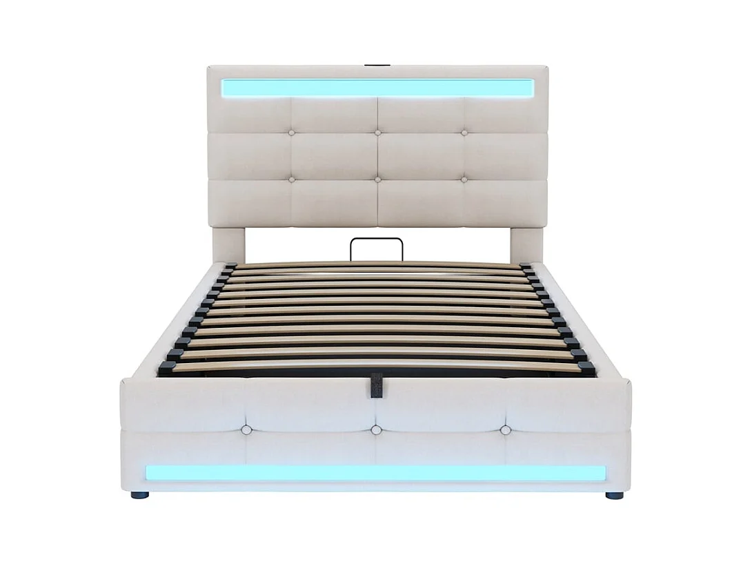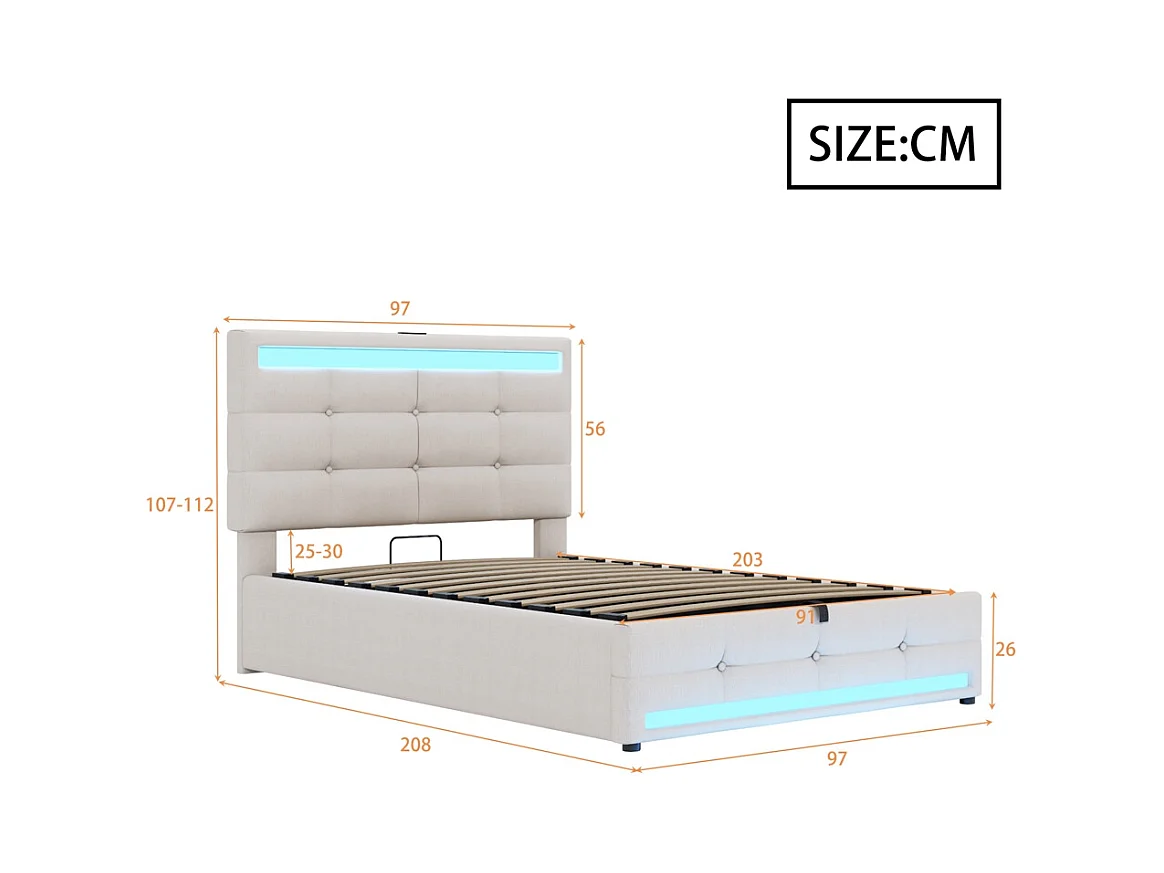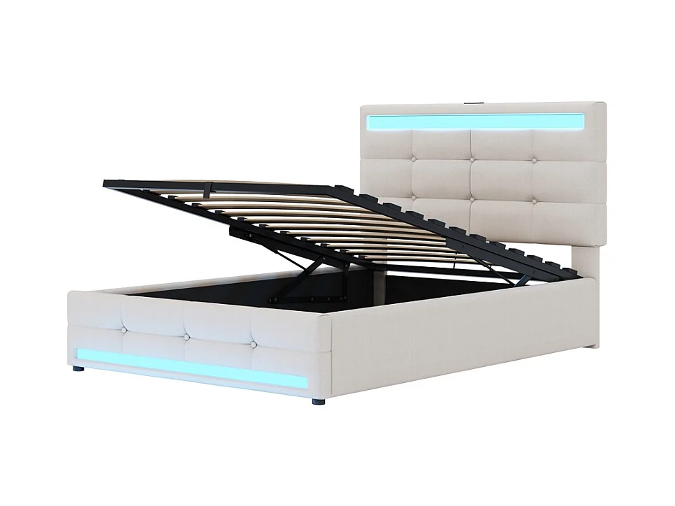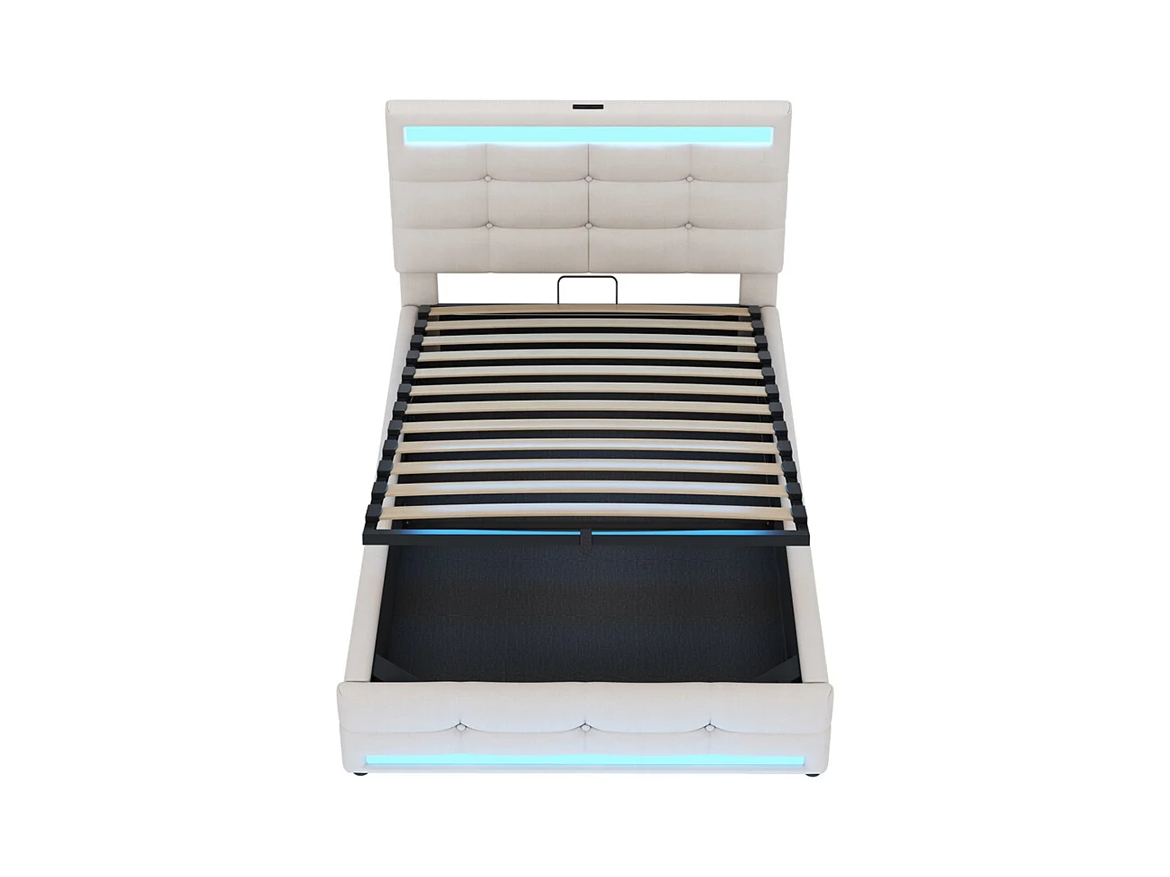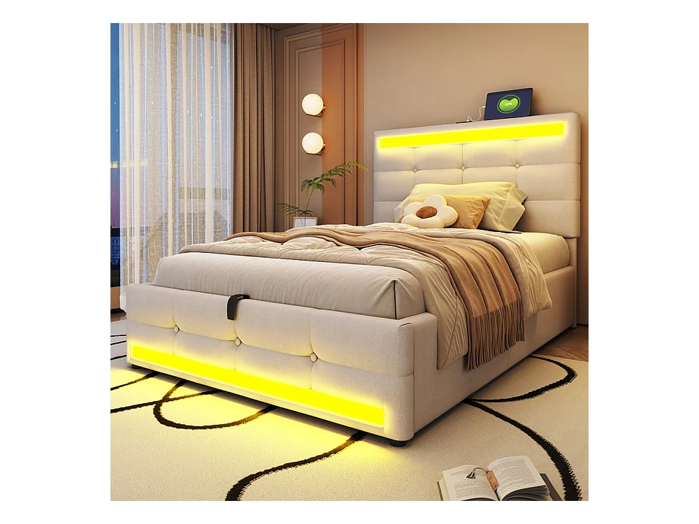 Lit coffre 90*200 cm, avec port USB et bande LED à couleur variable, beige, lin