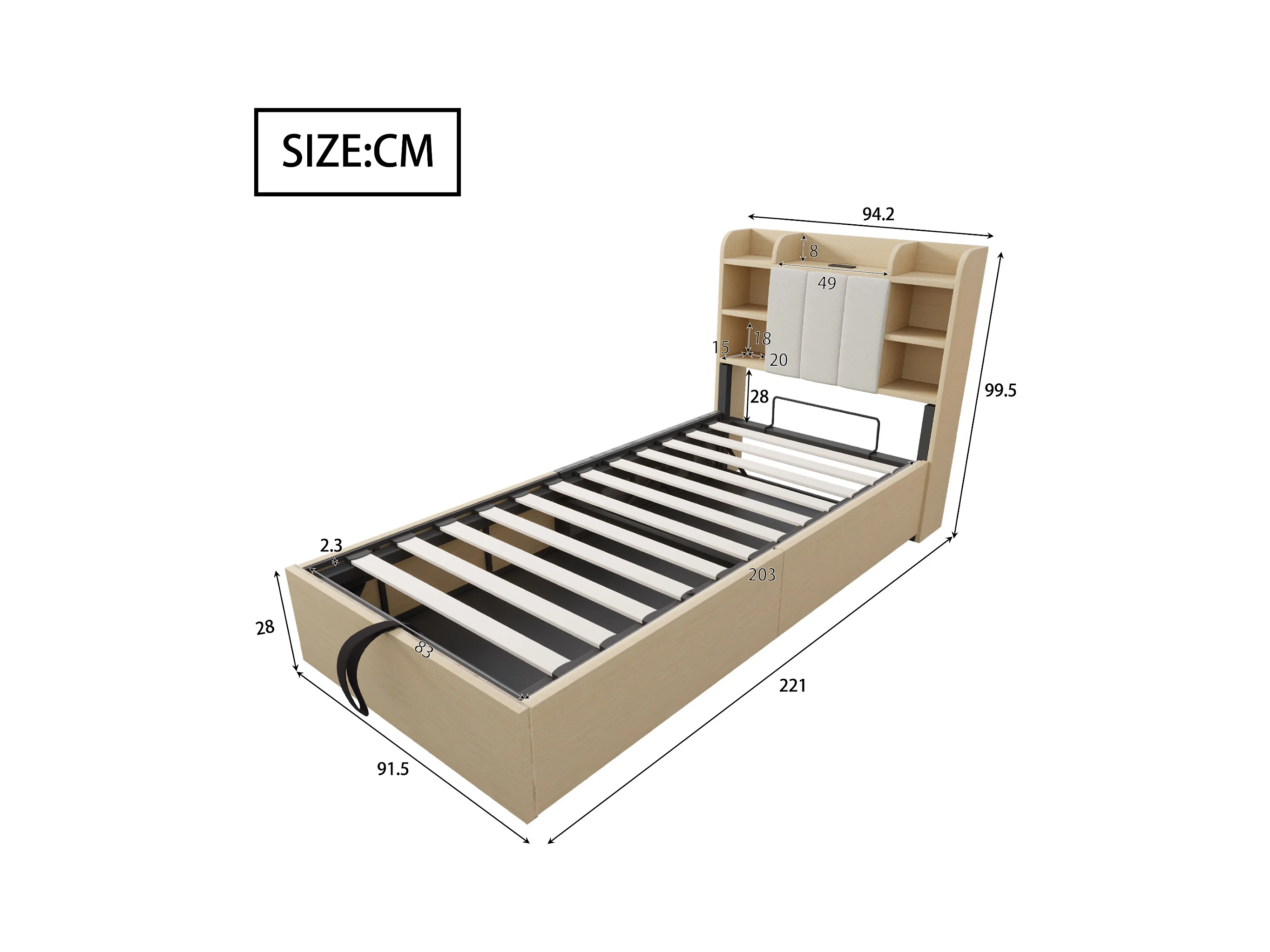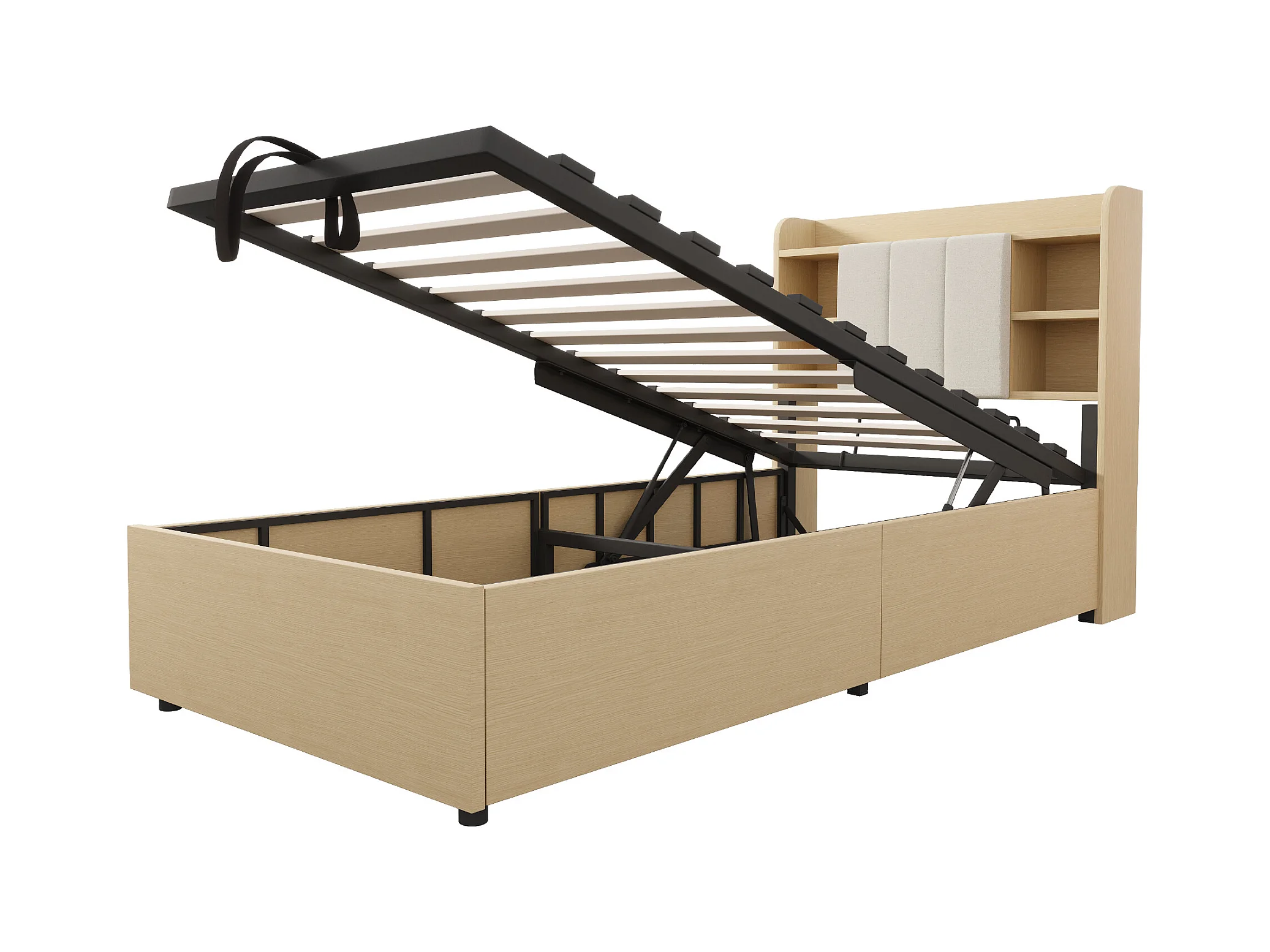 Lit coffre simple naturel 90x200cm avec USB et Type-C, tête de lit avec rangement, sans matelas
