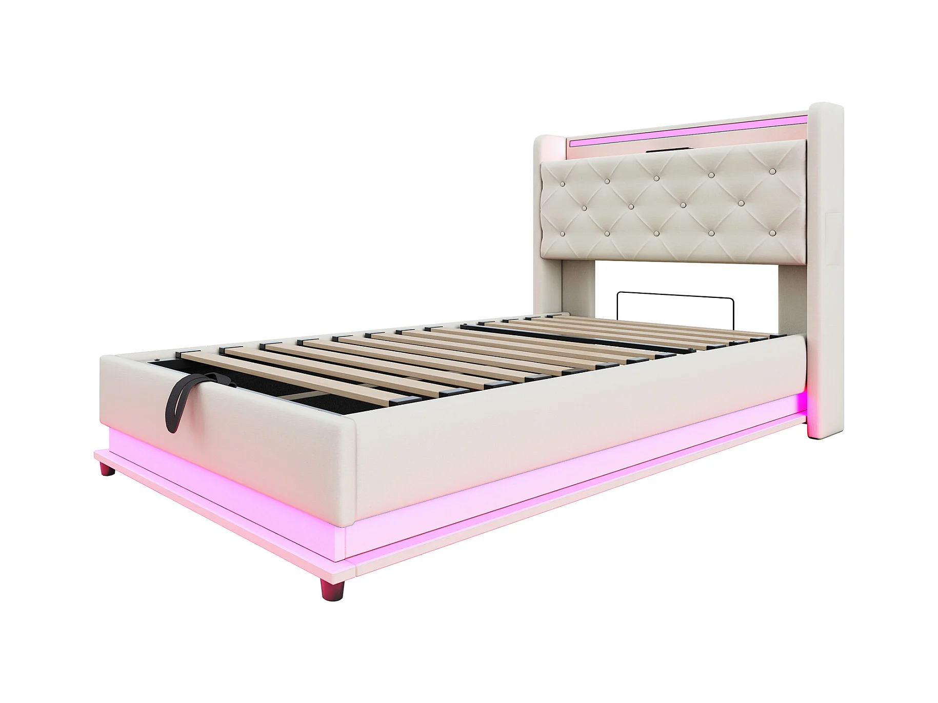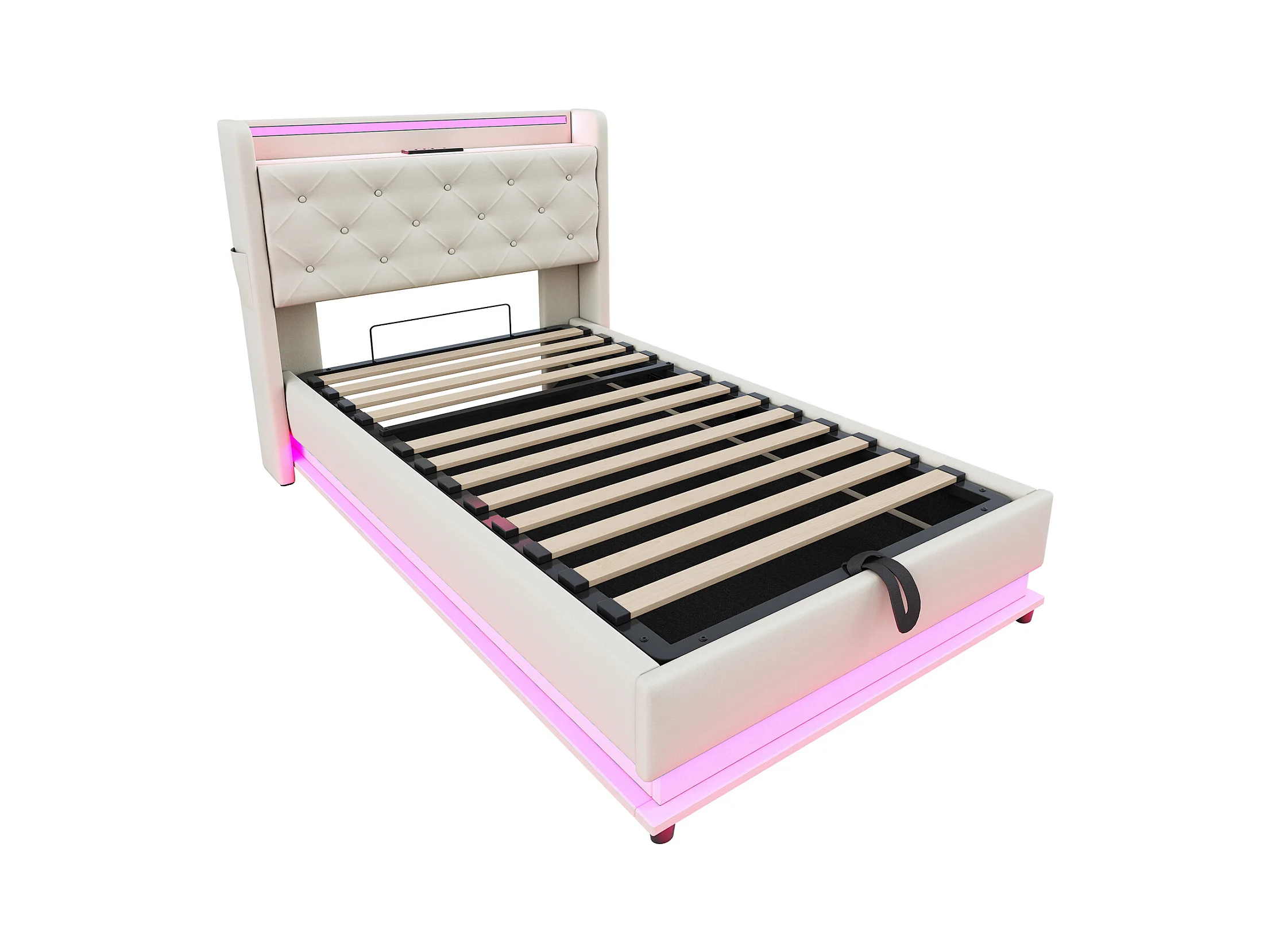 Lit coffre 90x200 cm avec port USB et LED, tête de lit coffre, lin beige - sans matelas
