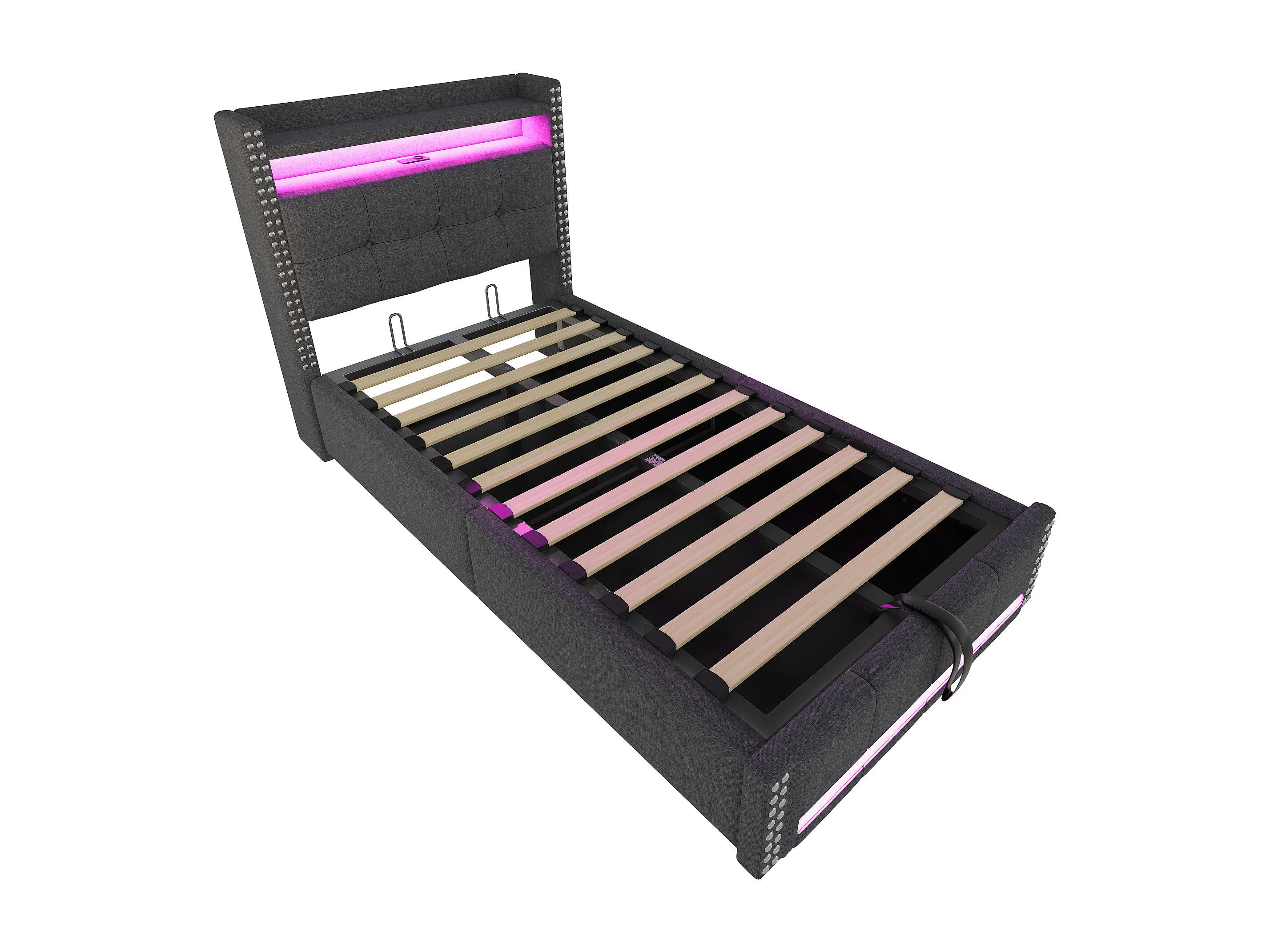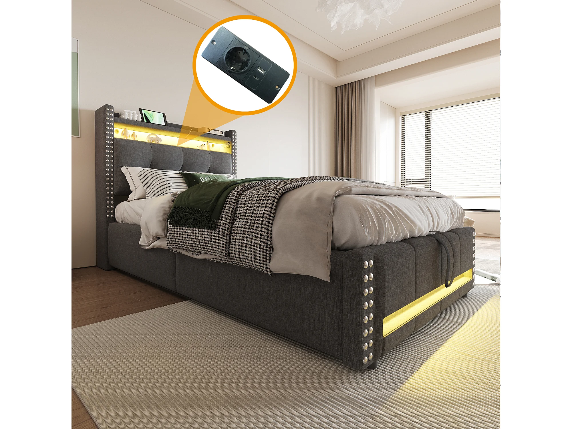 Lit coffre 90x200 cm - Lin gris - Lit enfant avec éclairage LED et prises USB - sans matelas