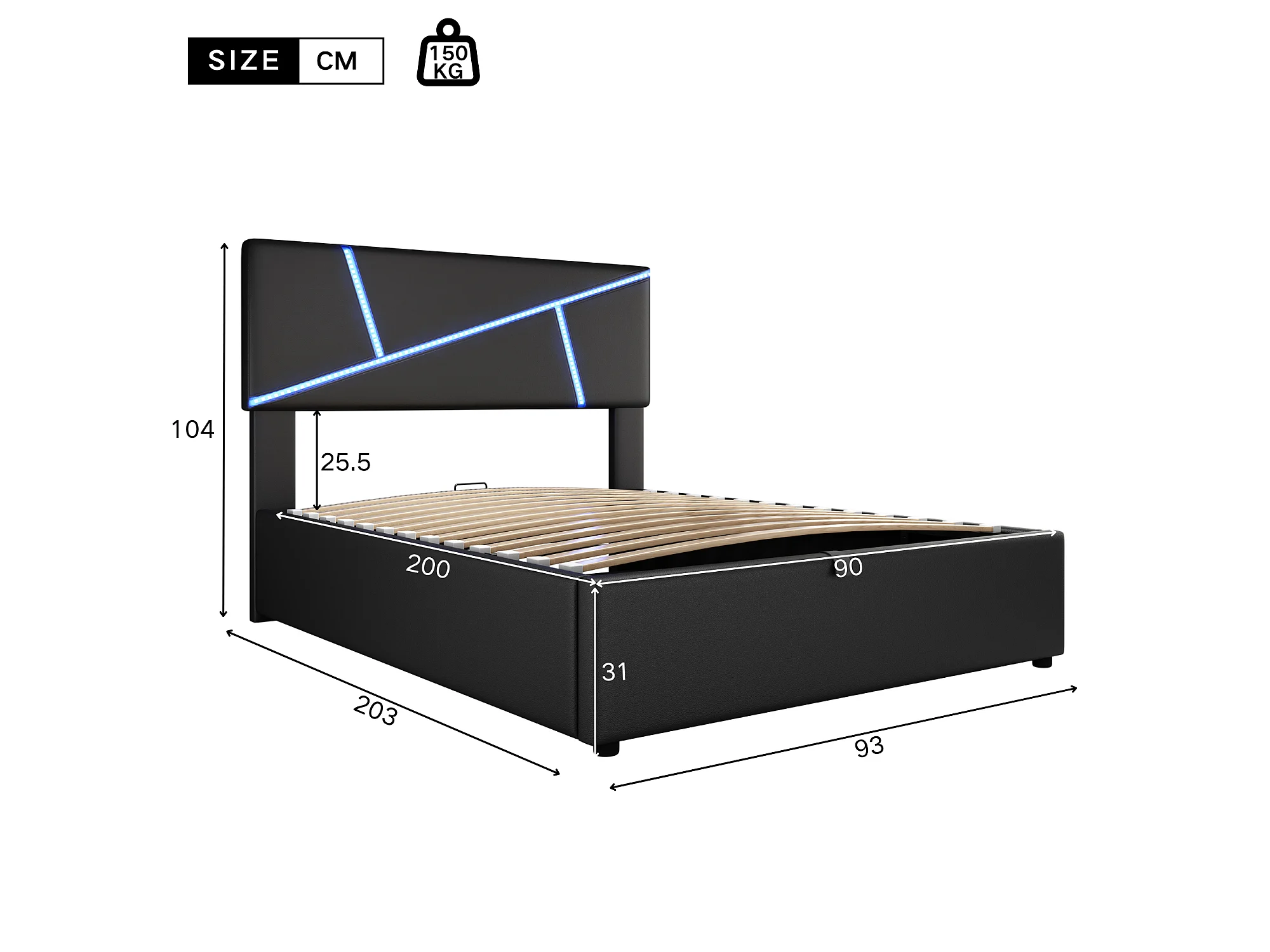 Lit coffre 90x200cm en similicuir - avec LED et sommier à lattes - Noir