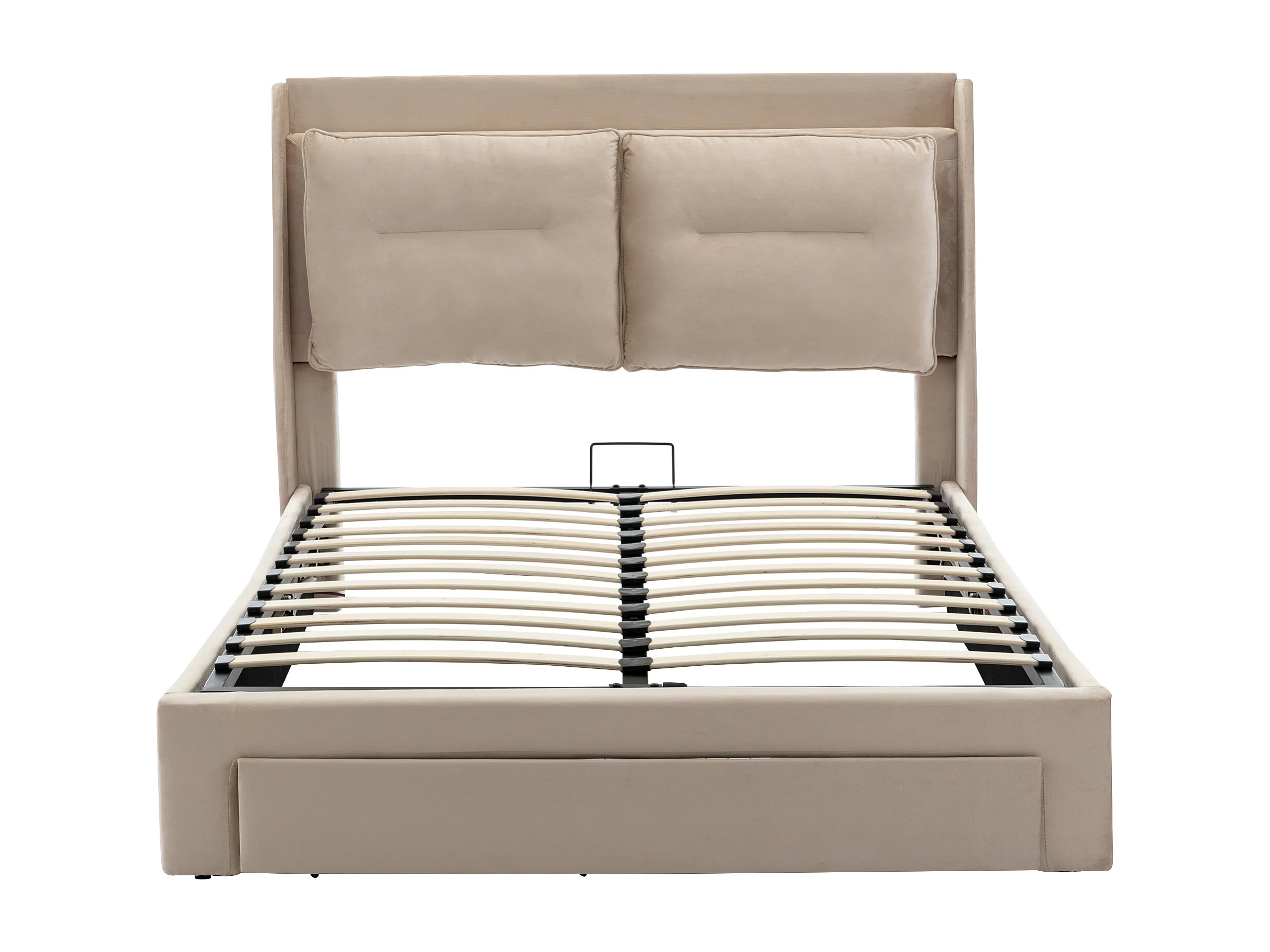 Lit coffre 140x190 cm, lit double en velours beige, sommier à vérins, grand espace de rangement, tête rembourrée, lumière LED, design moderne