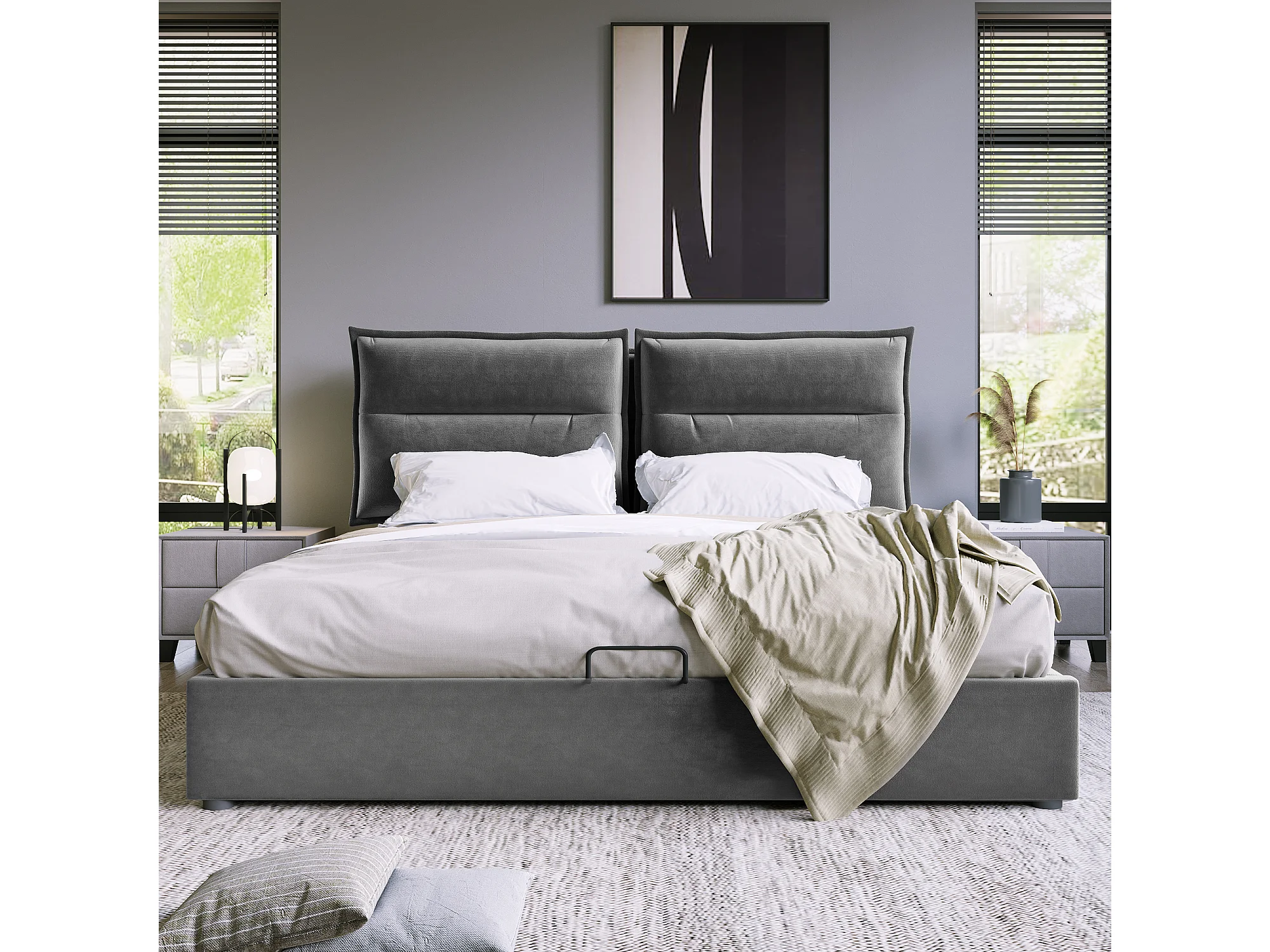 Lit coffre 140x200 cm avec sommier à lattes - tête de lit réglable en hauteur - velours gris (sans matelas)