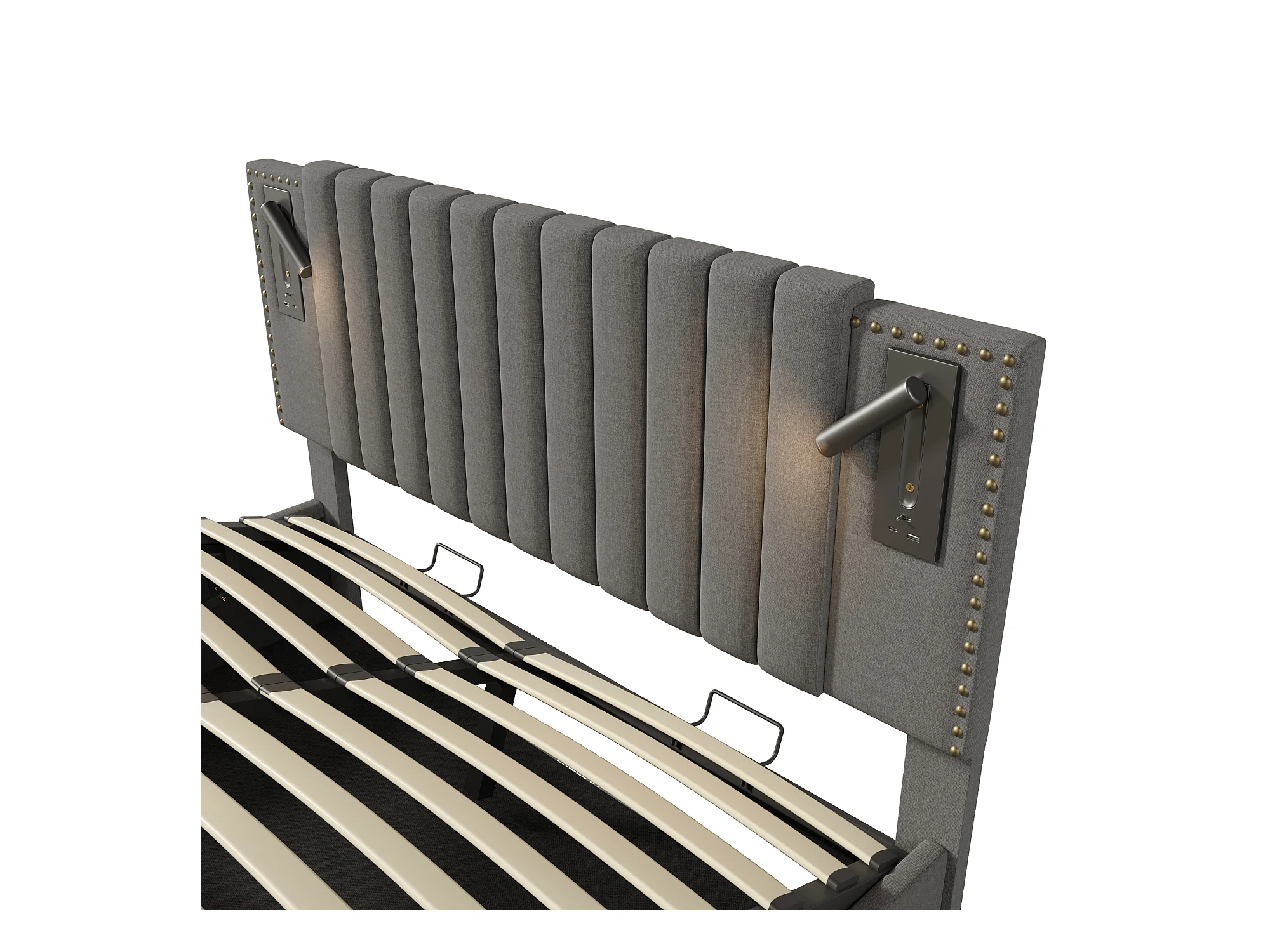 Lit coffre adulte 140x200 cm avec sommier - tête de lit avec USB et lumière de lecture - coton - gris (sans matelas)