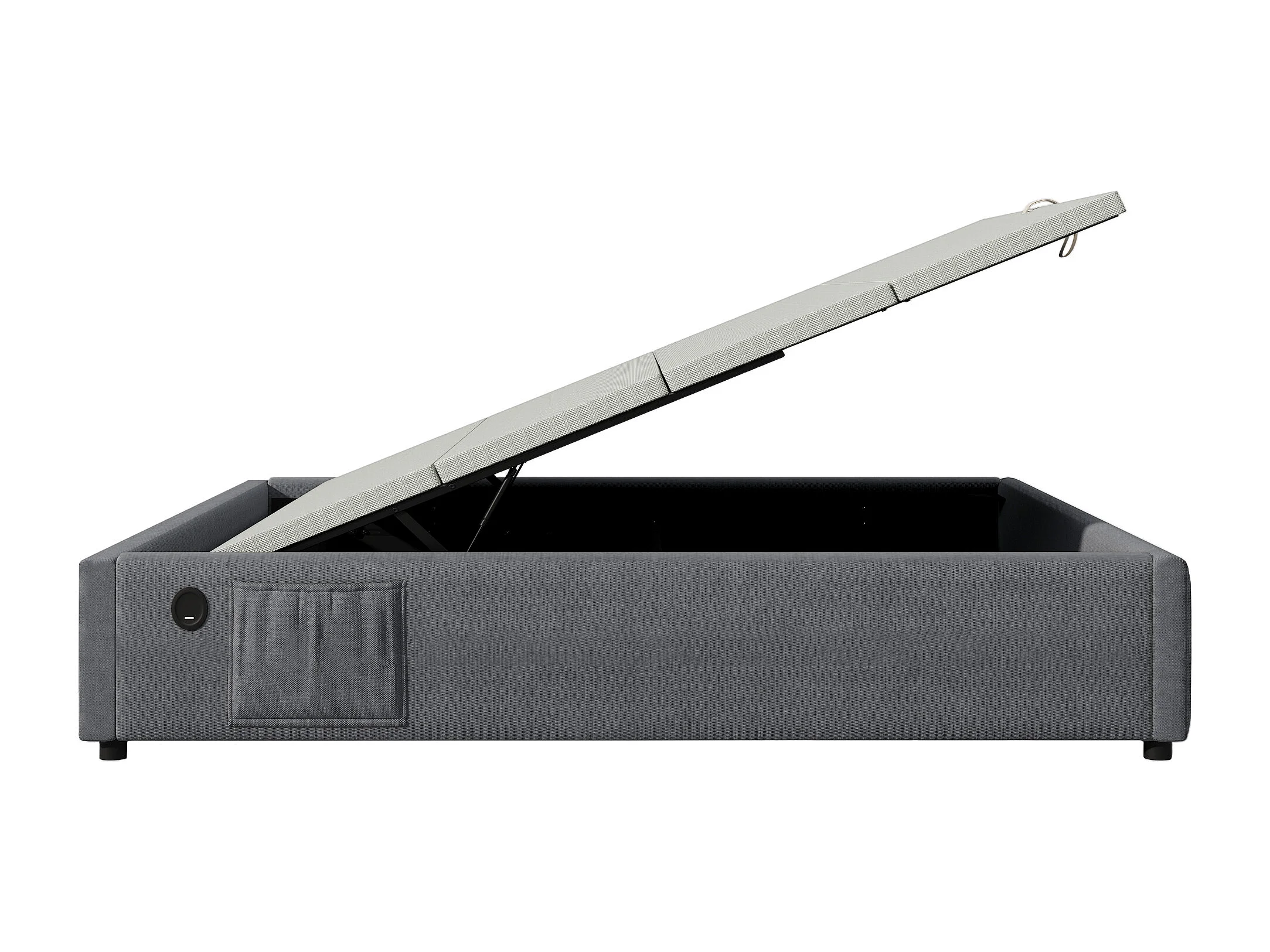 Lit coffre 140x200 cm sans tête de lit - avec USB et rangement latéral - lin gris (sans matelas)