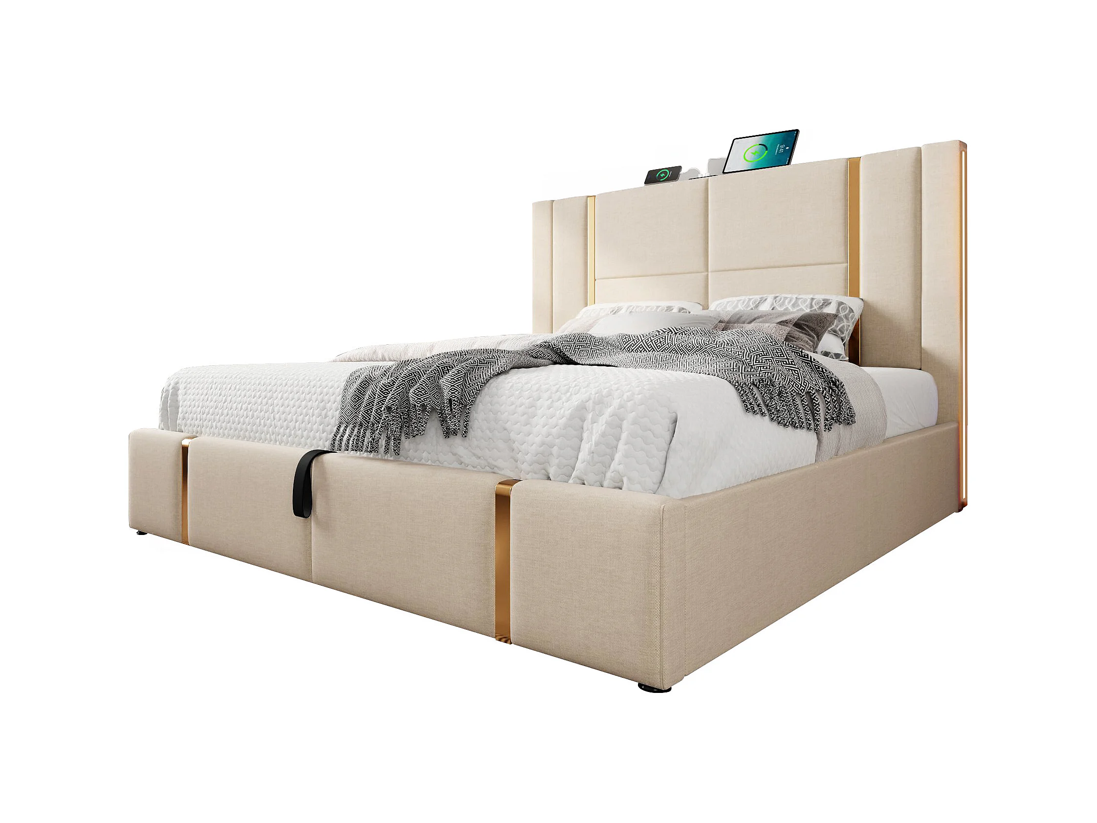 Lit coffre 160x200 cm avec sommier - tête de lit avec USB et lumière de lecture - coton - beige (sans matelas)