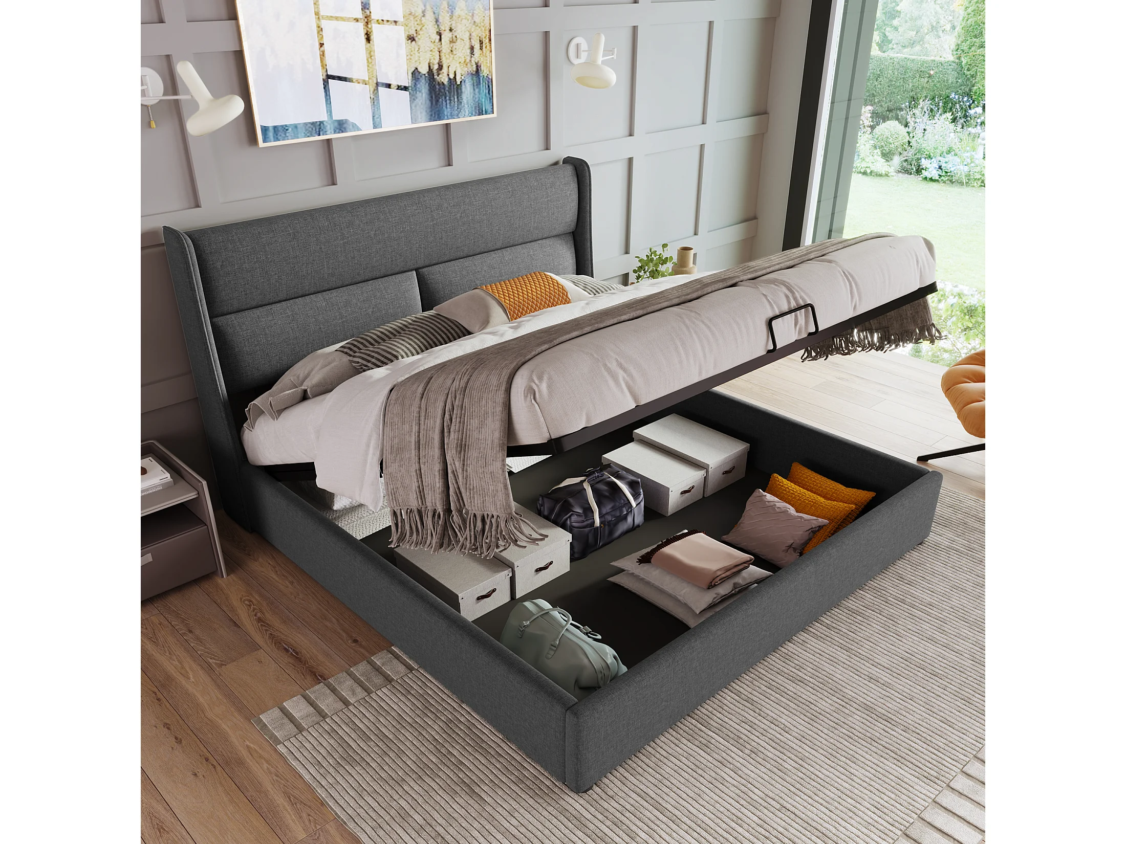 Lit coffre 160x200 cm avec sommier - tête de lit rembourrée avec appui-tête réglable - lin gris (sans matelas)