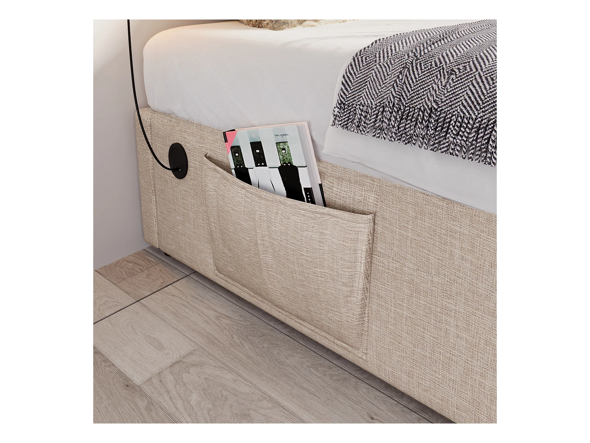 Lit coffre 160 x 200 cm - Lit enfant avec port USB et poche de rangement - lin beige - sans matelas