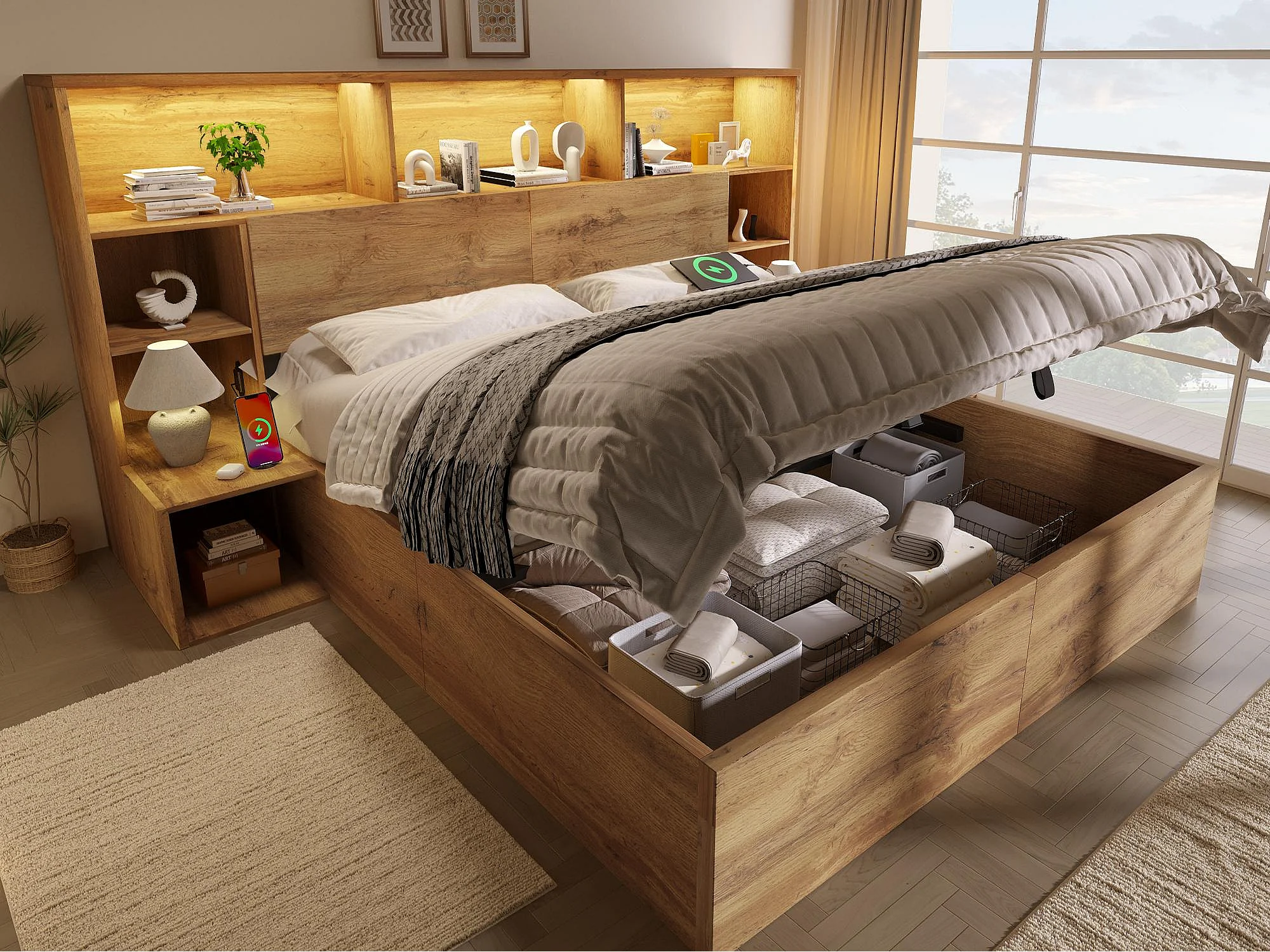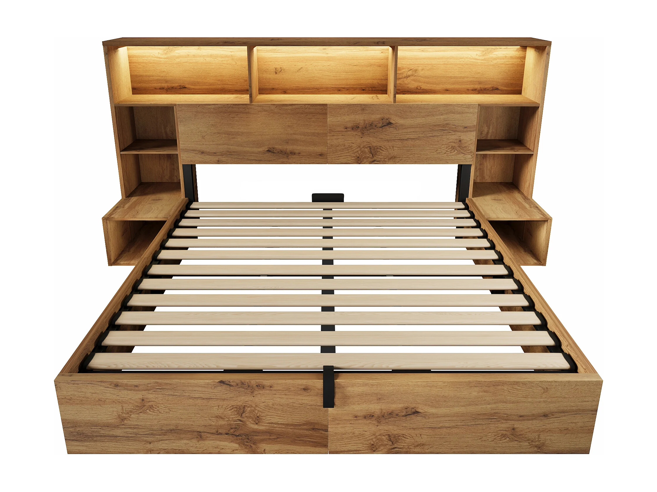 Lit coffre adulte 160x200cm à texture chêne - avec lumière LED et port USB-C - avec table de chevet intégrée - avec étagère - couleur chêne
