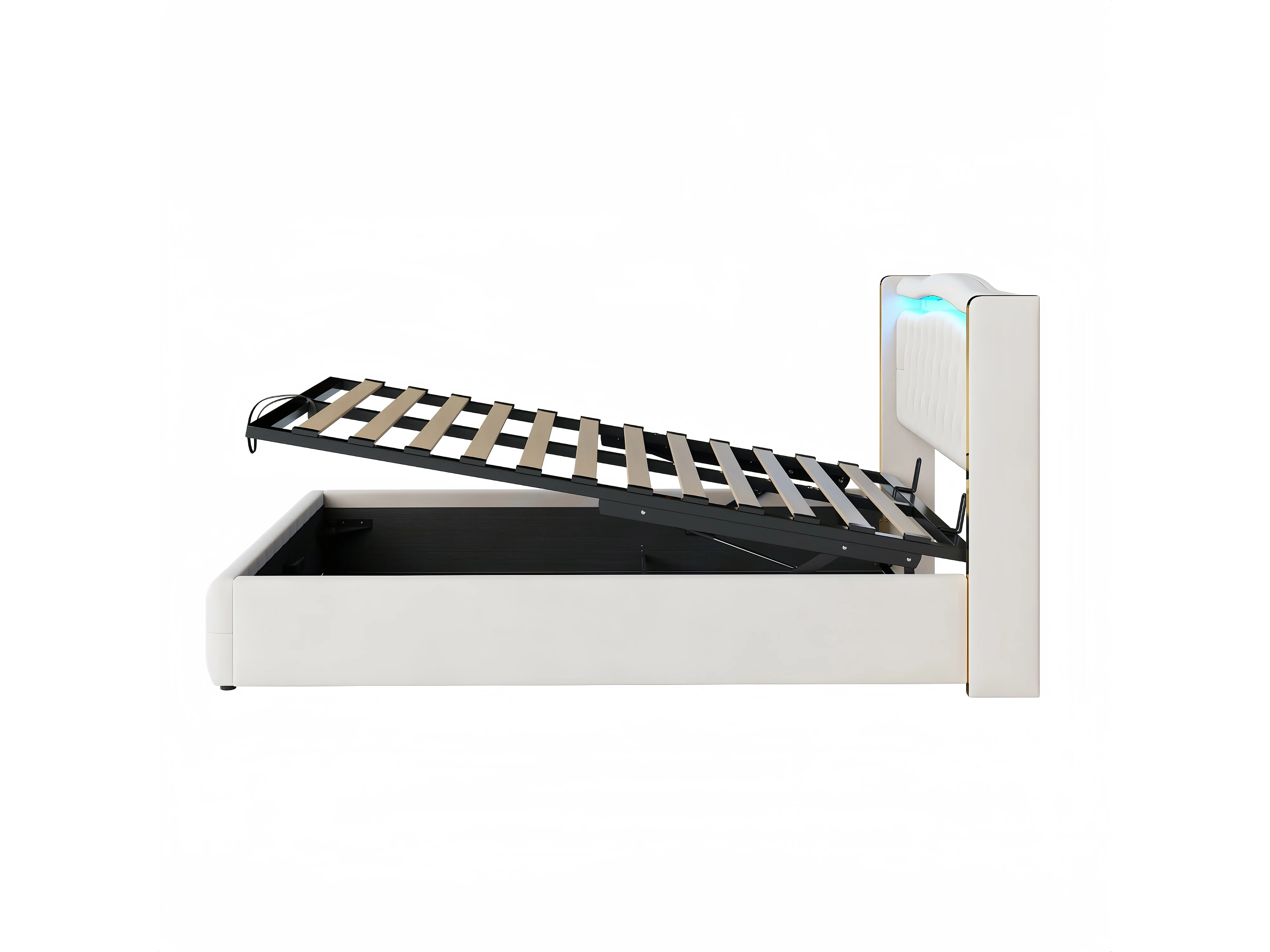 Lit coffre adulte 160x200cm beige en velours avec 2 lampe de lecture + LED + USB, Sommier à lattes, sans matelas
