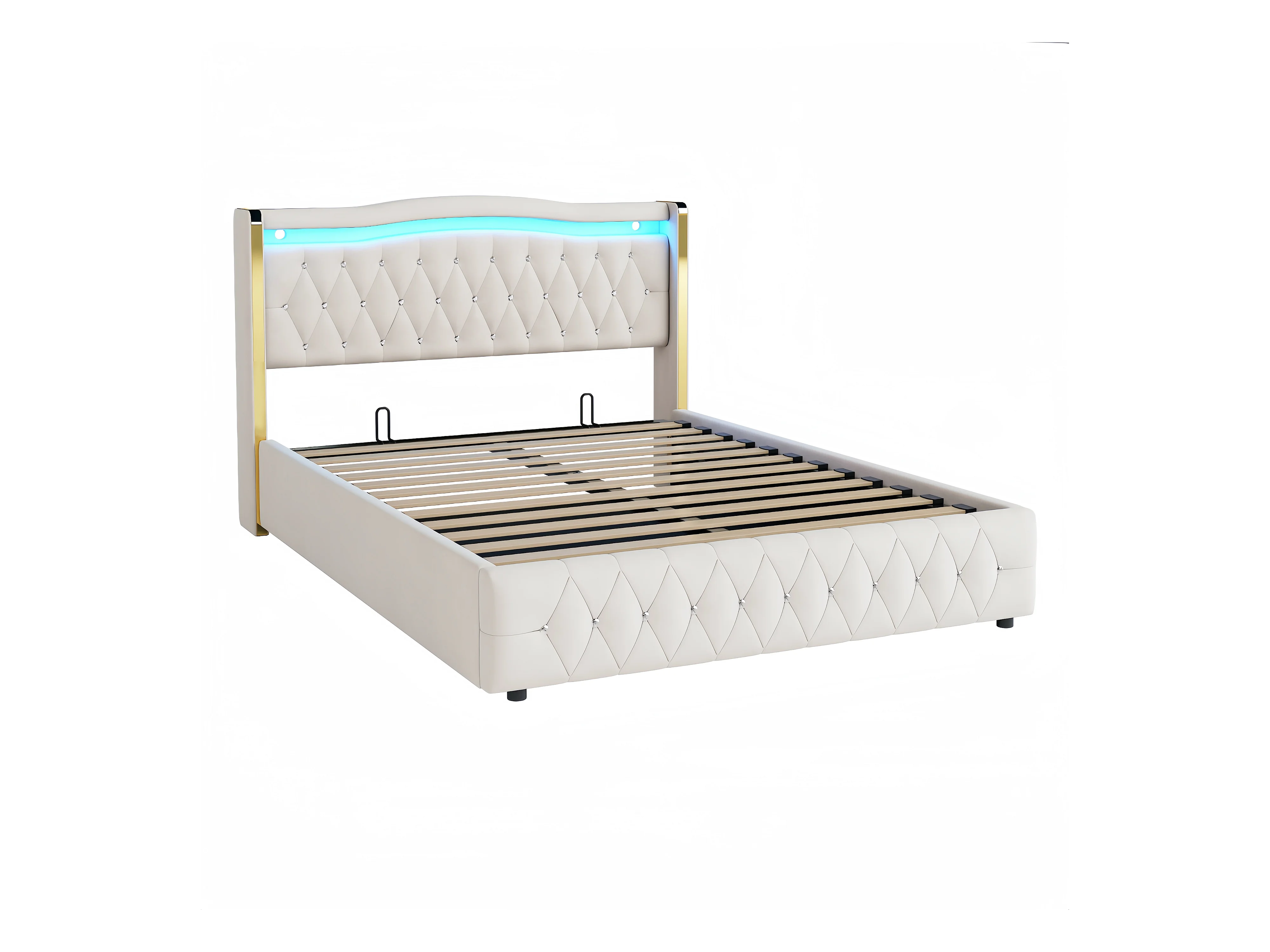 Lit coffre adulte 160x200cm avec LED et Tête de lit diamanté, velours, beige, sans matelas