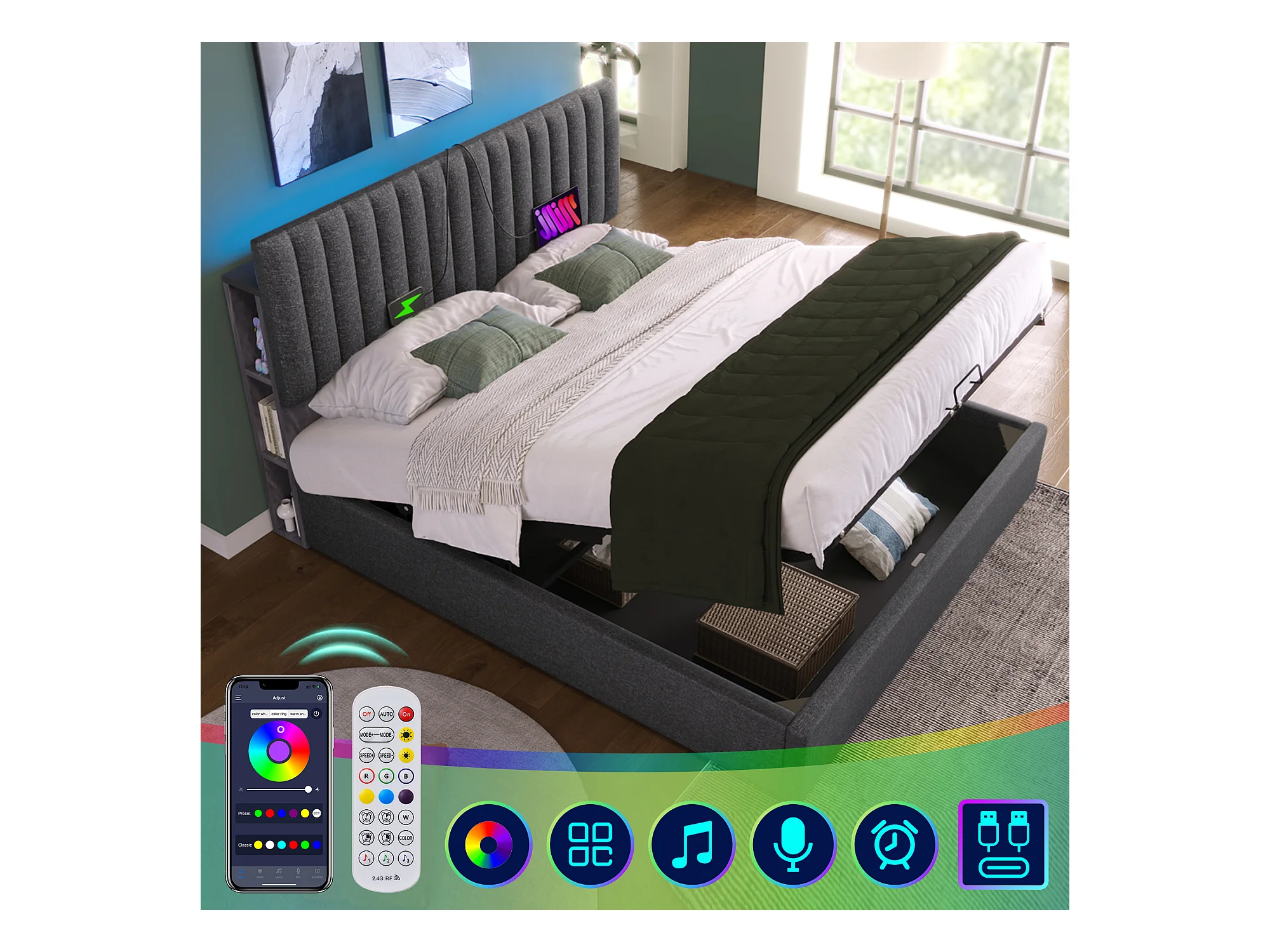 Lit coffre adulte 160x200 cm avec 2 lampes de lecture et USB type-C, en lin gris, sans matelas