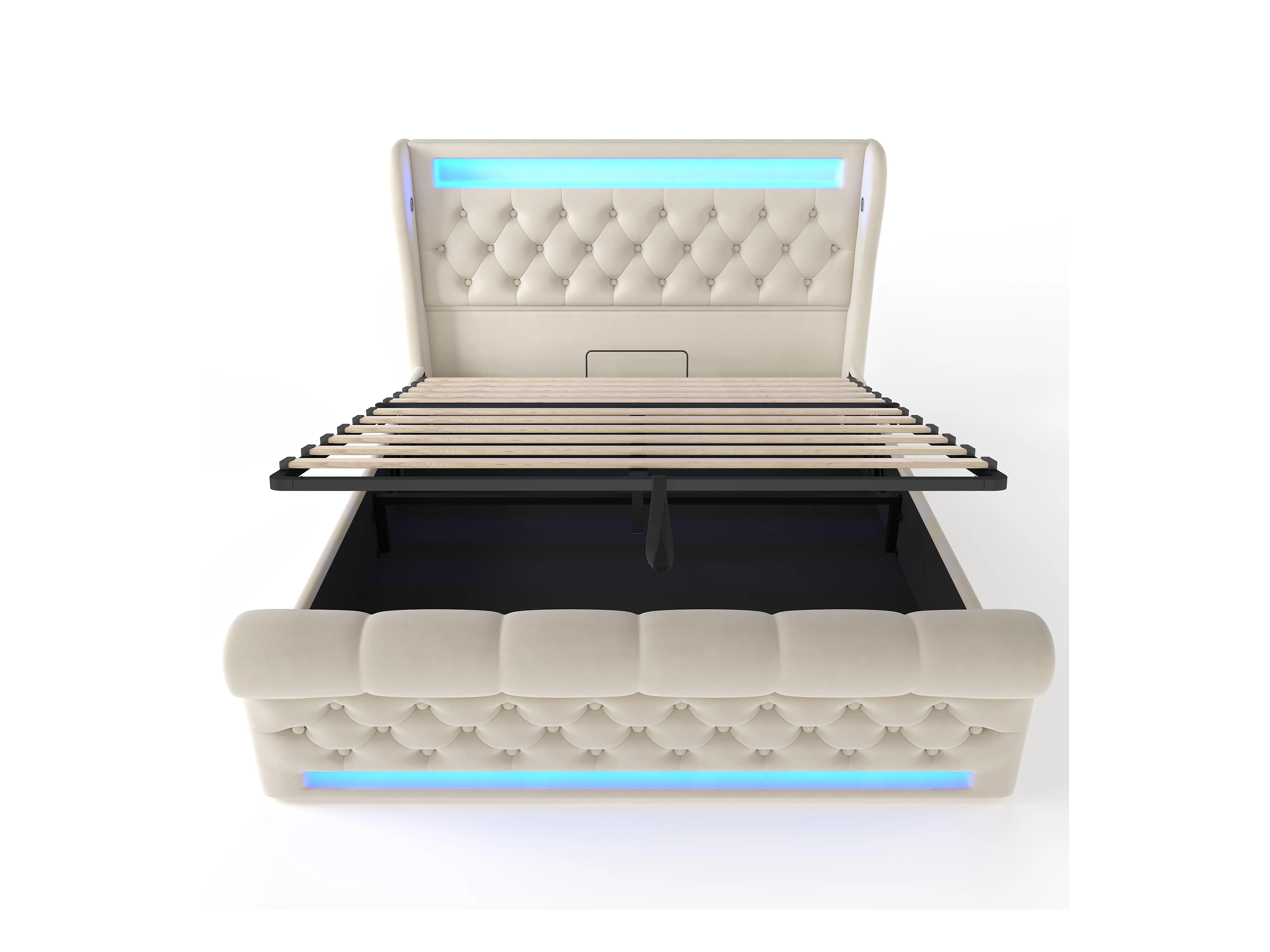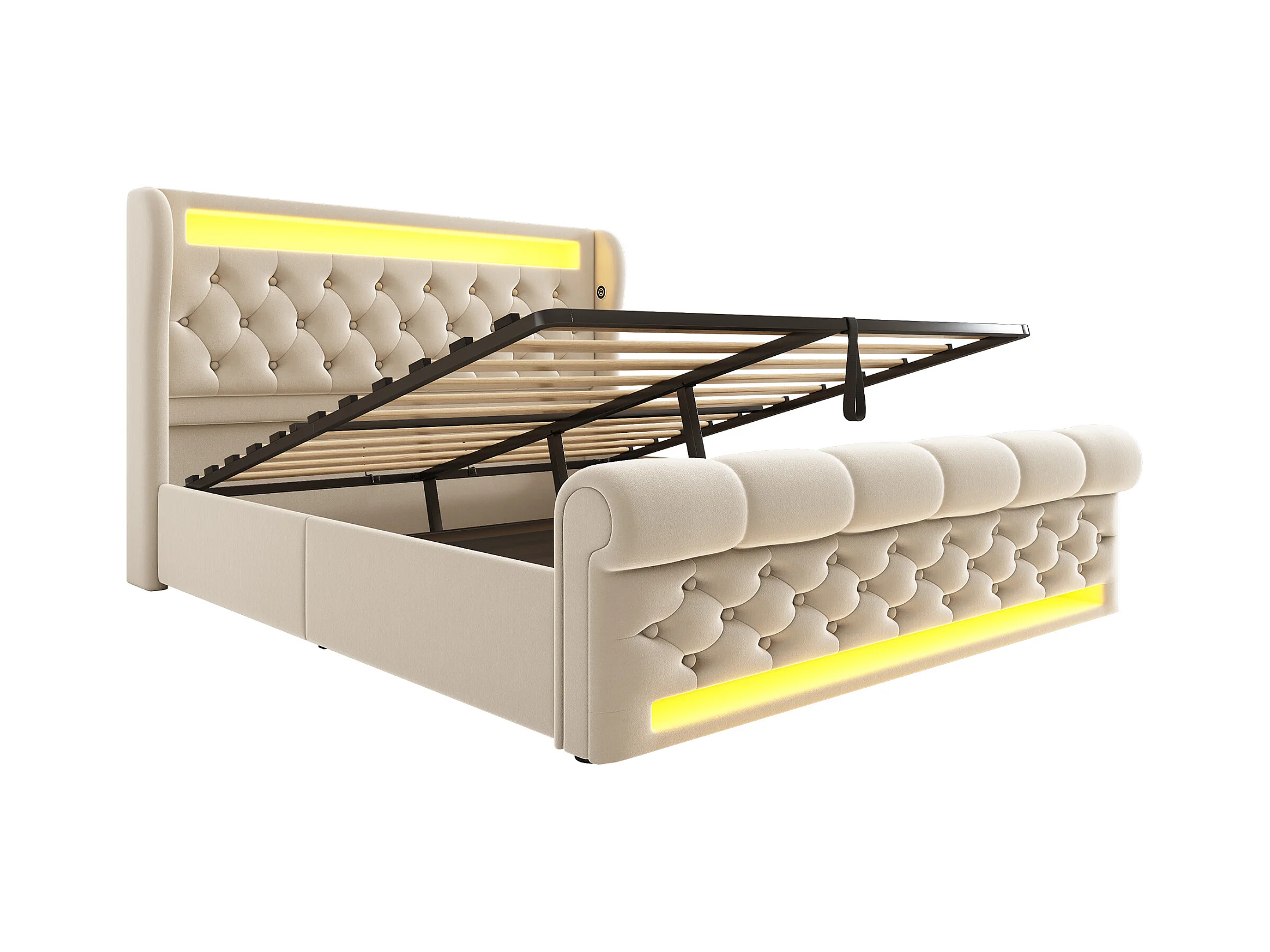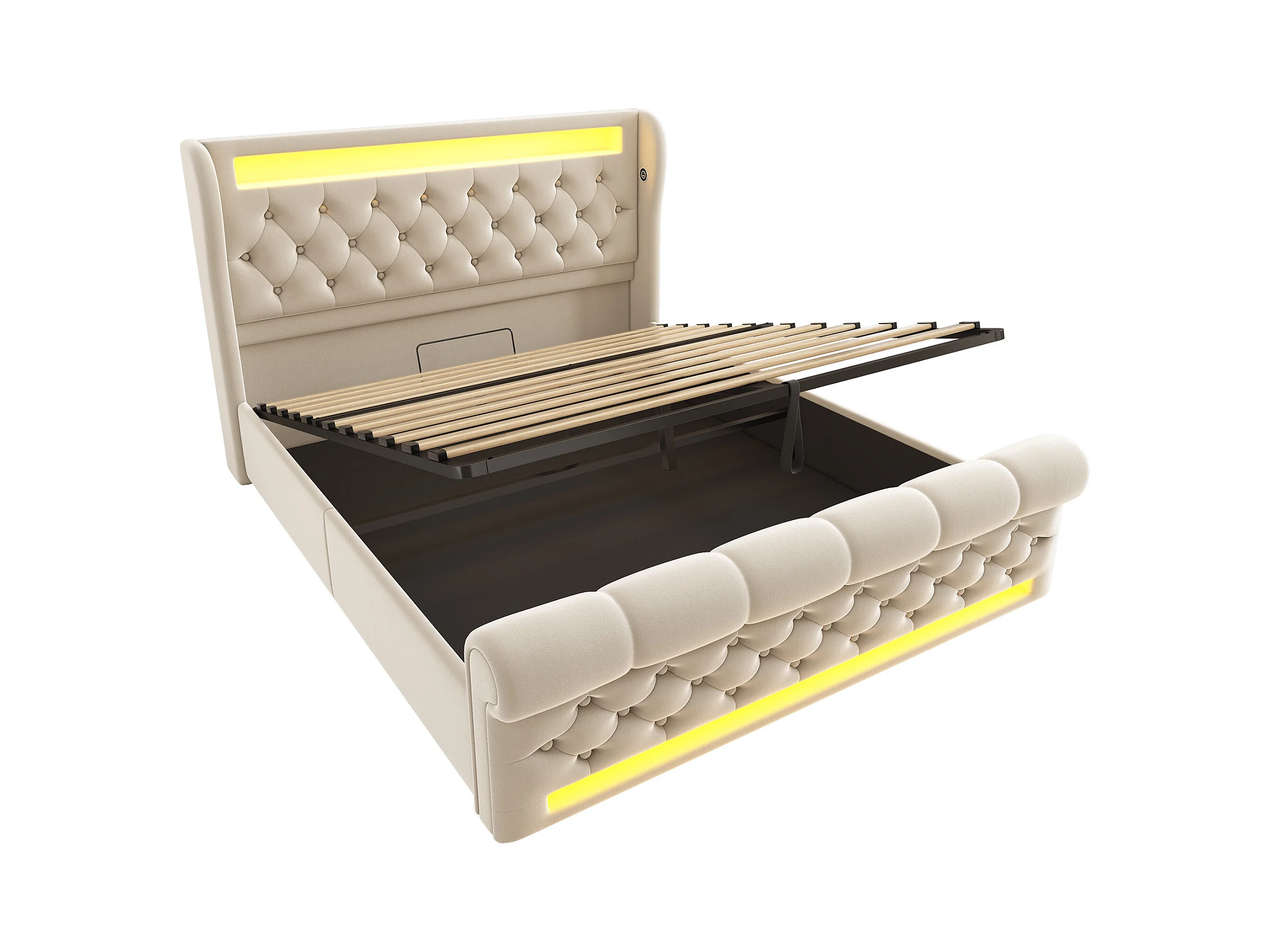 Lit coffre adulte 160x200cm avec LED et USB type-C, Tissu en velours beige, sommier à lattes, sans matelas