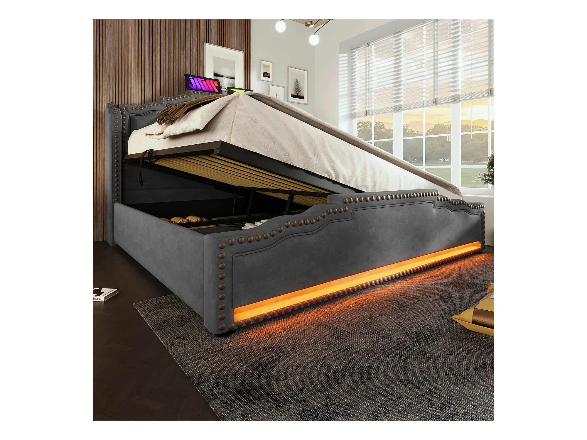 Lit coffre adulte 160x200cm avec LED et USB Type-C, velours, gris, sans matelas