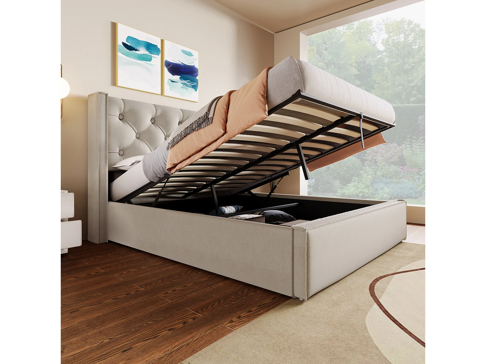 Lit coffre 160x200 cm avec tête de lit capitonnée et sommier relevable rangement, coton, gris clair (Sans matelas)
