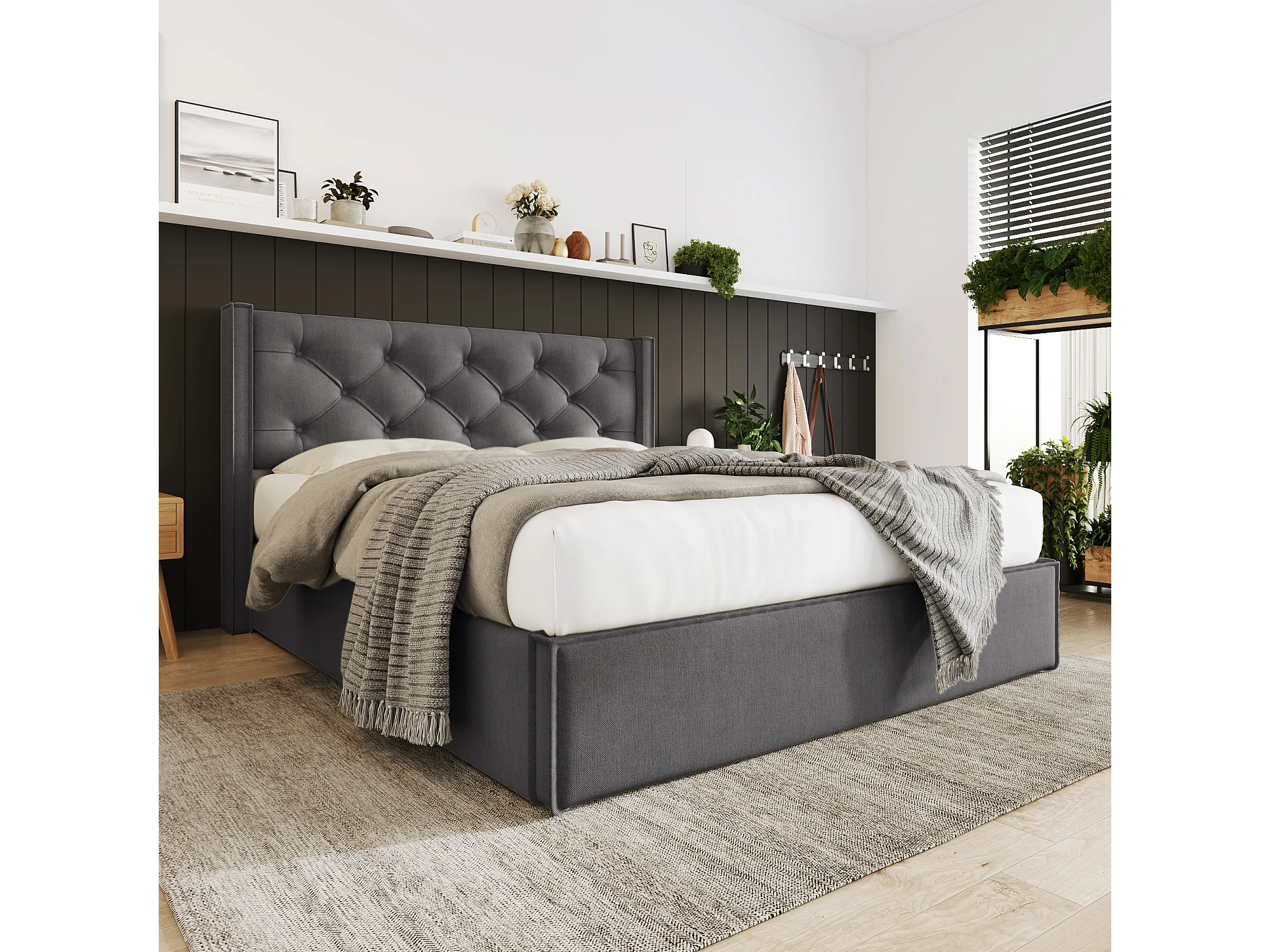 Lit coffre 160x200 cm avec tête de lit matelassée et sommier relevable, lattes en bois, coton, gris (Sans matelas)