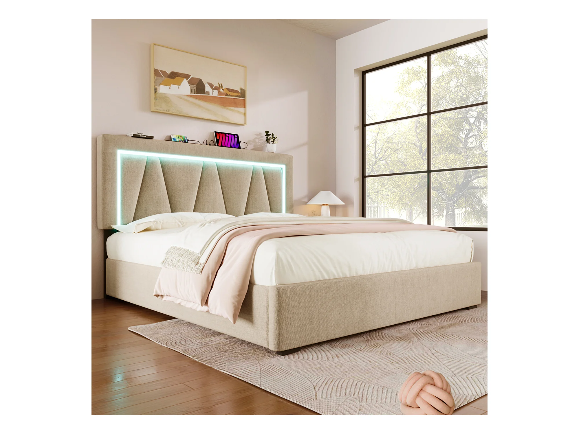 Lit coffre 160x200 cm avec sommier - tête de lit avec USB et lumière de lecture - lin beige (sans matelas)