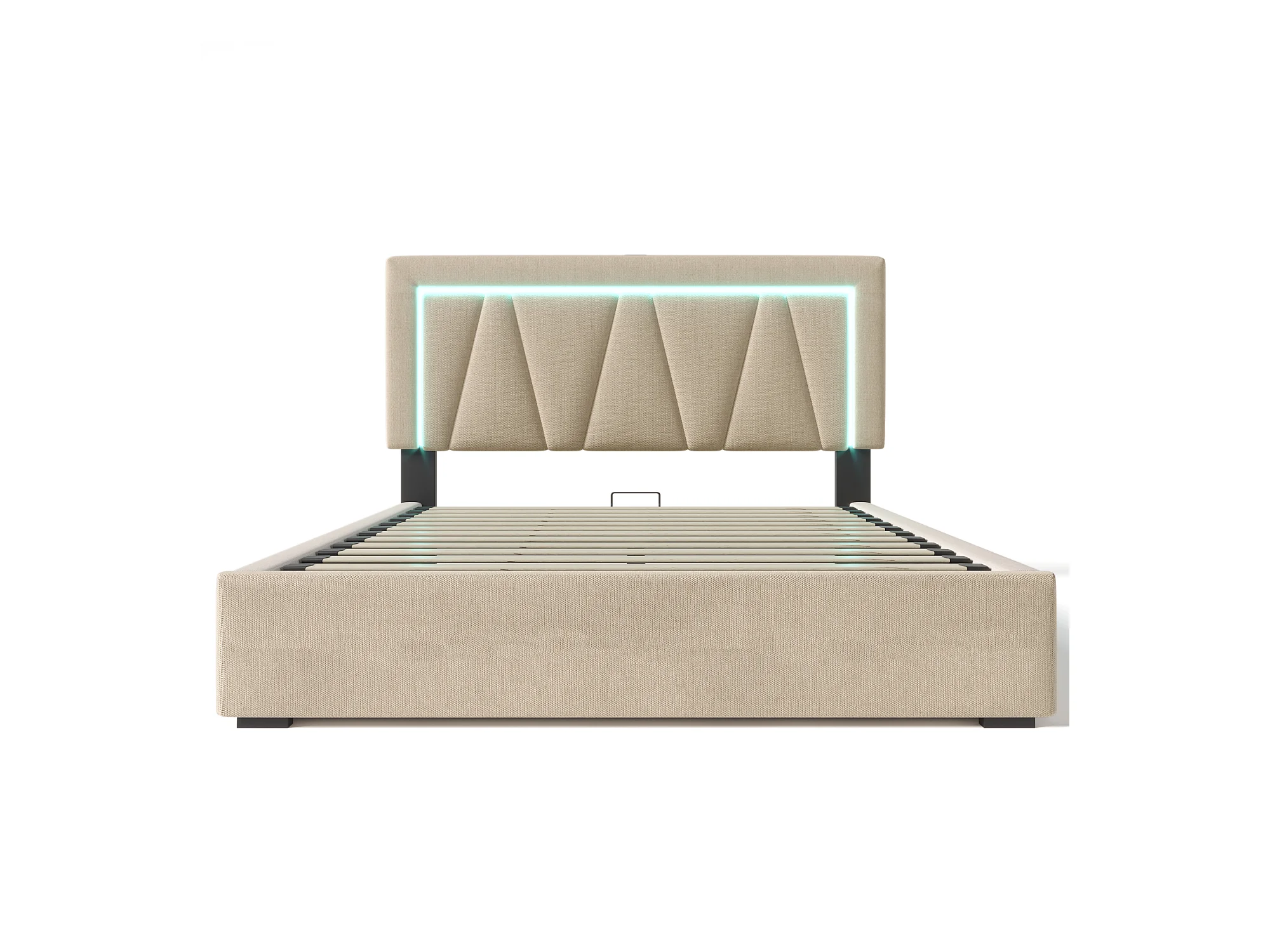Lit coffre 160x200 cm avec sommier - tête de lit capitonnée avec USB et LED - coton et lin - beige (sans matelas)