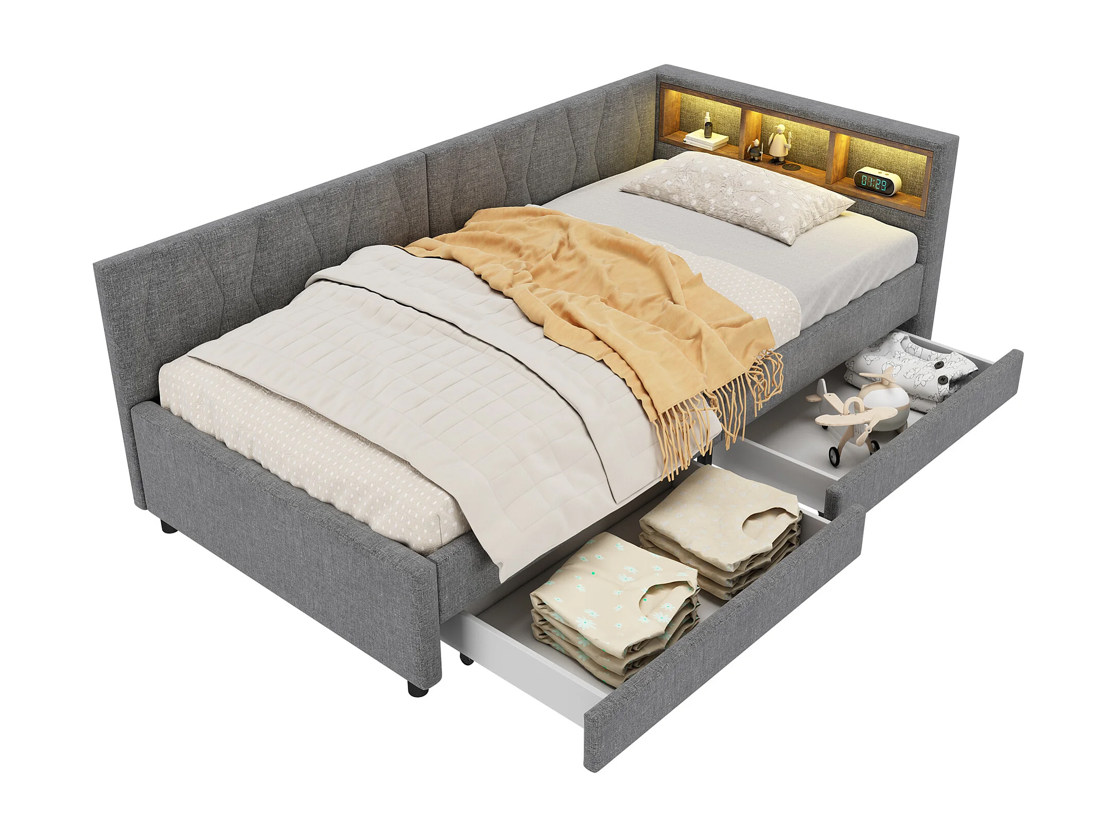 Lit simple 90x200 cm avec LED, avec tiroirs de rangement ports USB Type C en lin gris (Sans matelas)