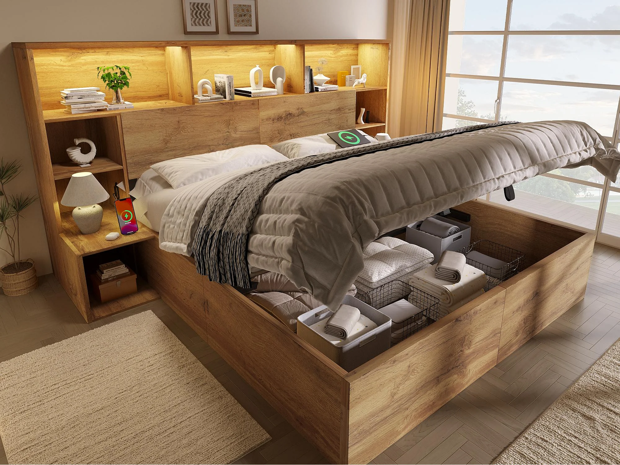 Lit coffre adulte 180x200cm à texture chêne - avec lumière LED et port USB-C - avec table de chevet intégrée - avec étagère - couleur chêne