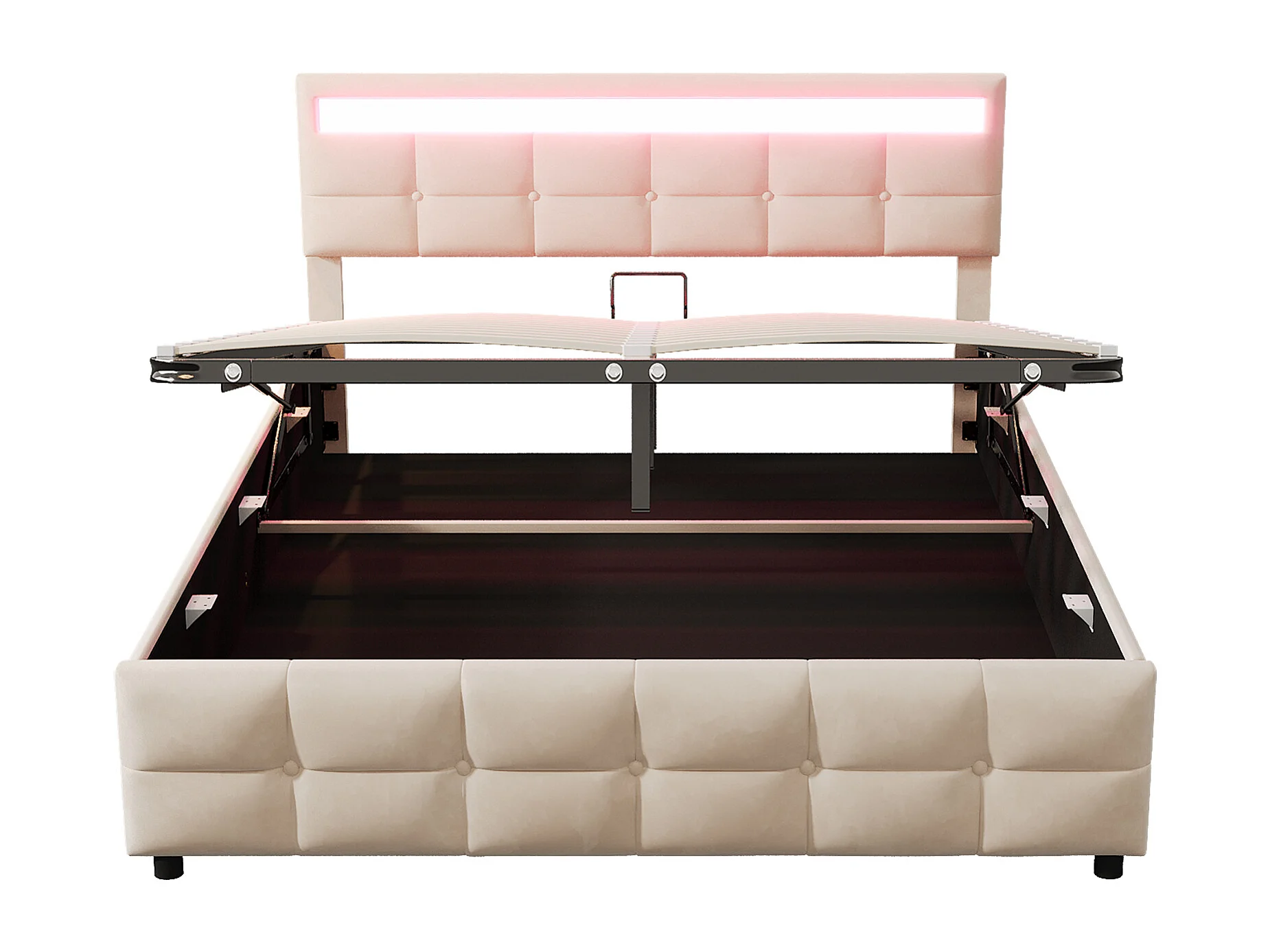 Lit coffre adulte 180x200cm beige avec LED en tissu velours hollandais, sans matelas