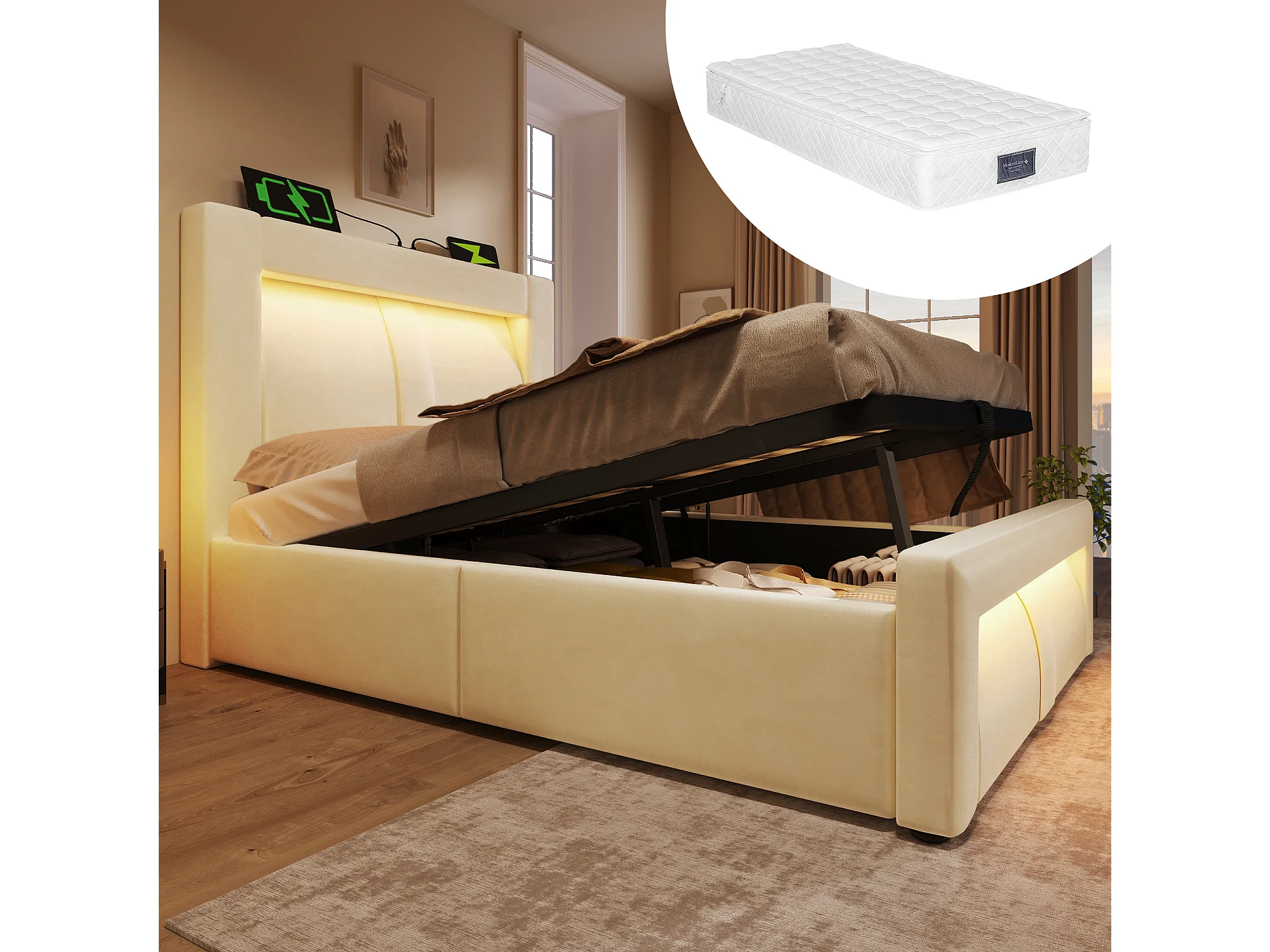 Lit enfant 90x200 cm avec rangement, LED et ports USB Type C, velours, beige (Avec matelas)