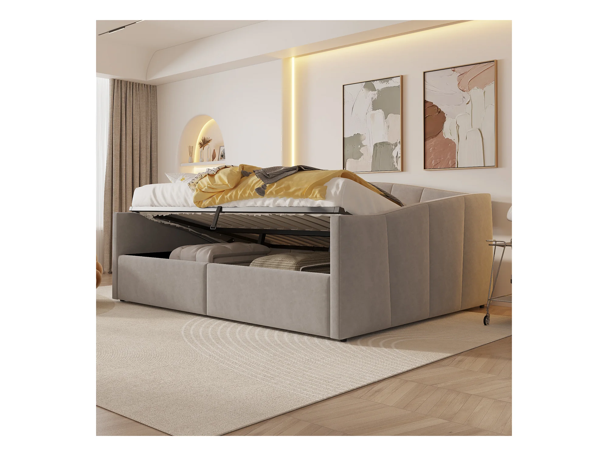 Lit coffre adulte, lit banquette 140x200cm gris clair en velours, sommier à lattes, sans matelas