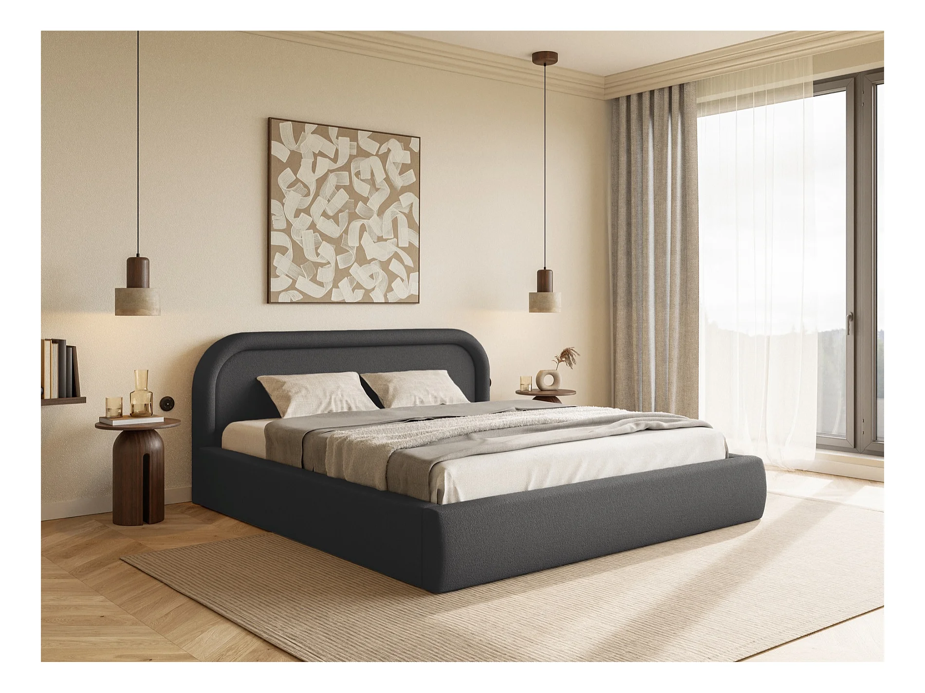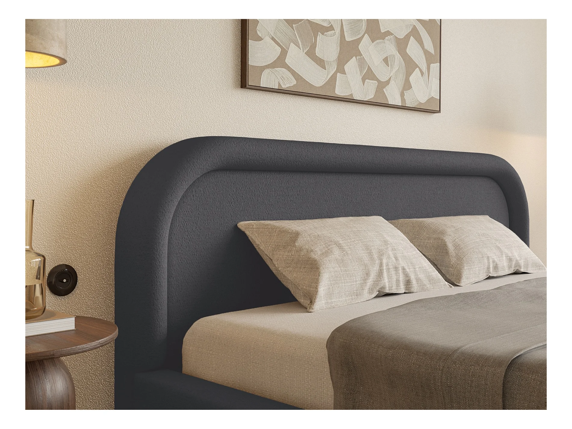 Lit coffre avec tête de lit - 180x200 cm - en bouclette gris foncé - SIMSALO
