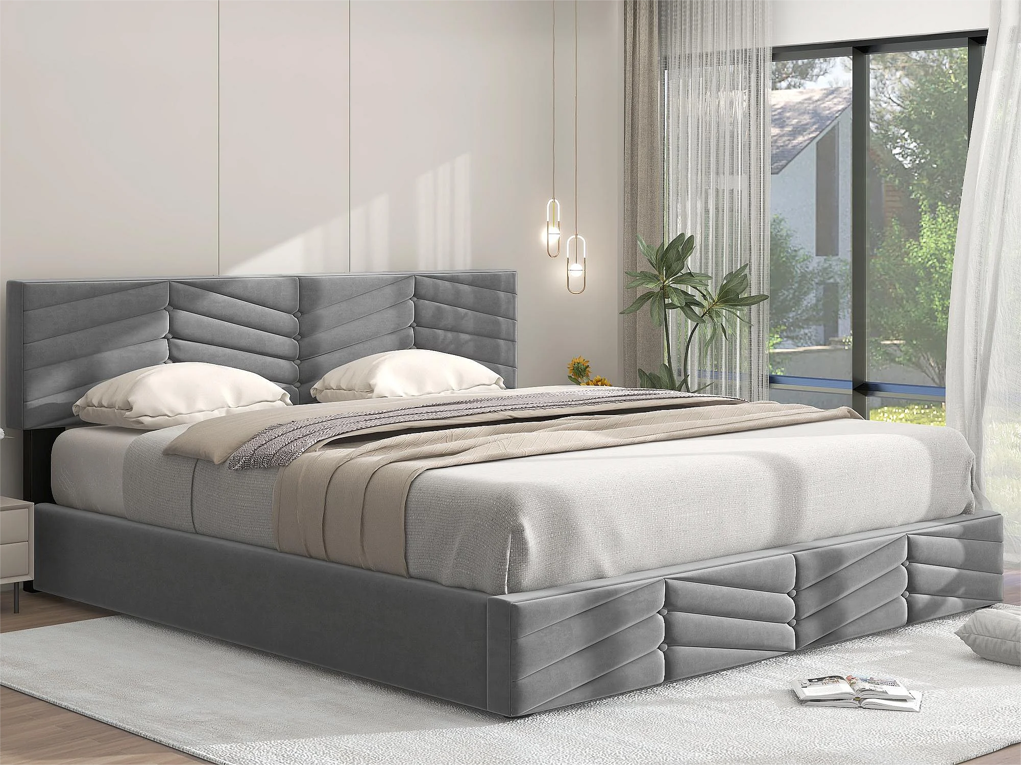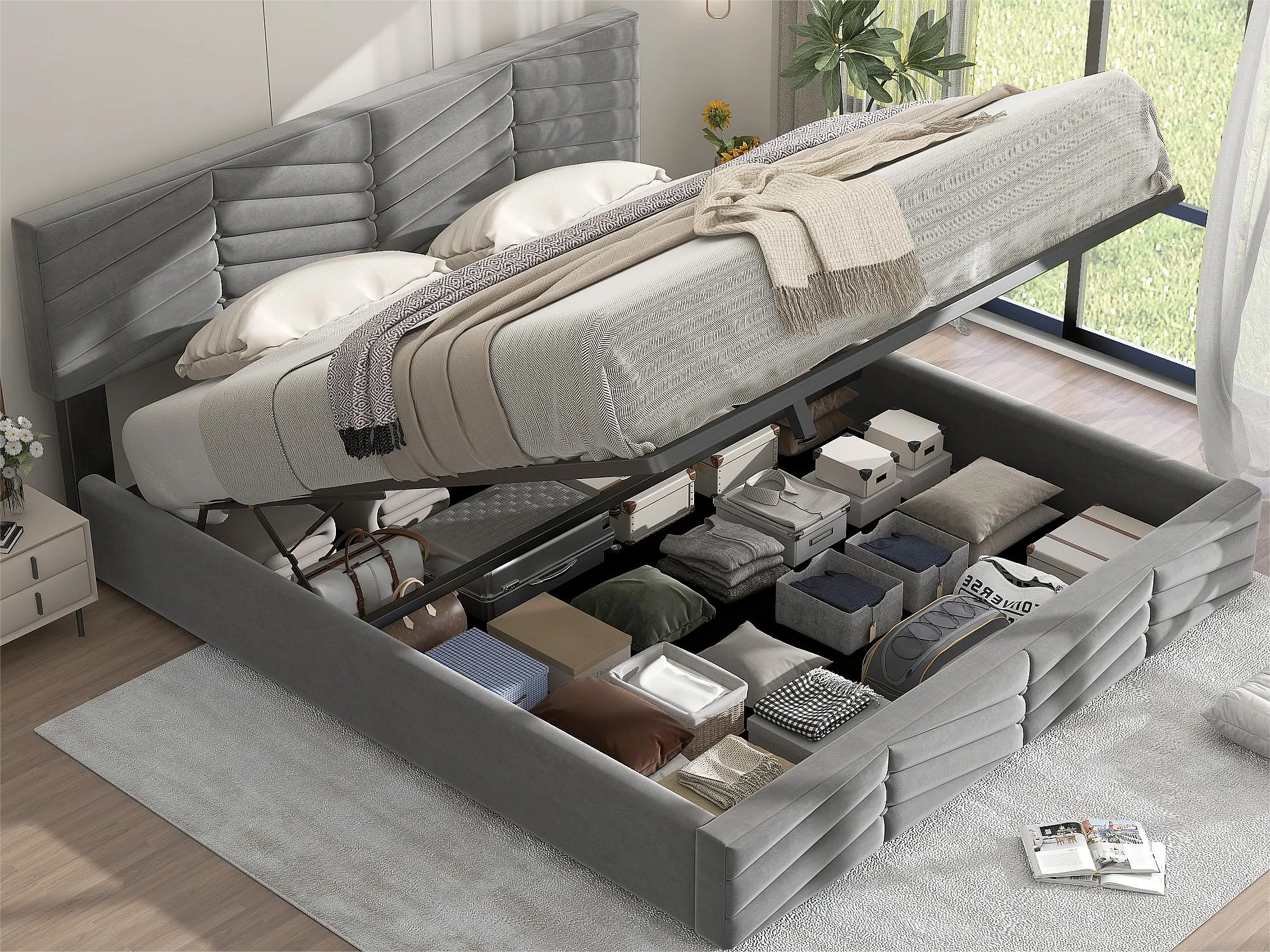 Lit coffre avec tête de lit réglable - 160 x 200 cm - velours - sommier à lattes - coloris - gris