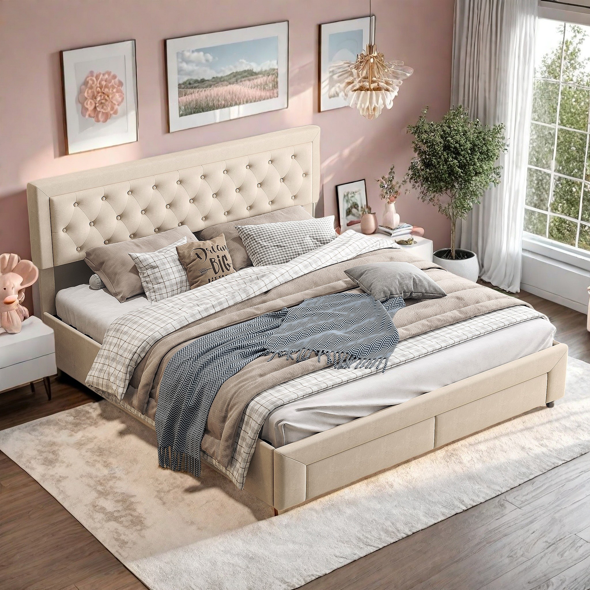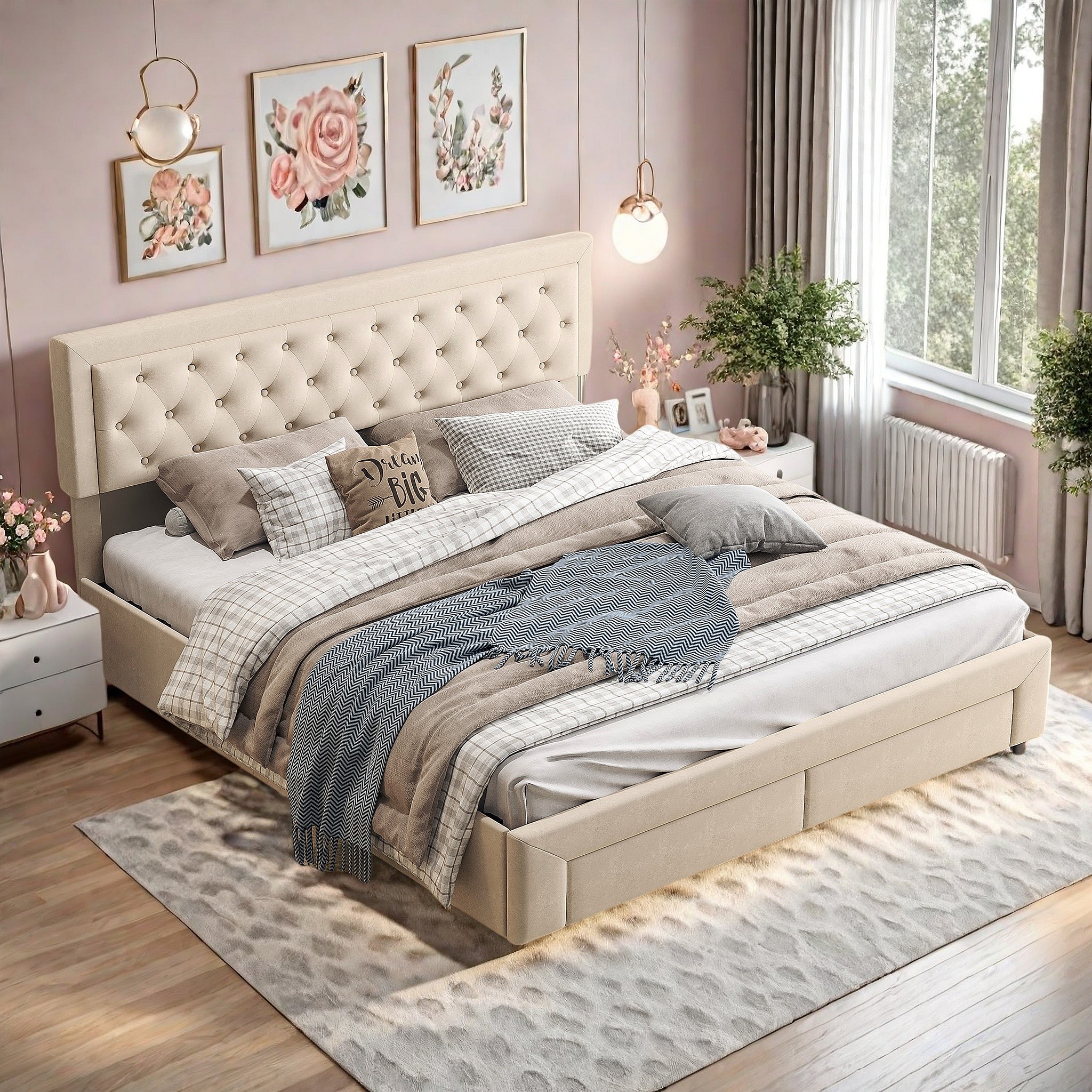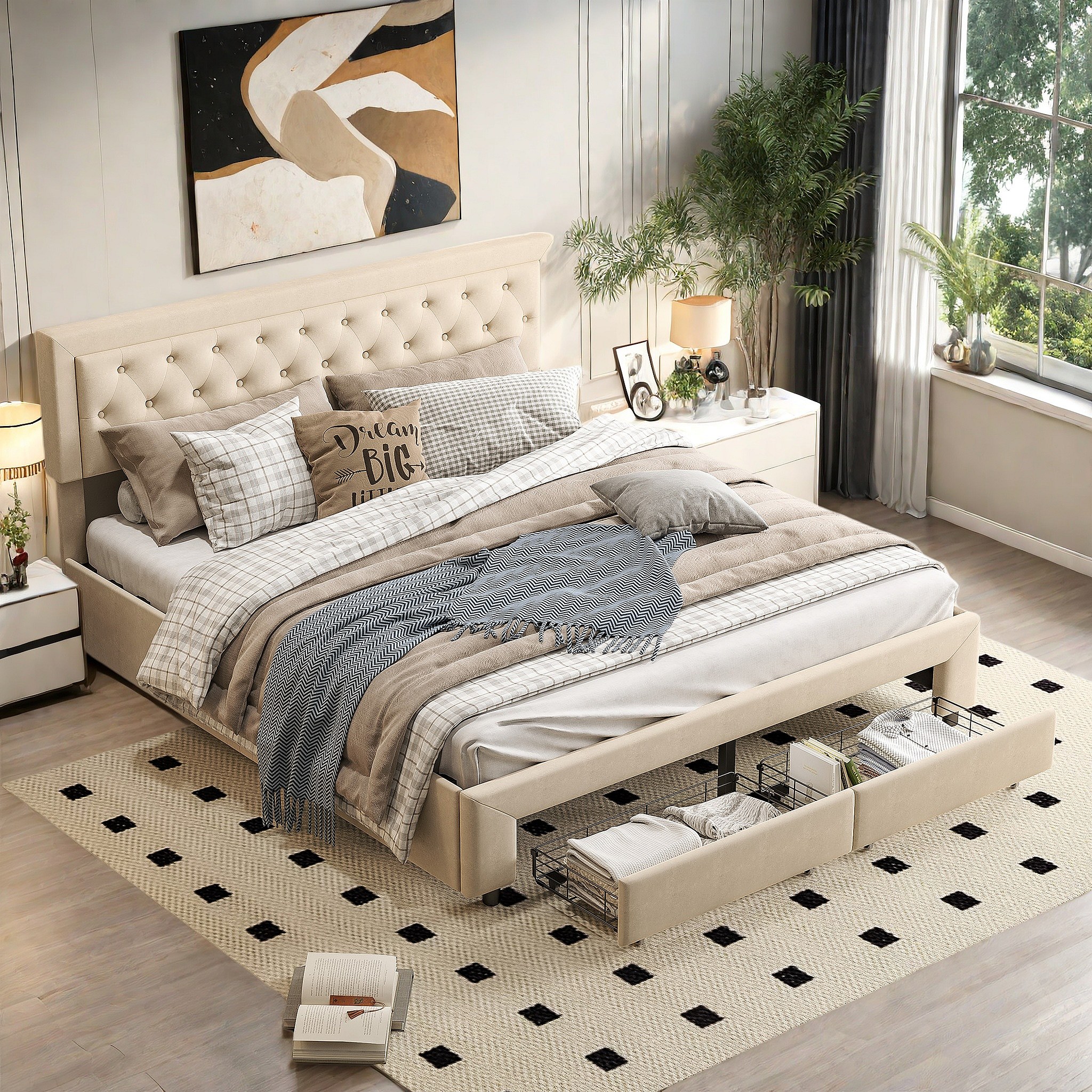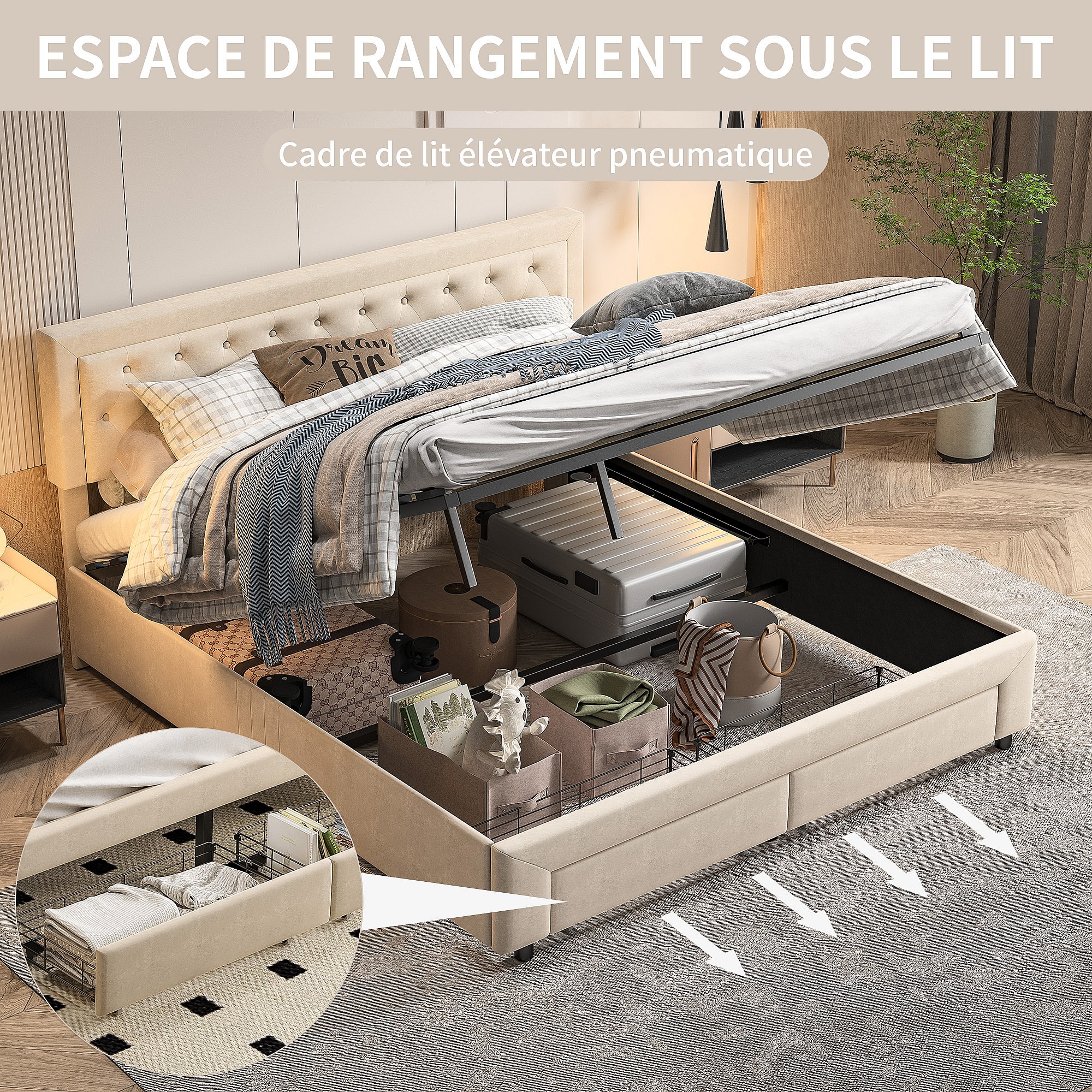 Lit coffre beige 160 x 200 cm, en velours, avec tête de lit rembourrée réglable en hauteur, lit coffre avec tiroirs et lattes en bois