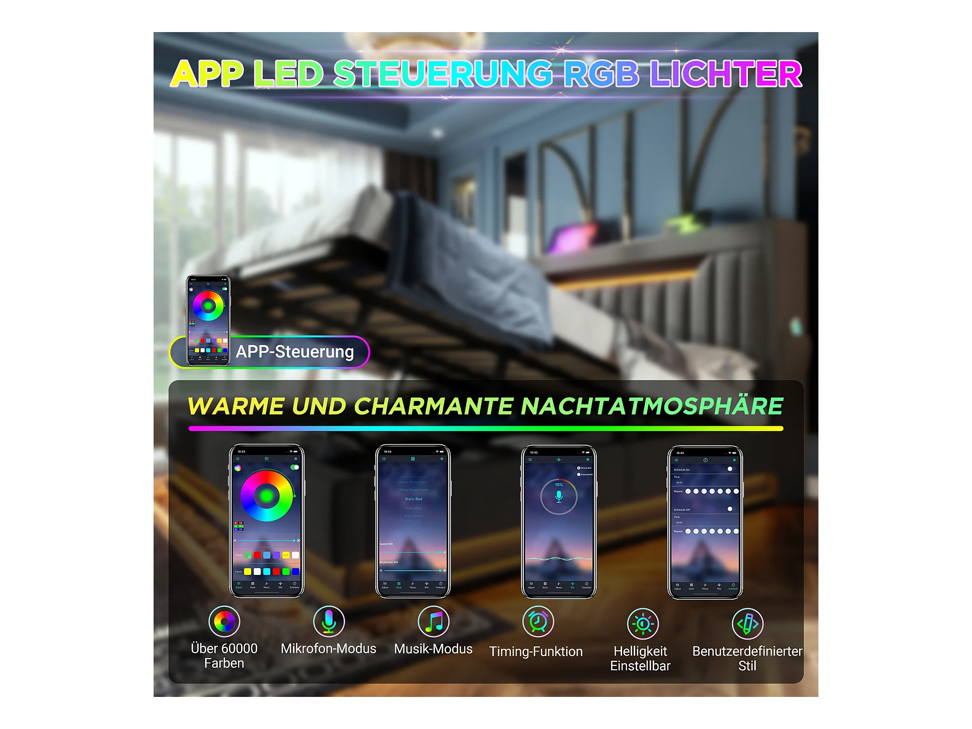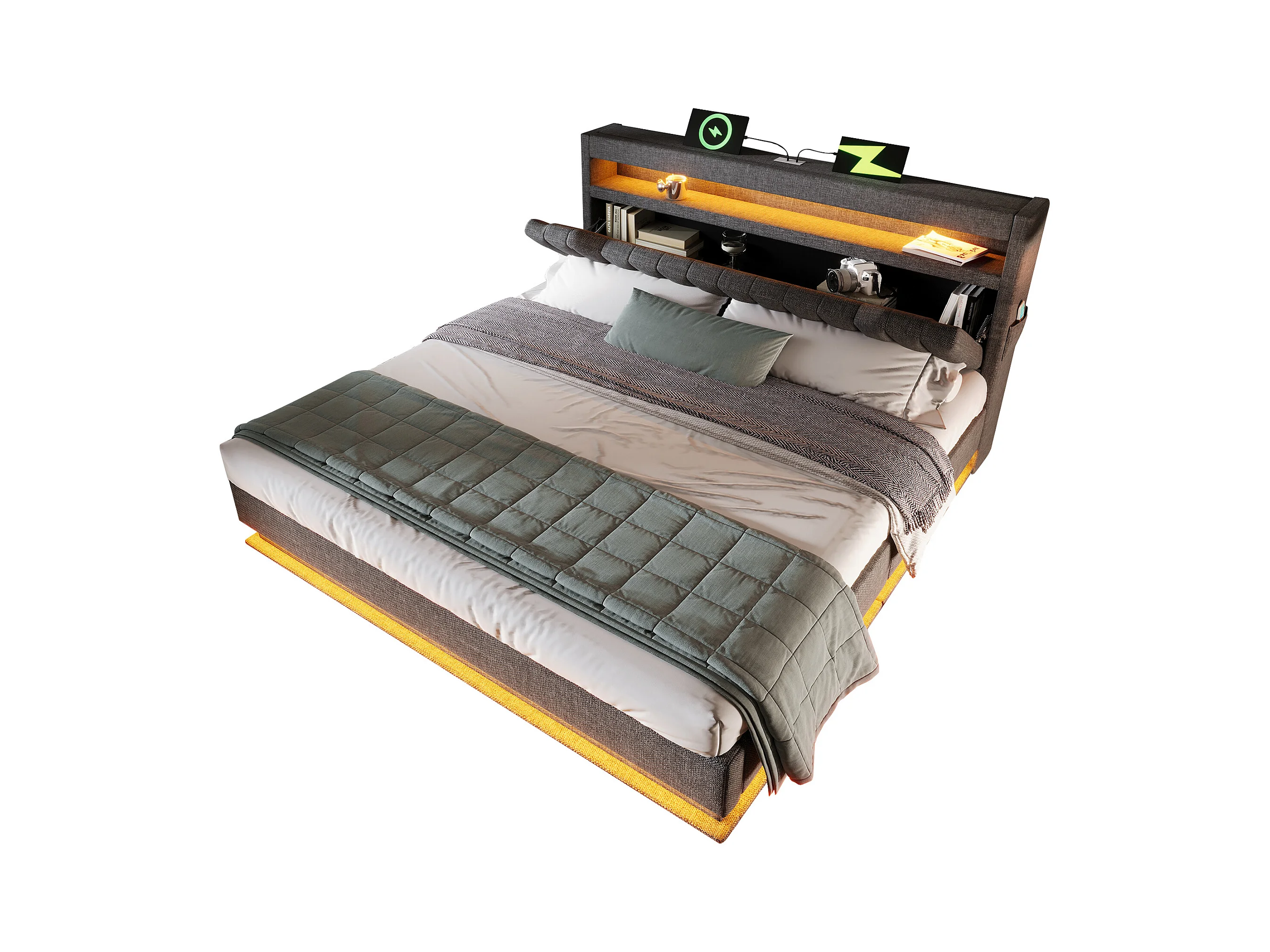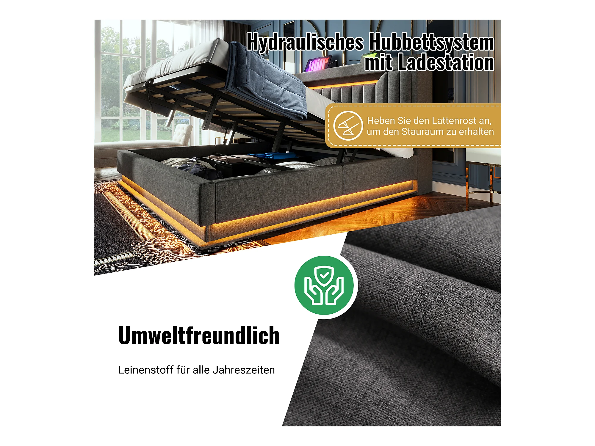 Lit coffre capitonné - 140 x 200 cm - avec tête de lit + USB + Leds - rangement hydraulique - lin - gris