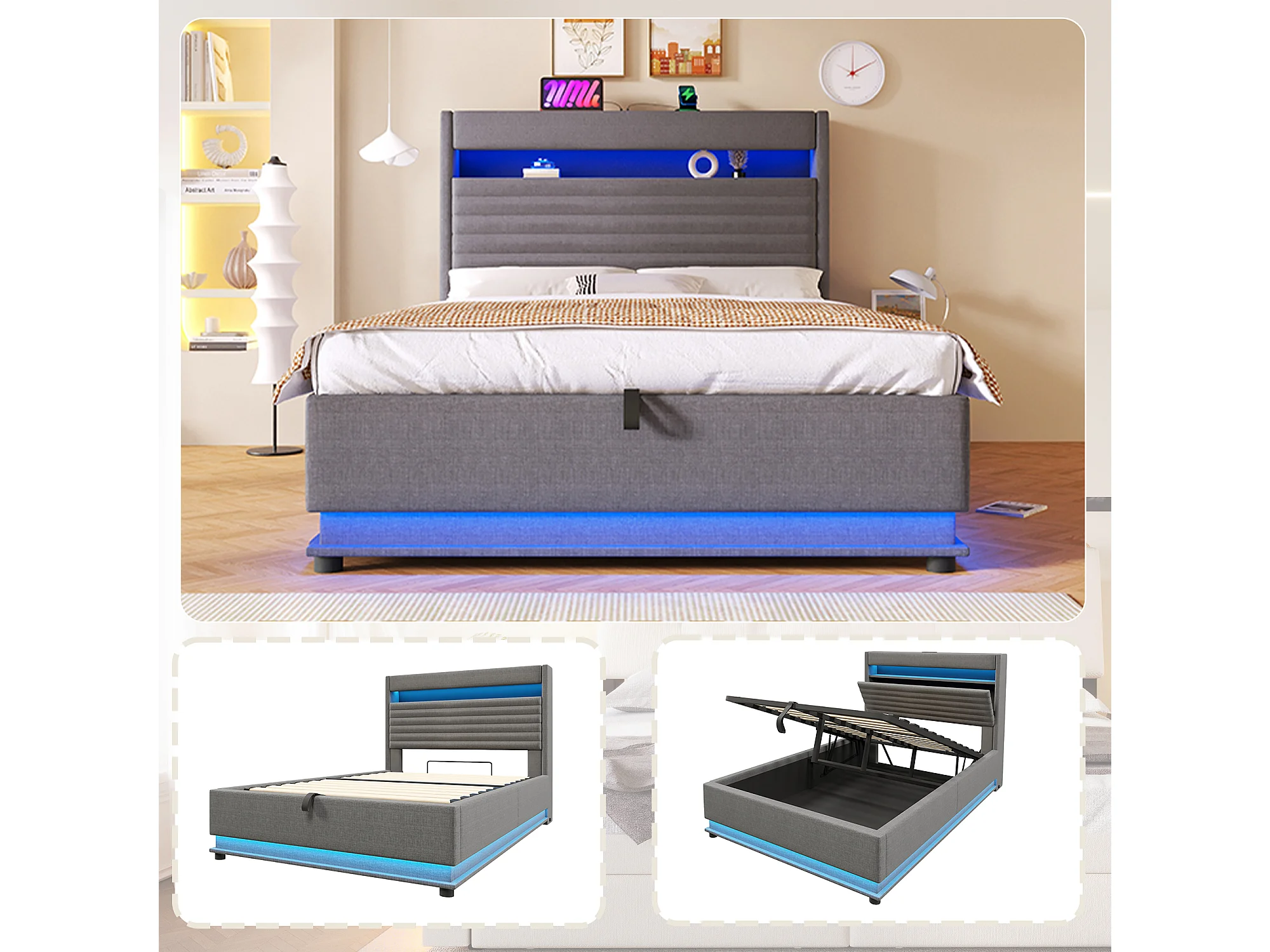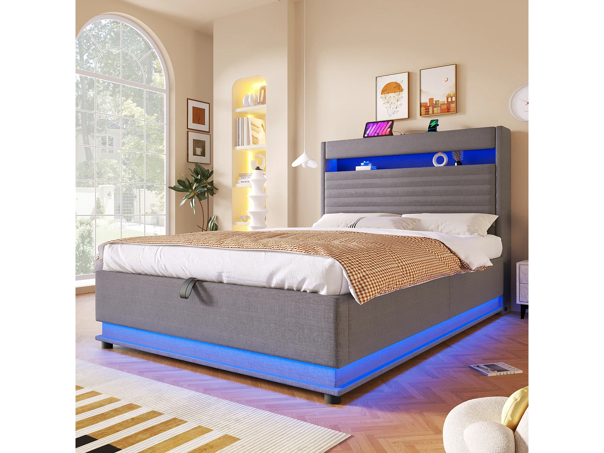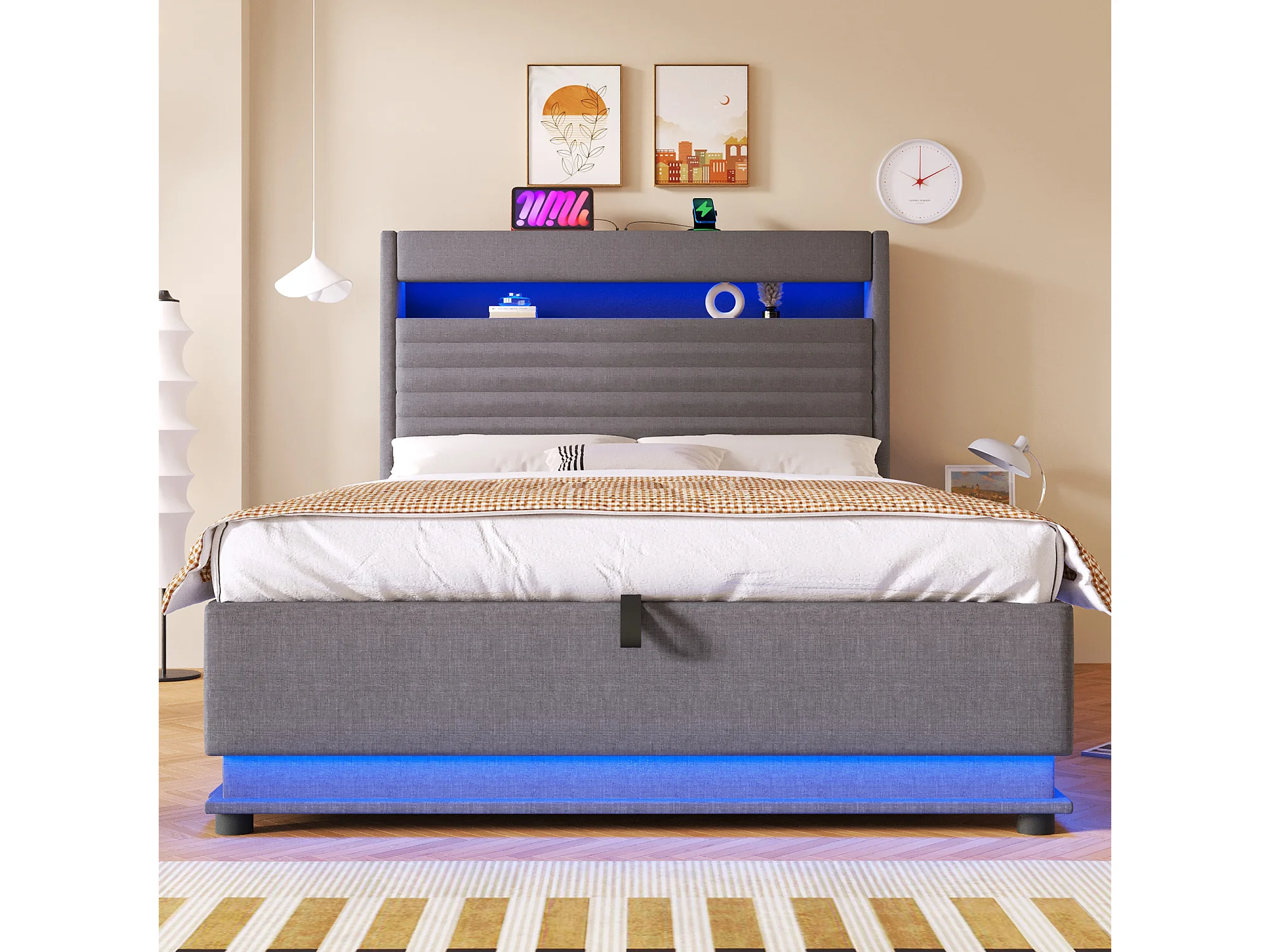 Lit coffre capitonné - 140 x 200 cm - avec USB + Leds + suspension hydraulique + tête de lit de rangement rabattable - lin - gris