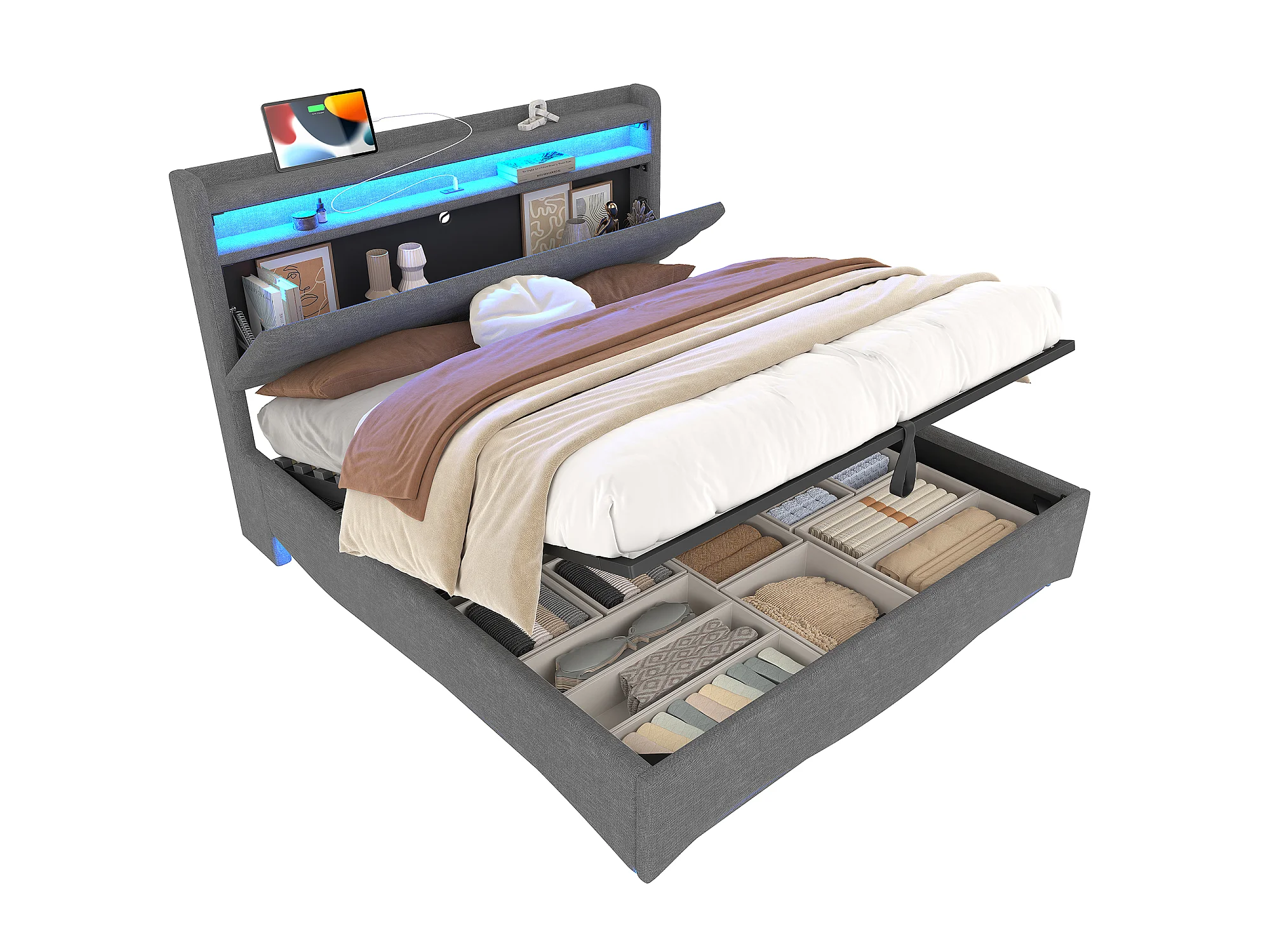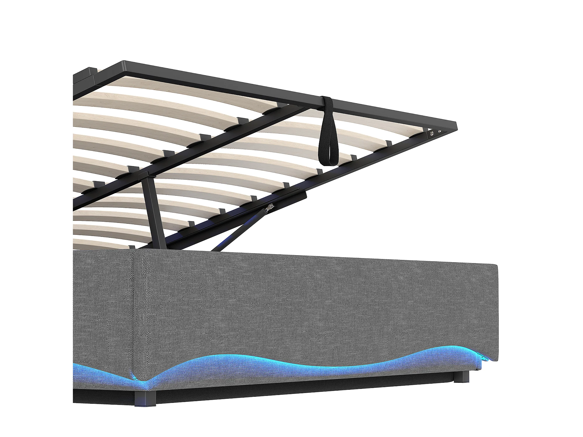 Lit coffre capitonné 140x200 cm - avec lumière LED - avec interface USB + Type-C - avec compartiments de rangement - tissu lin - gris (matelas non inclus)