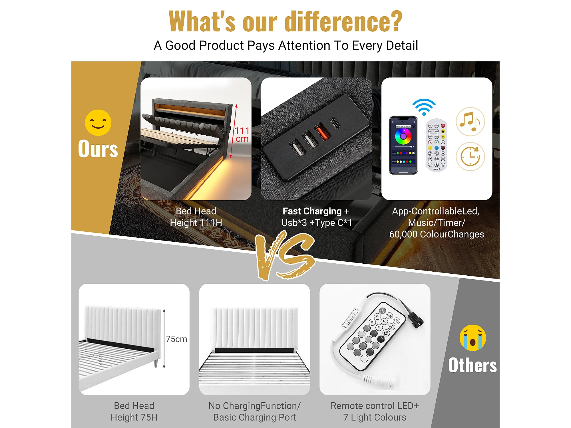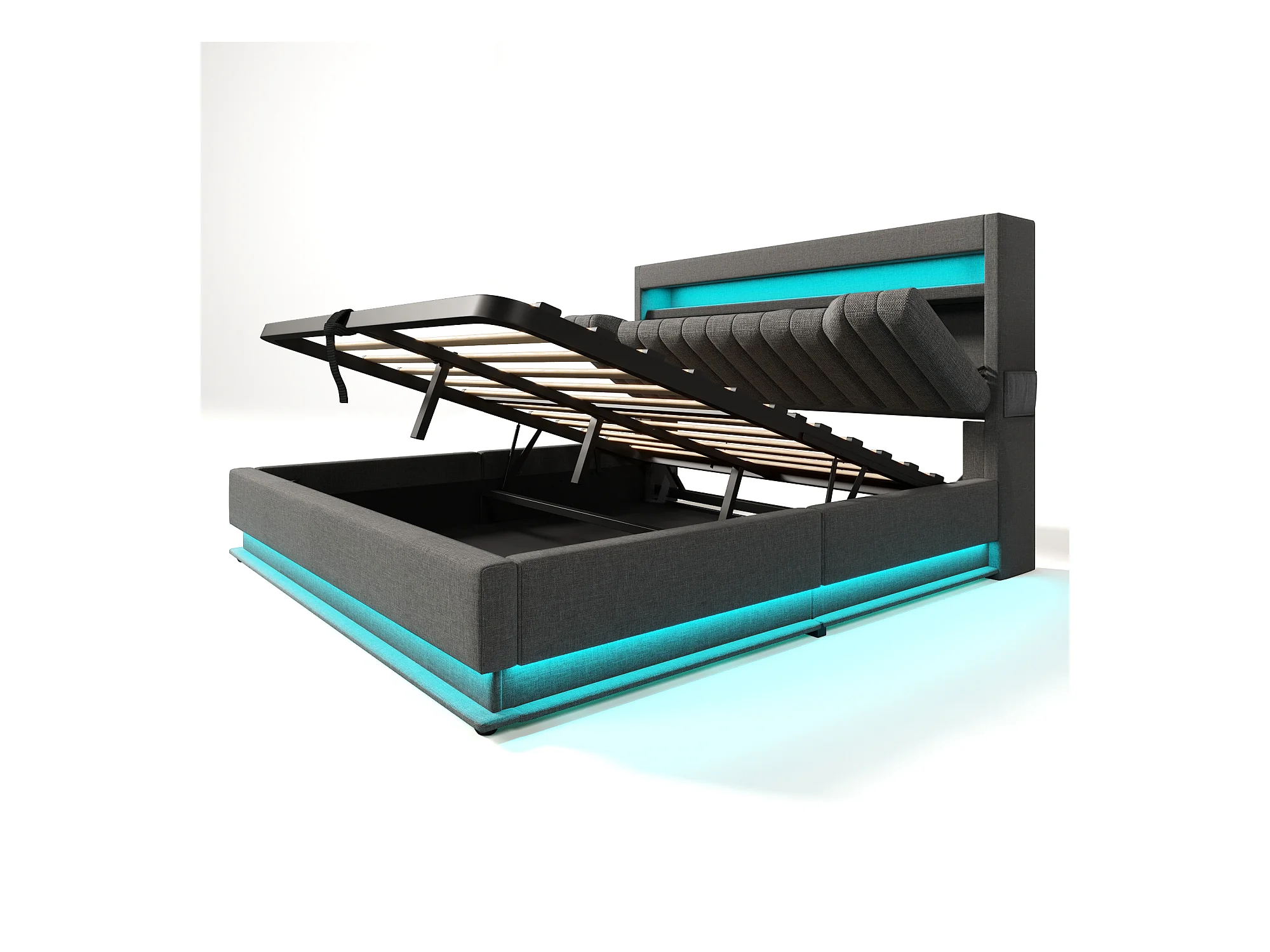 Lit coffre capitonné 140x200cm - avec LED - avec ports USB et Type-C - tissu en Lin - tête de lit avec espace de rangement - Gris