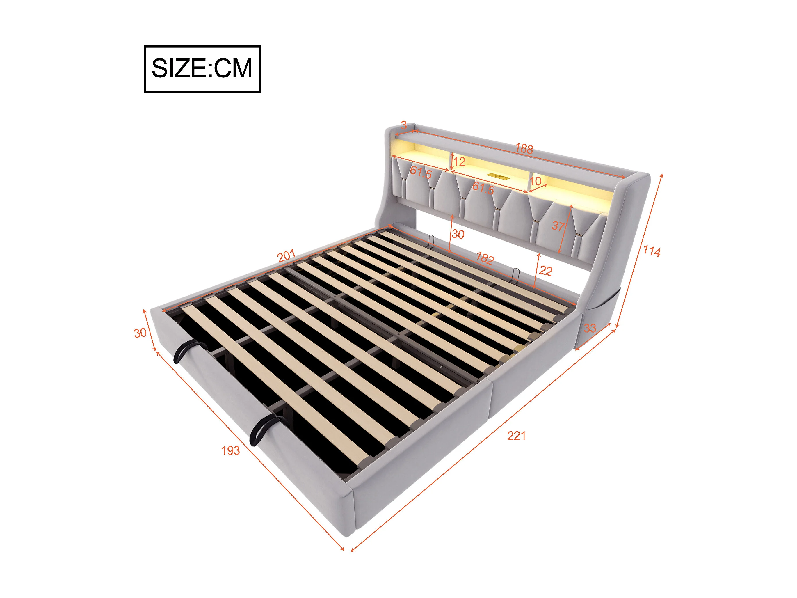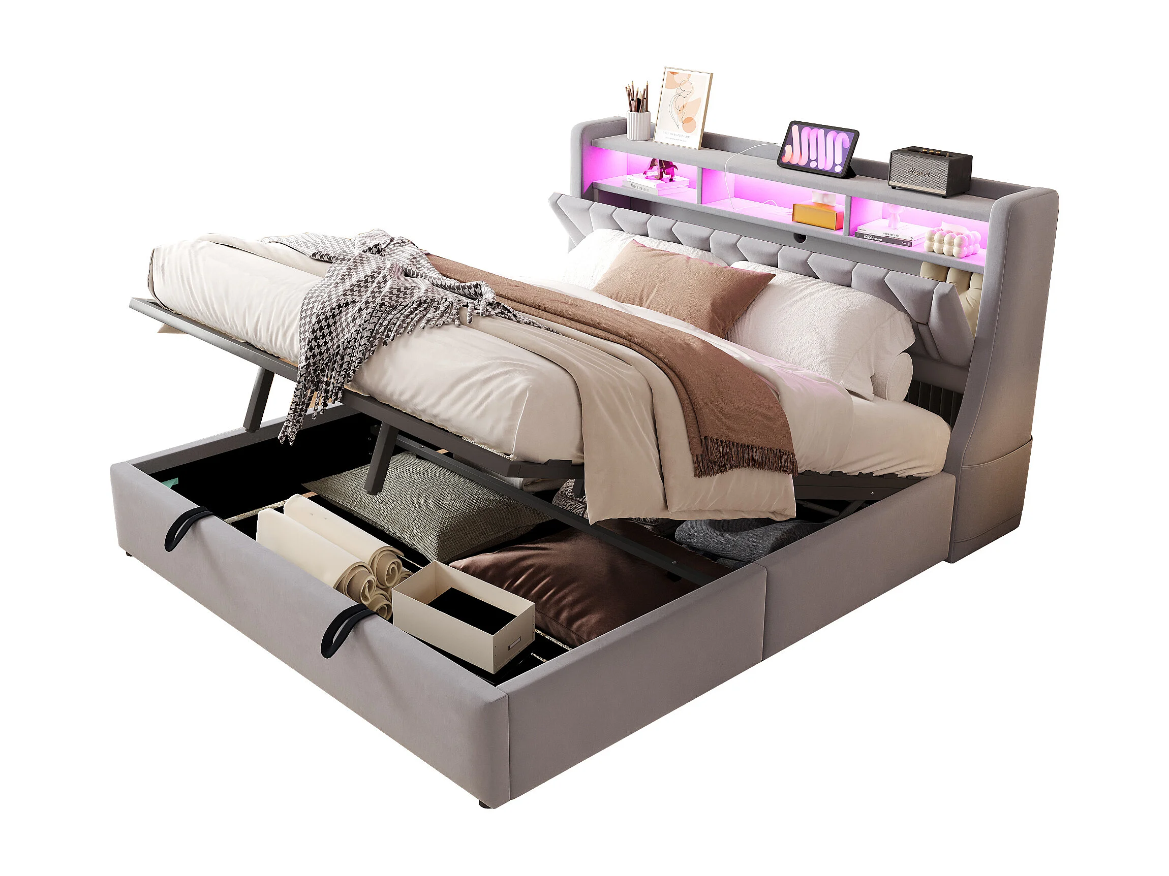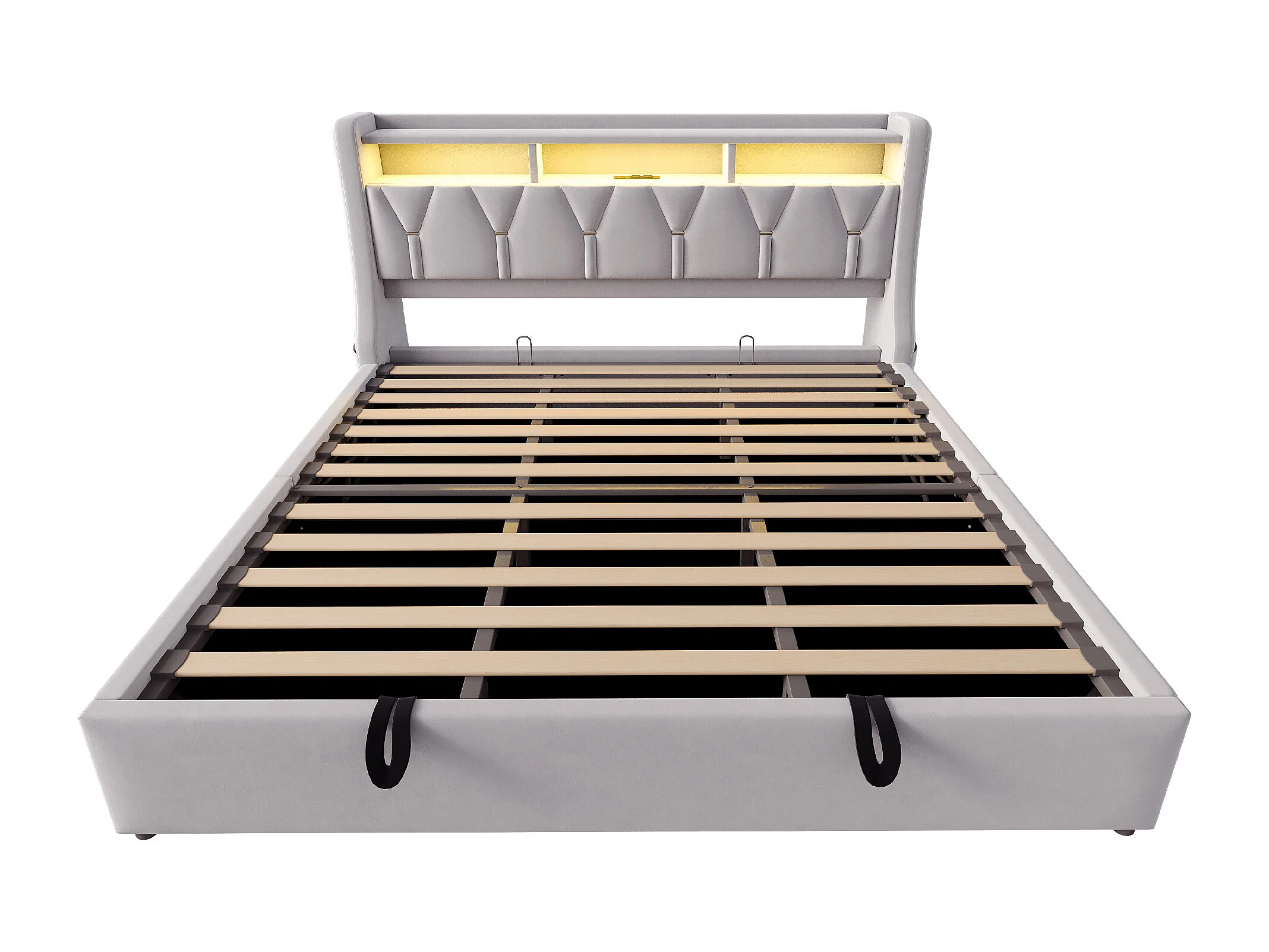 Lit coffre capitonné 180 x 200 cm - Tête de lit rabattable - avec prise électrique - avec éclairage LED - Velours - Gris clair (matelas non inclus)