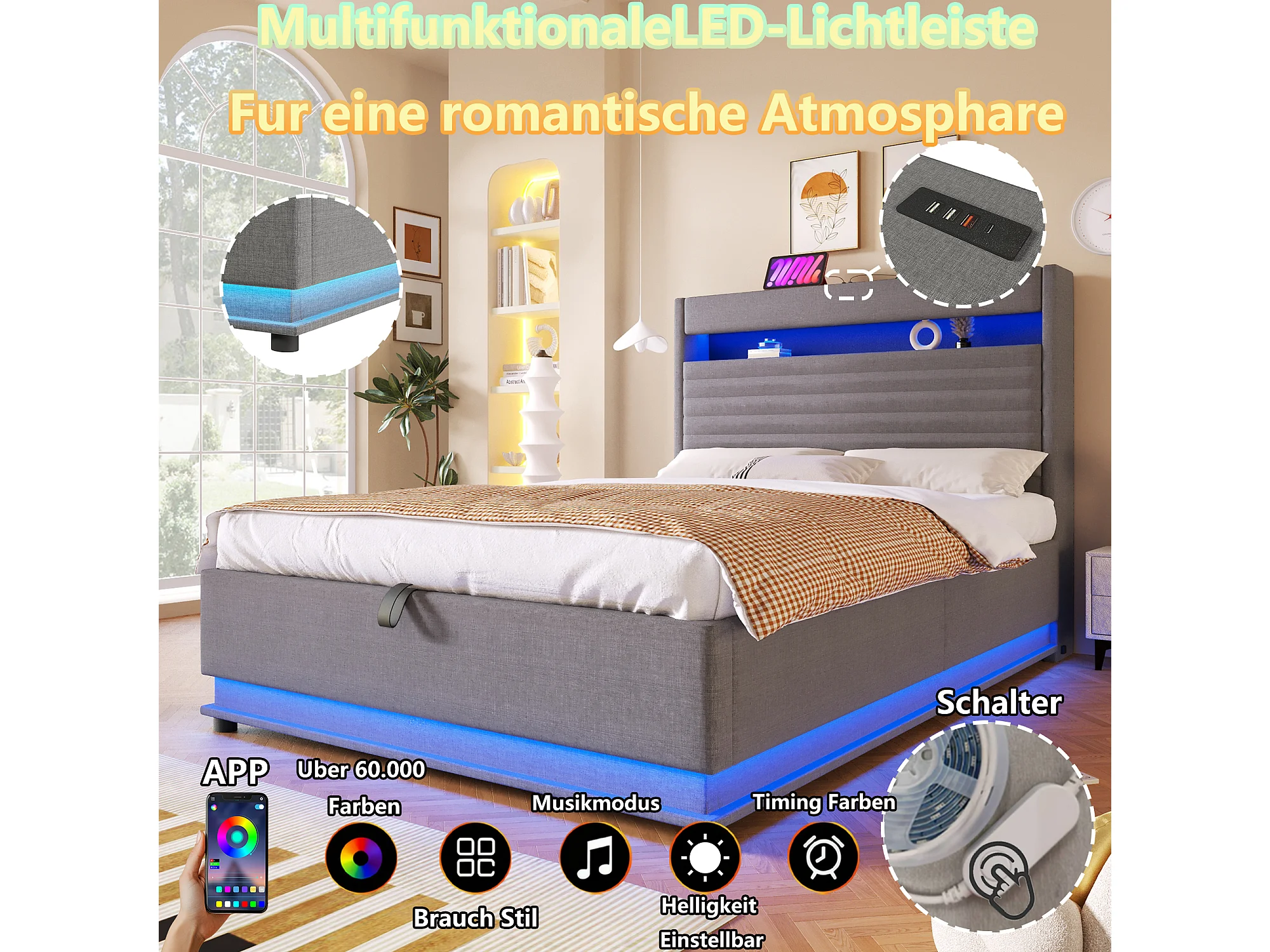 Lit coffre capitonné - 90 x 200 cm - avec USB + Leds + suspension hydraulique + tête de lit de rangement rabattable - lin - gris