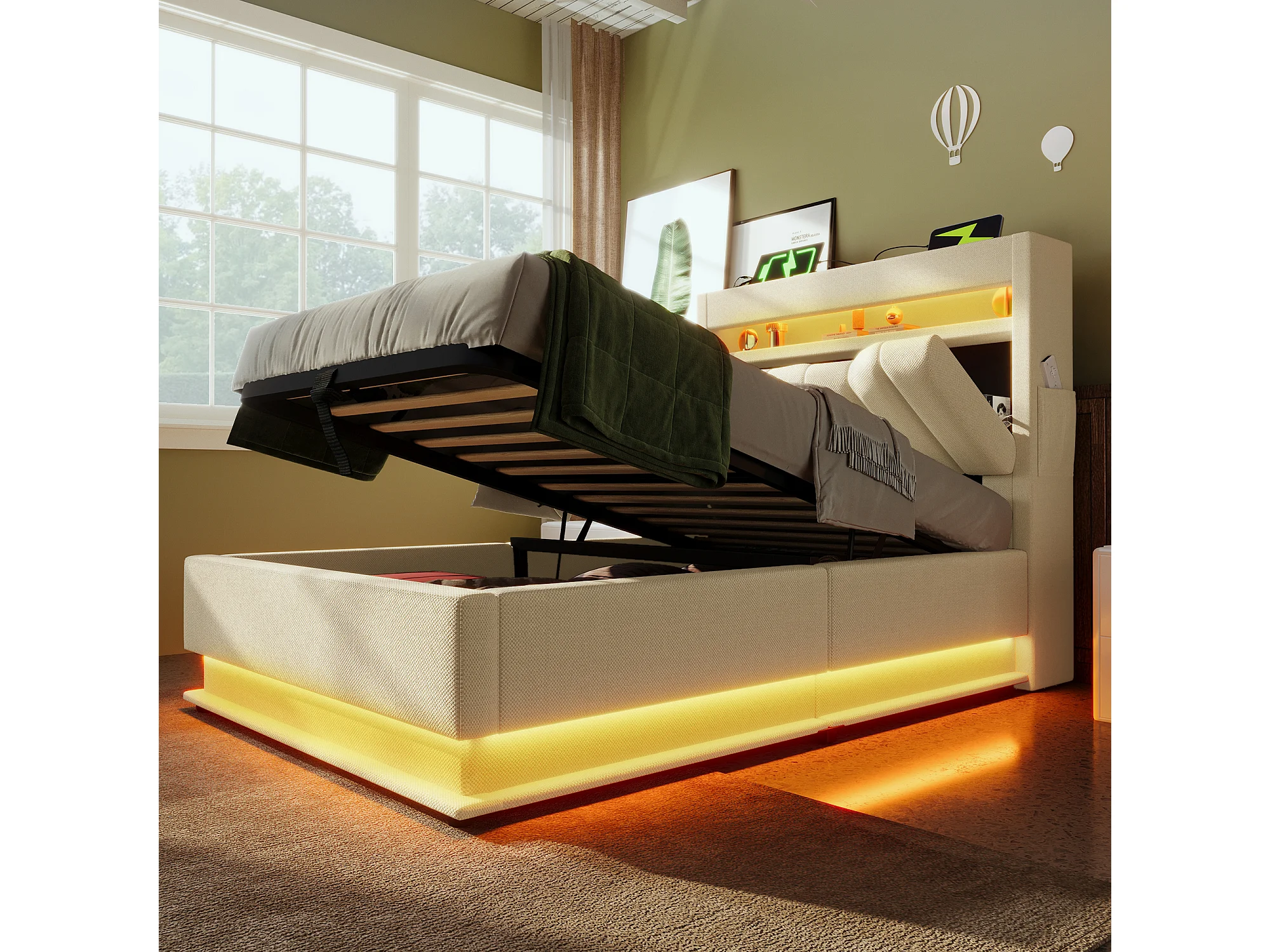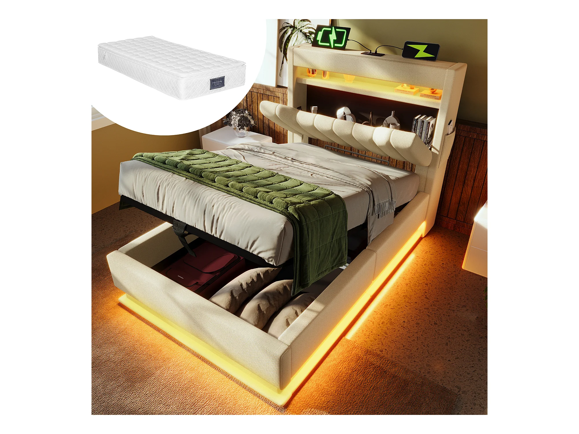 Lit coffre capitonné - 90 x 200 cm - tête de lit coffre avec USB et Type-C - avec Leds - avec matelas - lin - beige