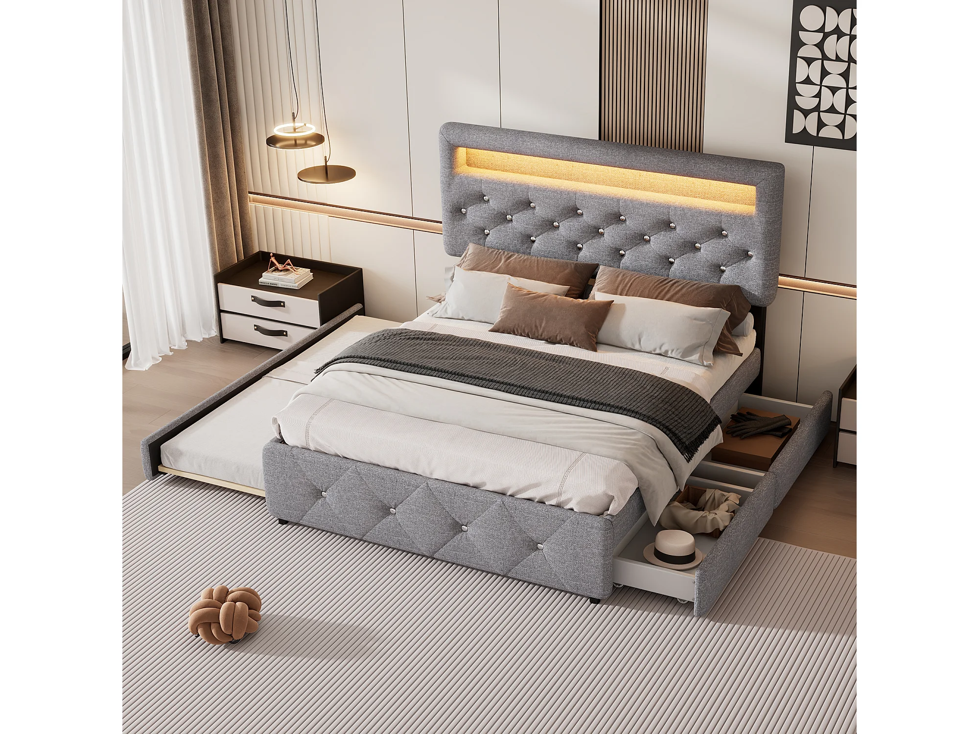 Lit coffre capitonné double - 140 x 200 cm - avec gigogne et 2 tiroirs - table de chevet lumineuse - Lin - gris