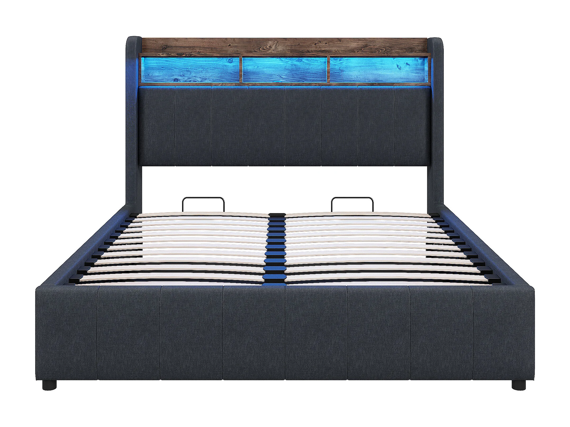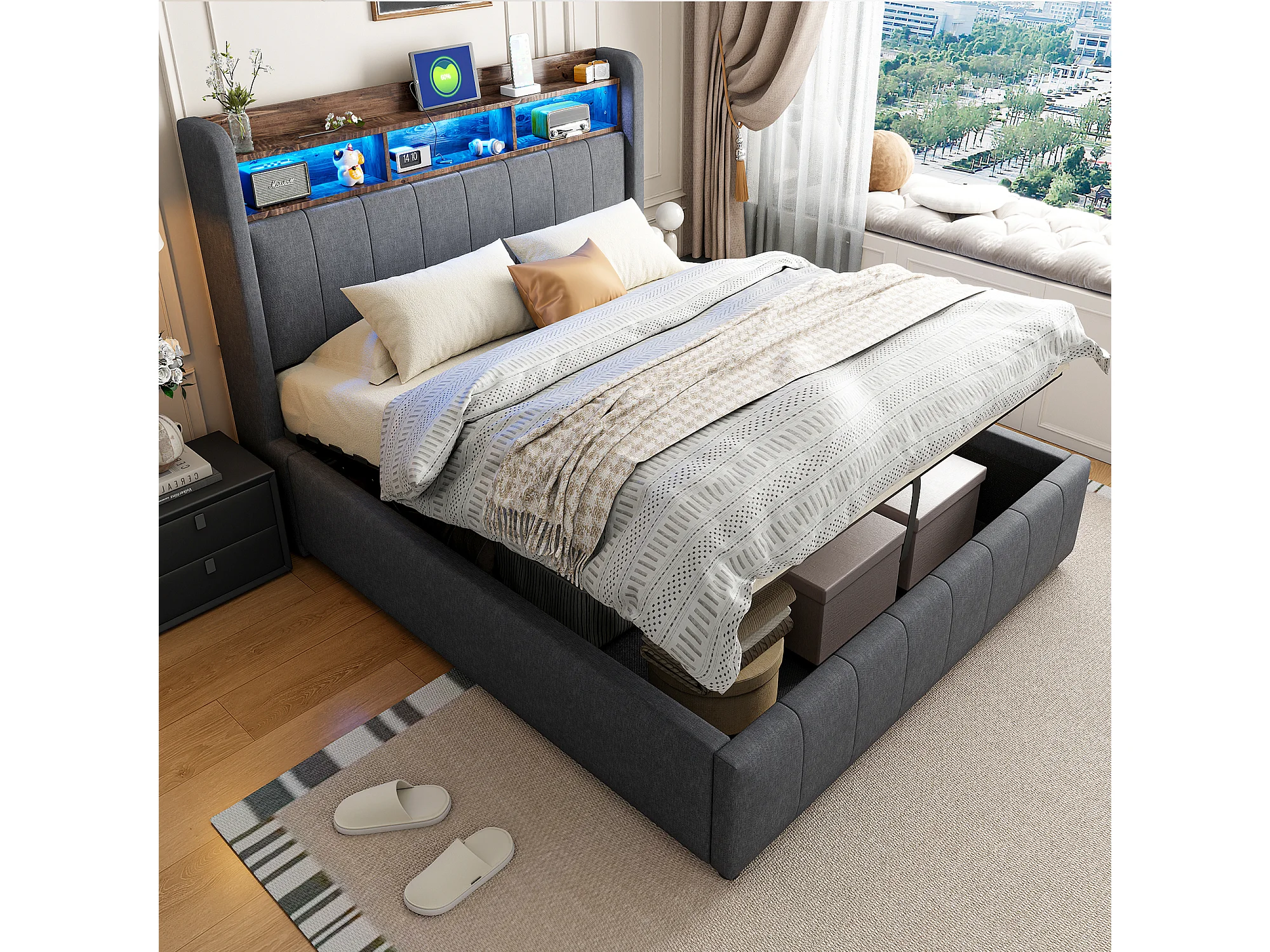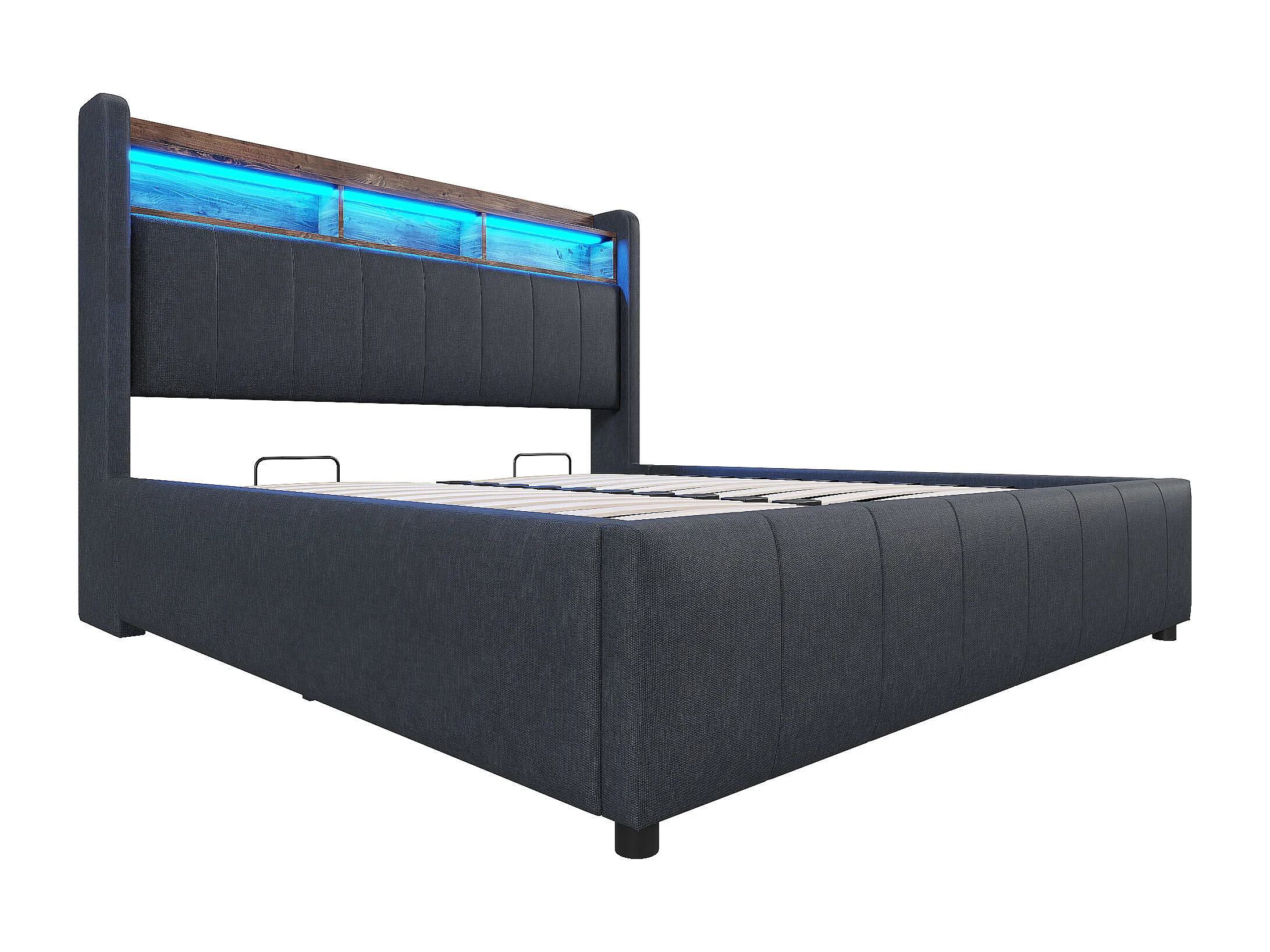Lit coffre de rangement capitonné en lin 140x200cm - avec LED + prises - Gris