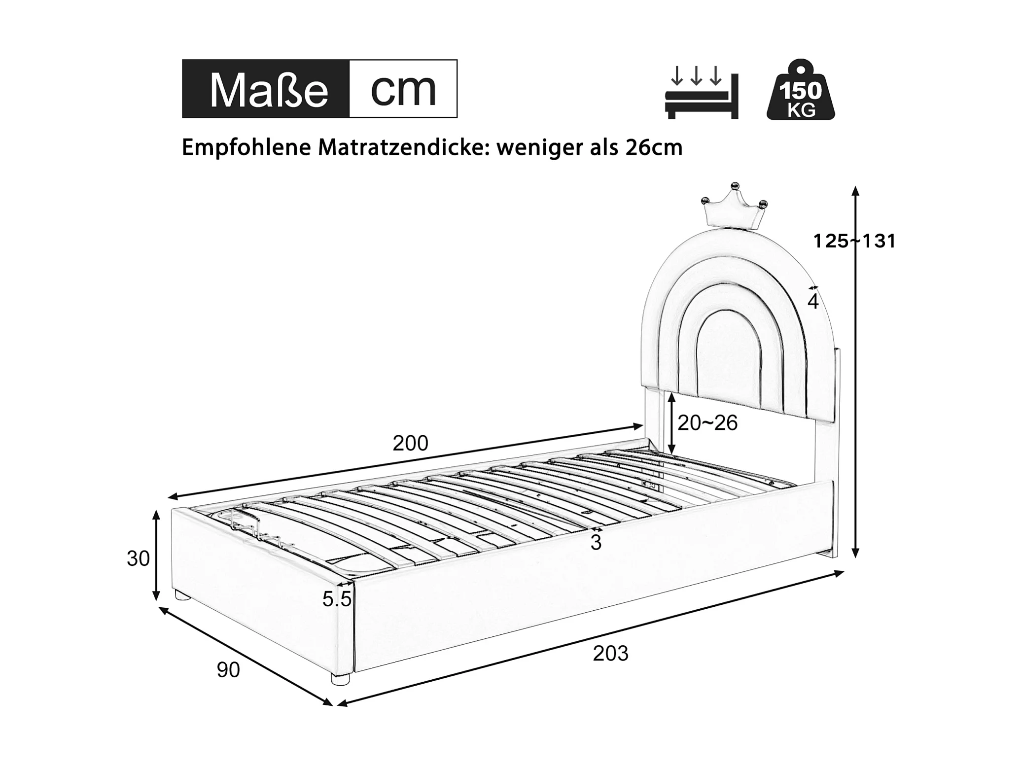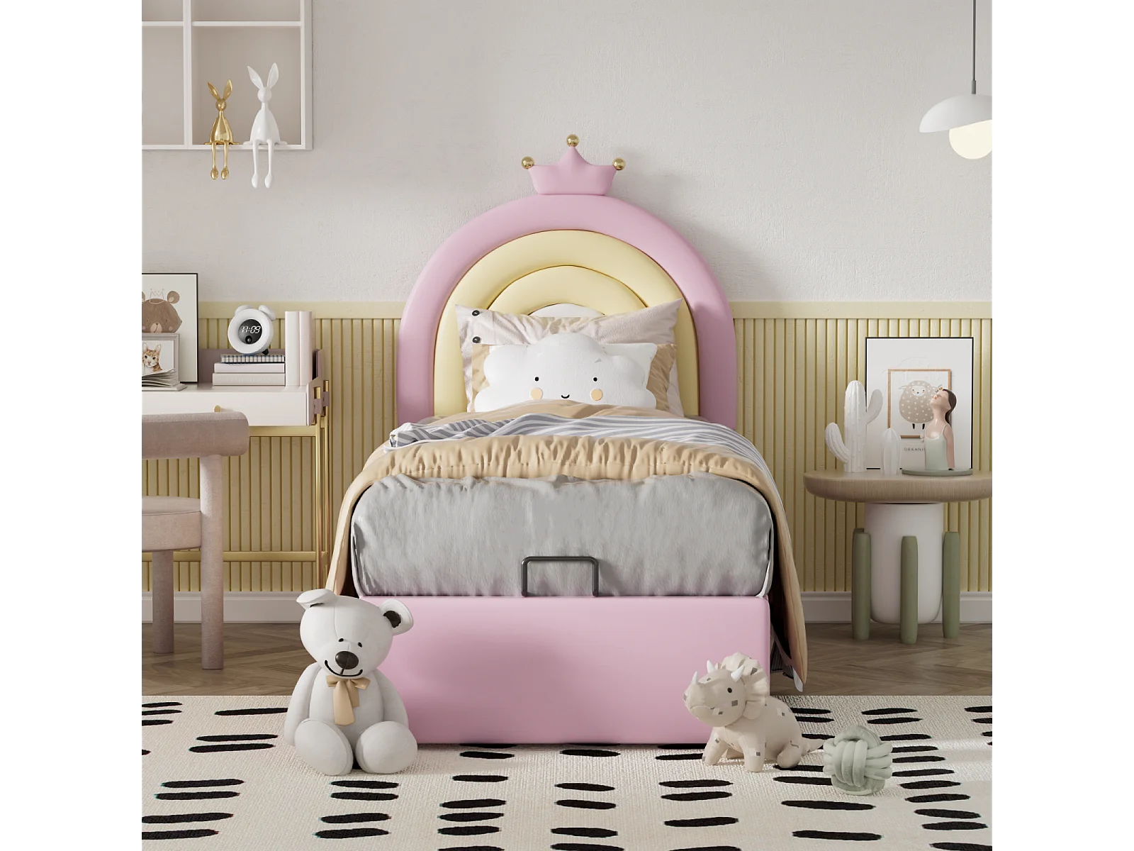 Lit coffre d'enfant, lit fille rembourré avec sommier à lattes et tête de lit beau réglable en hauteur, PU, rose, 90x200cm