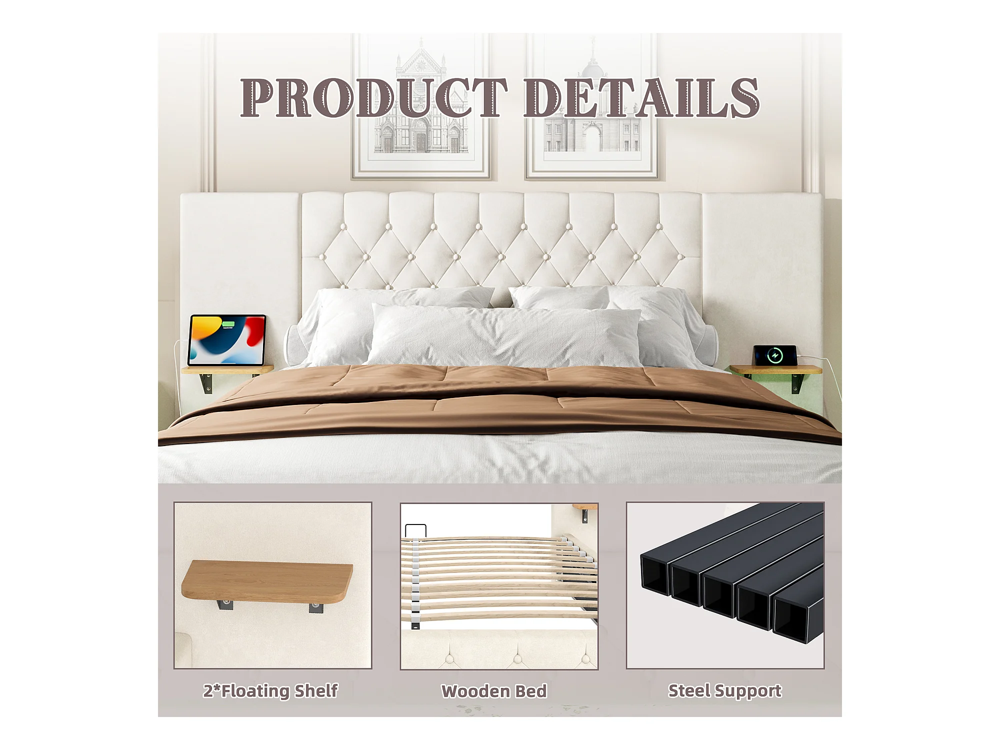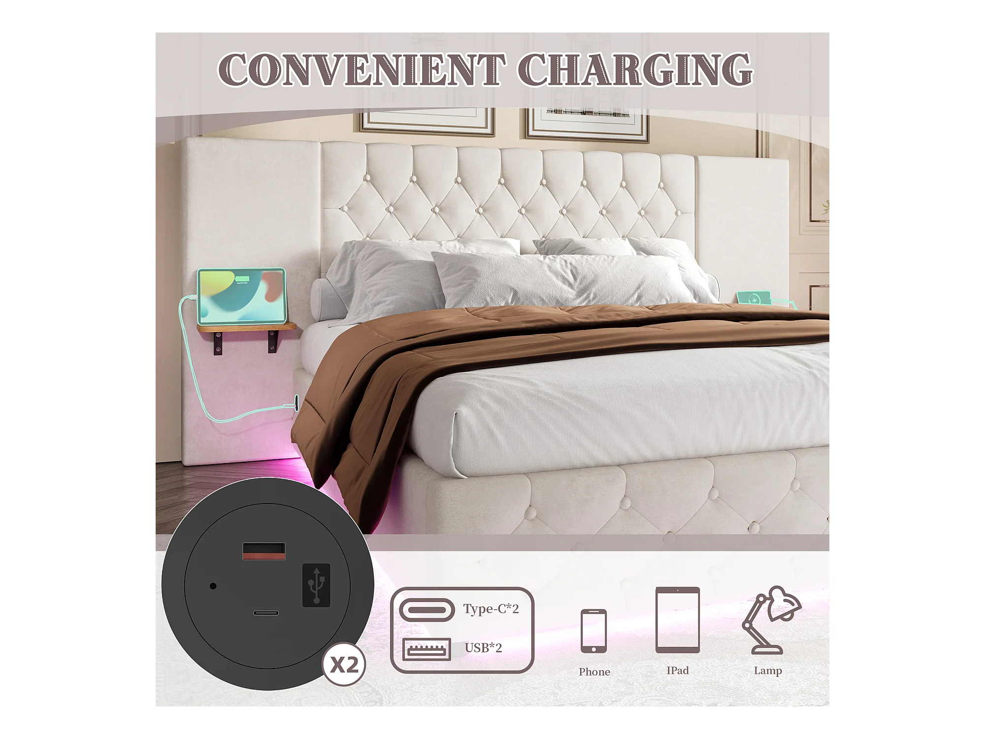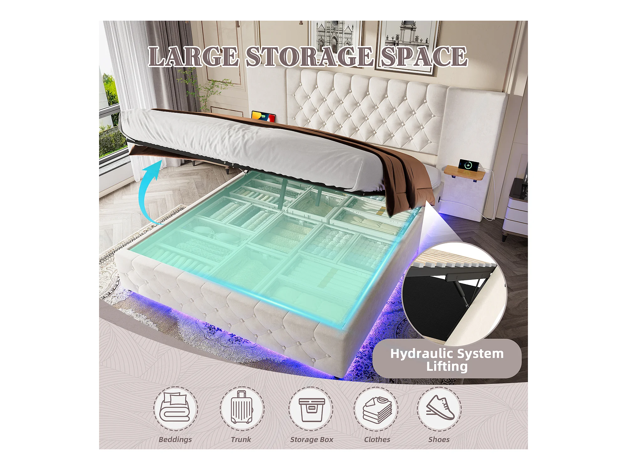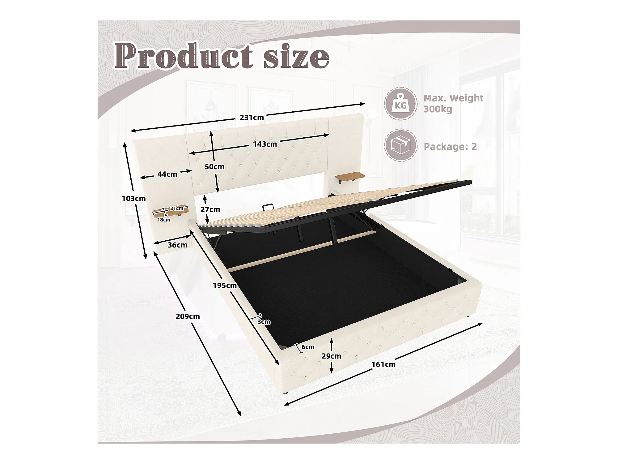 Lit Coffre 160×200 cm - Lit Rembourré en Velours Beige – Étagère Tête De Lit - LED/USB-C – Coffre Hydraulique – Style Contemporain