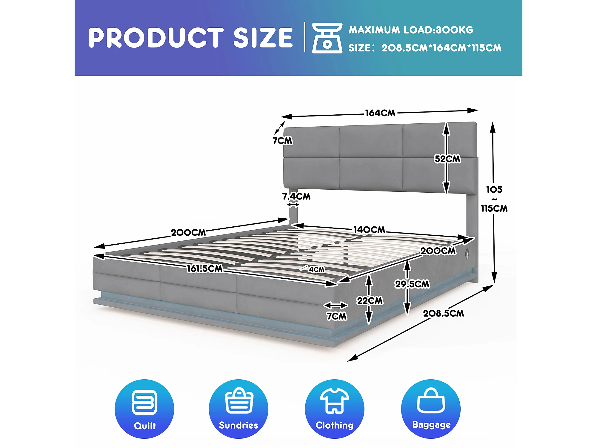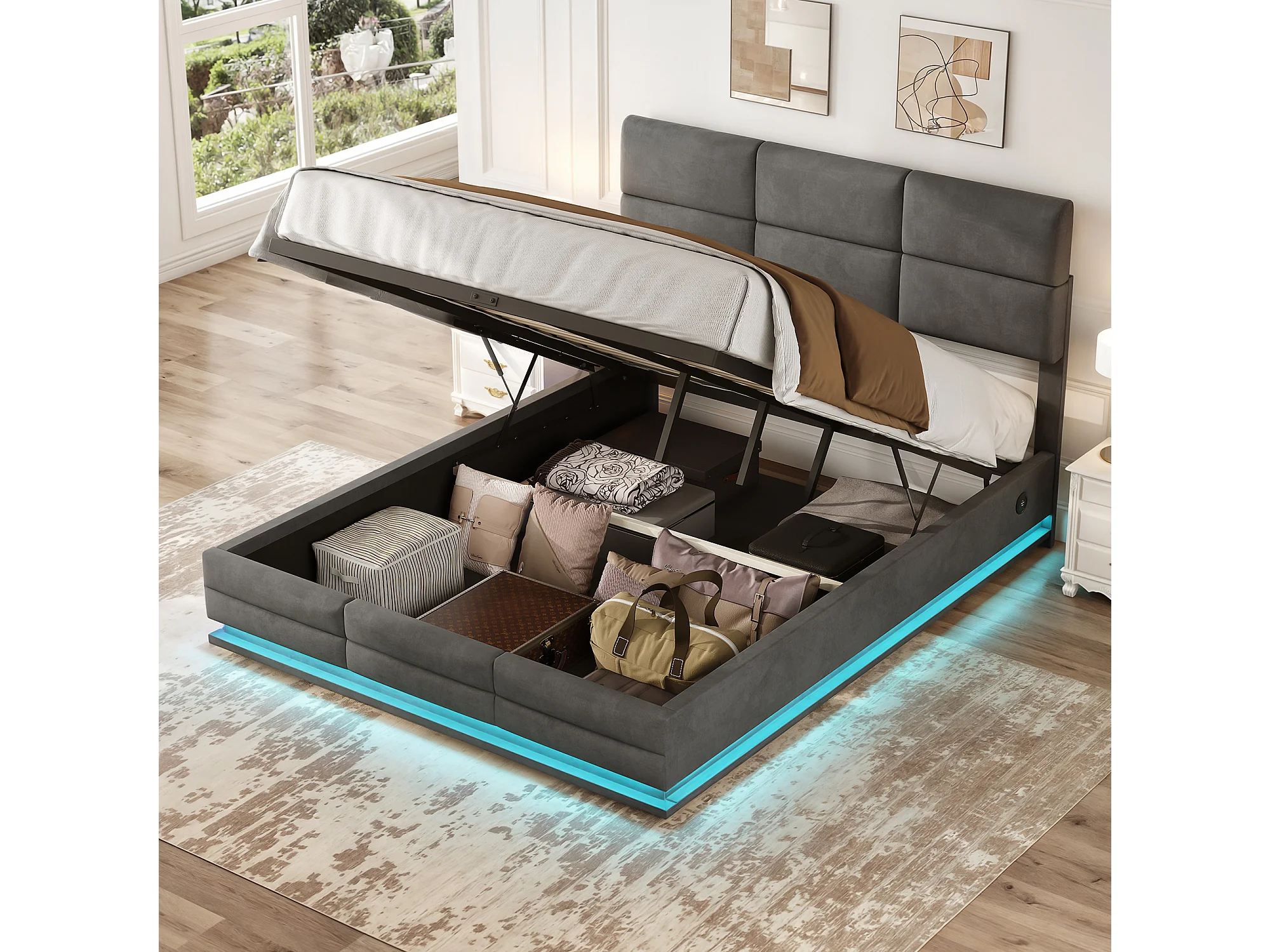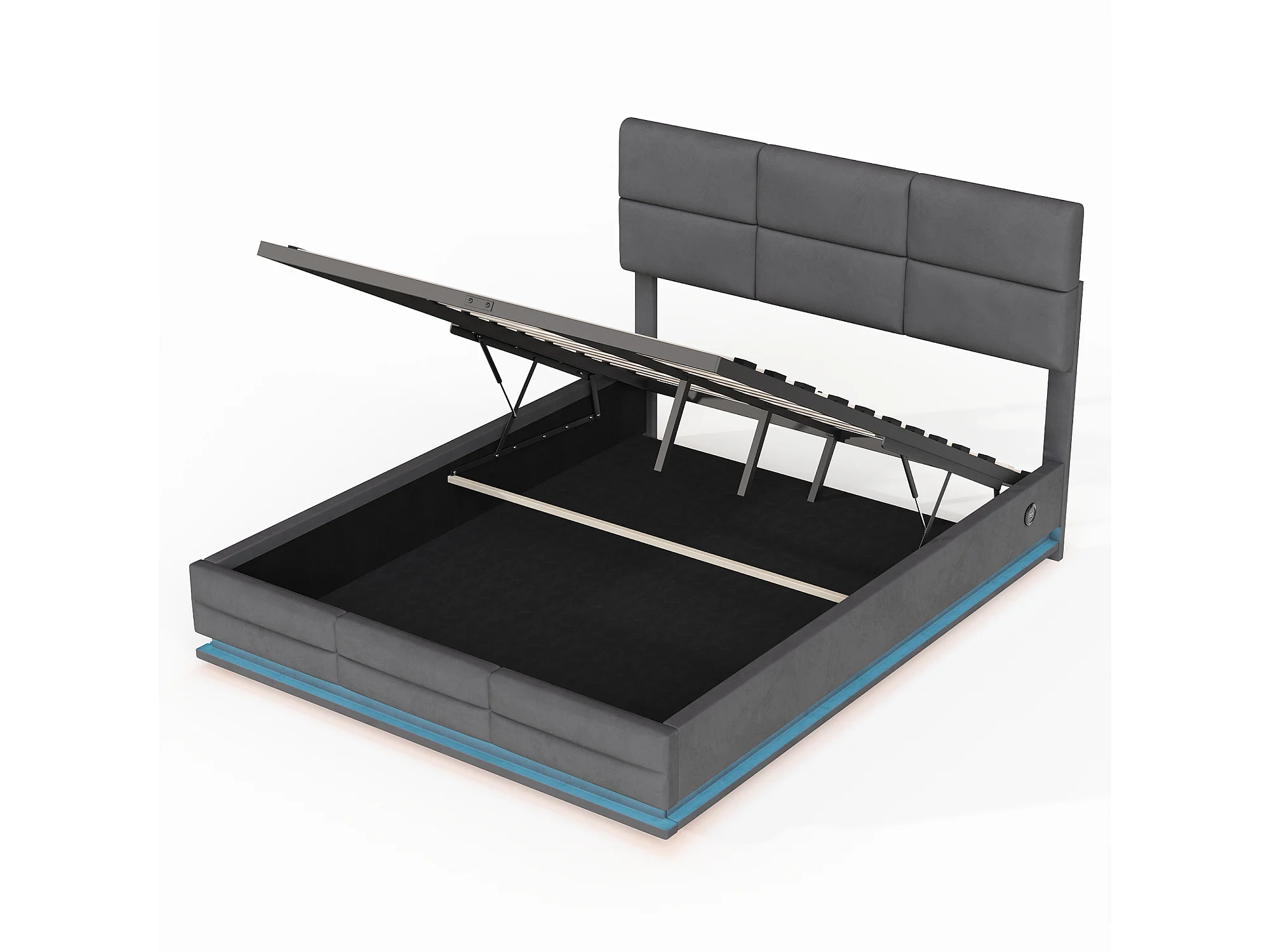 Lit coffre 160×200 cm - Lit rembourré en velours gris - avec tête de lit haute - LED et ports USB + Type‑C – Confort, style et praticité