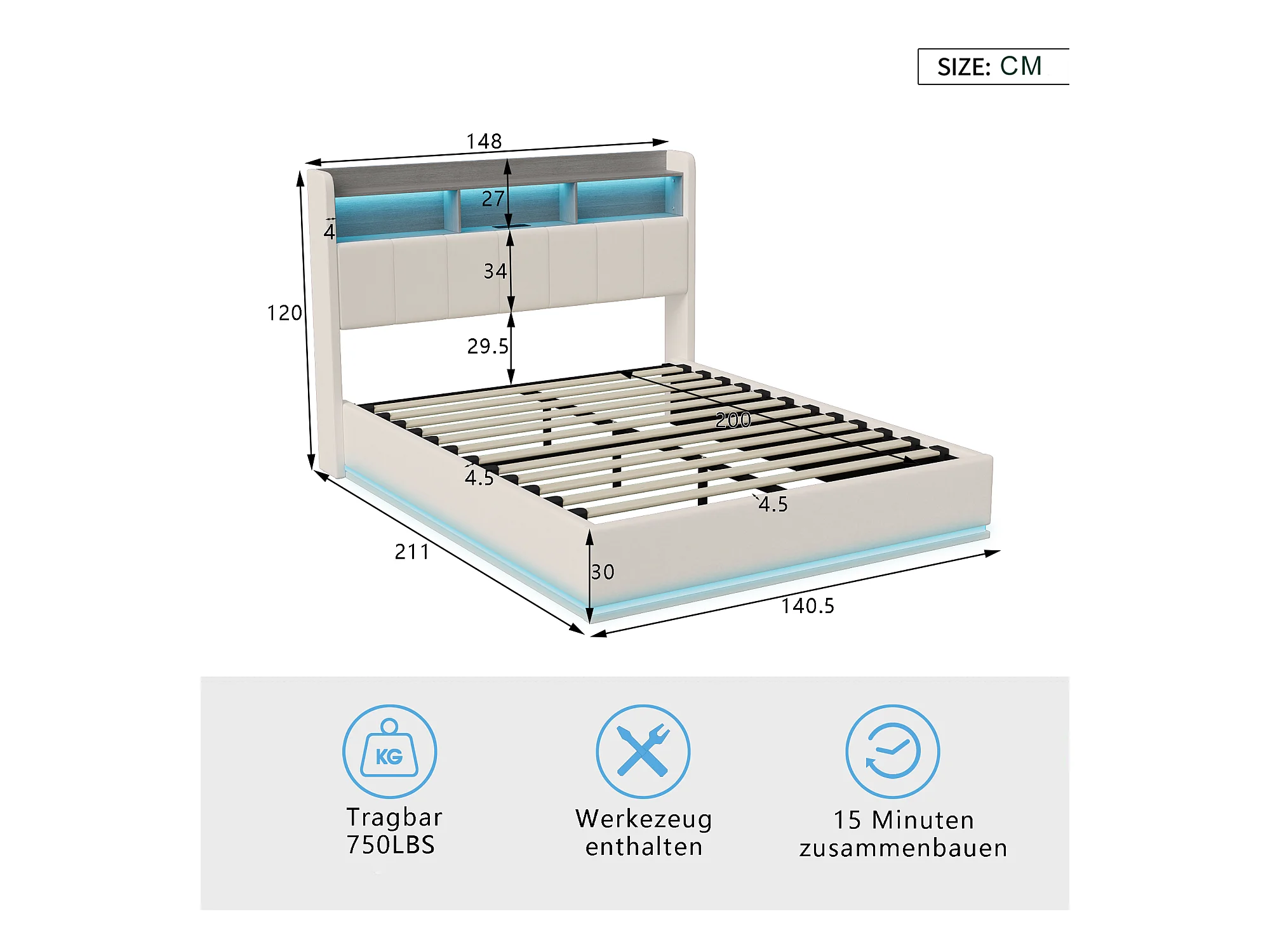 Lit double rembourré avec fonction de charge USB Type C Cadre de lit en métal 140×200cm