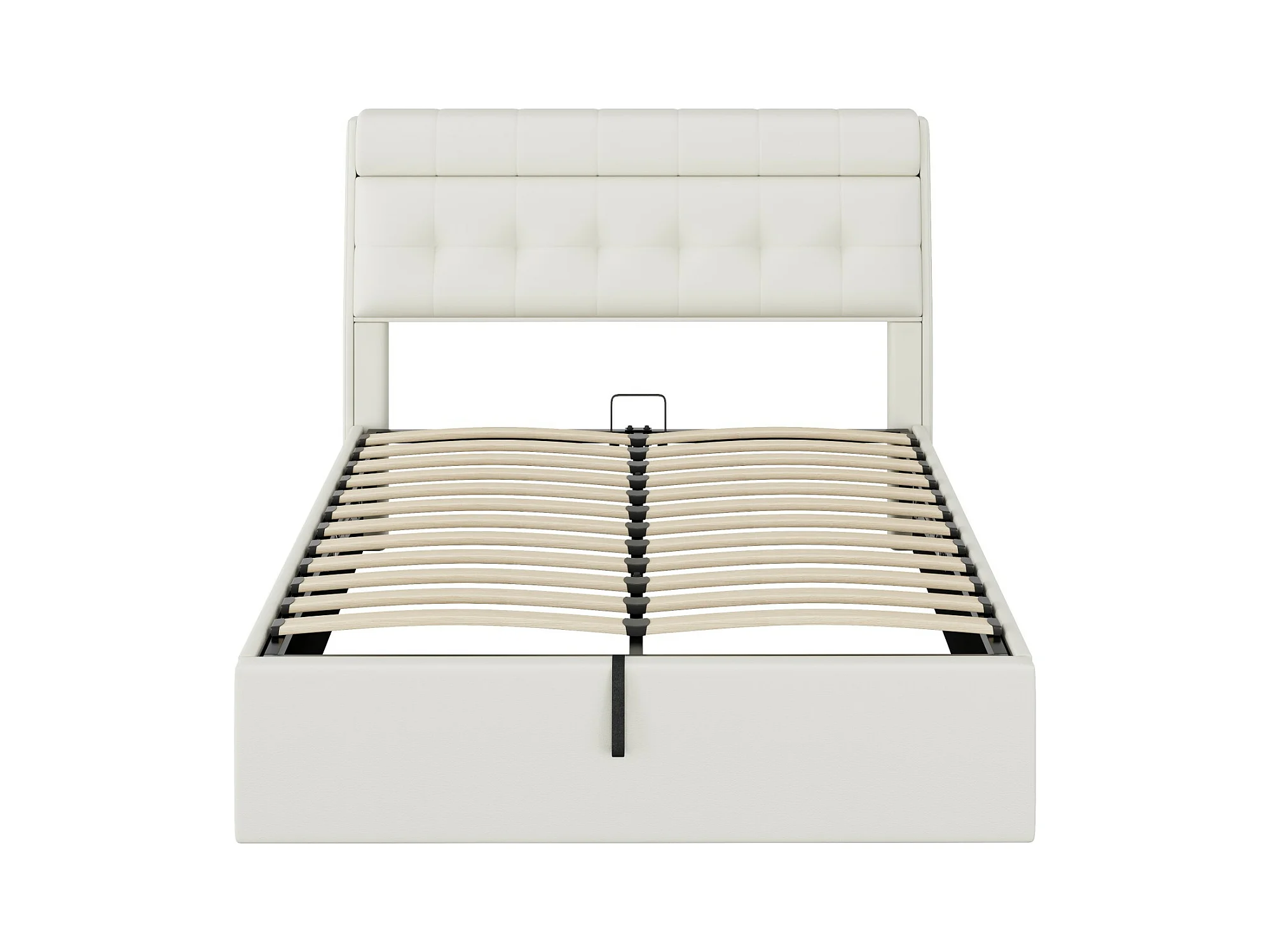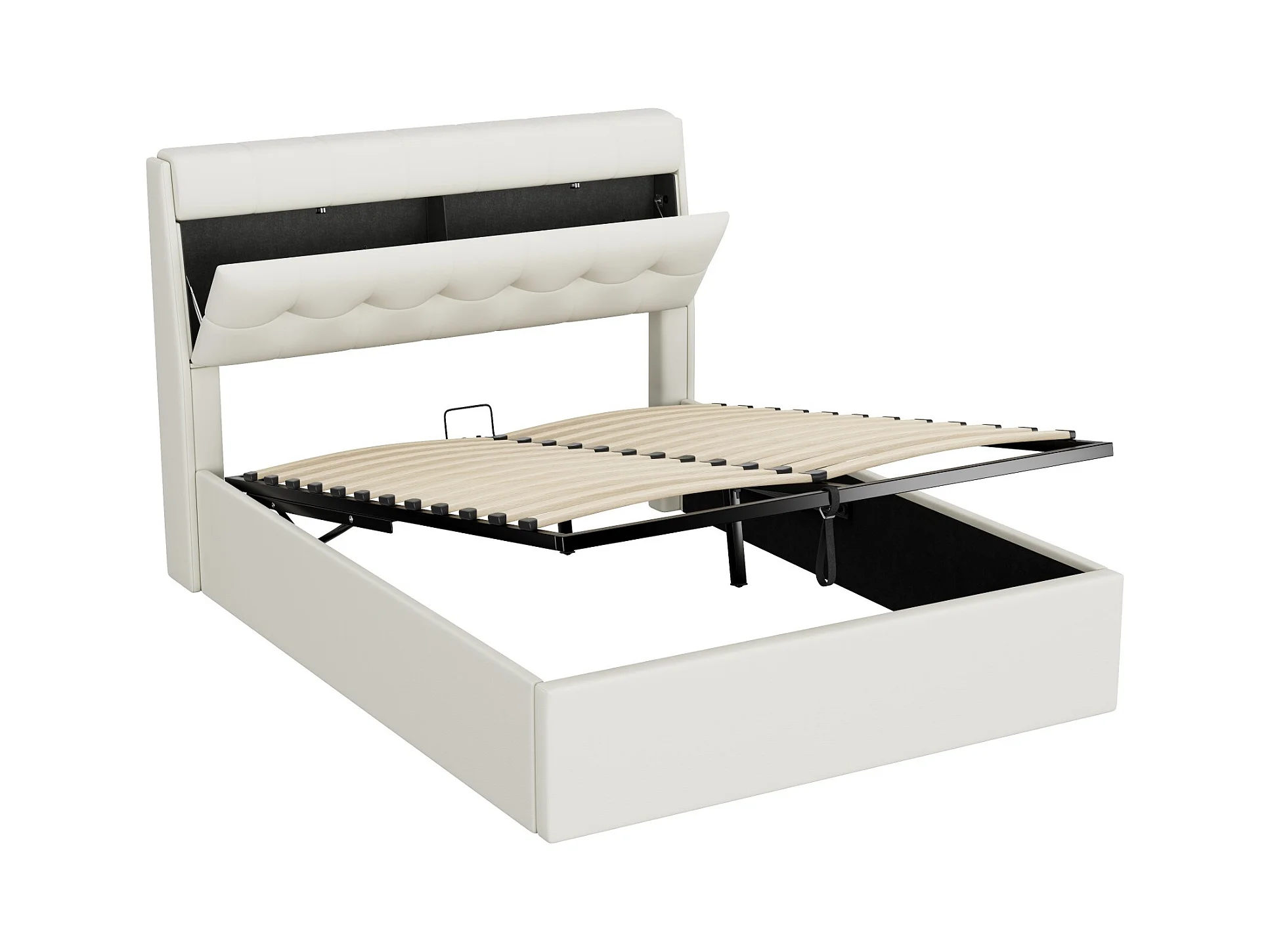 Lit coffre 140 x 190 cm avec tête de lit rangement - LEDs - Cuir PU - Blanc (sans matelas)