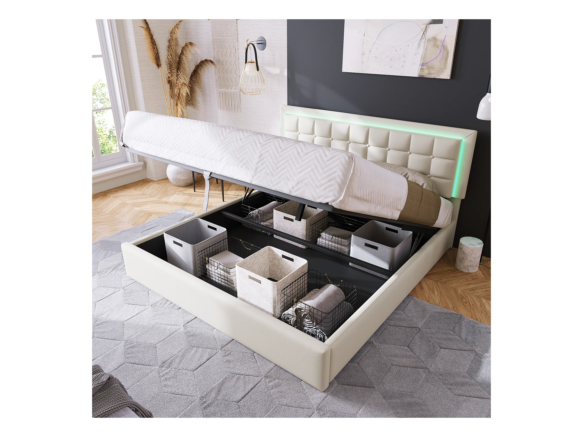 Lit coffre adulte 140x200 cm en lin beige avec USB Type-C, LED et sommier à lattes, sans matelas