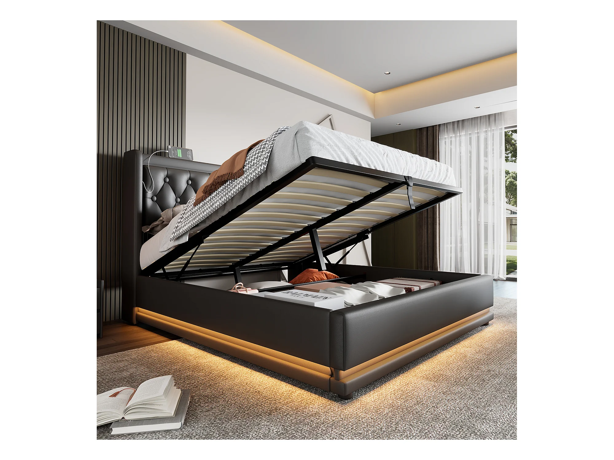Lit Coffre 140x200 Cm Avec USB Et Type-c,led,lit Capitonné Avec Rangement,hydraulique Lit, Pu